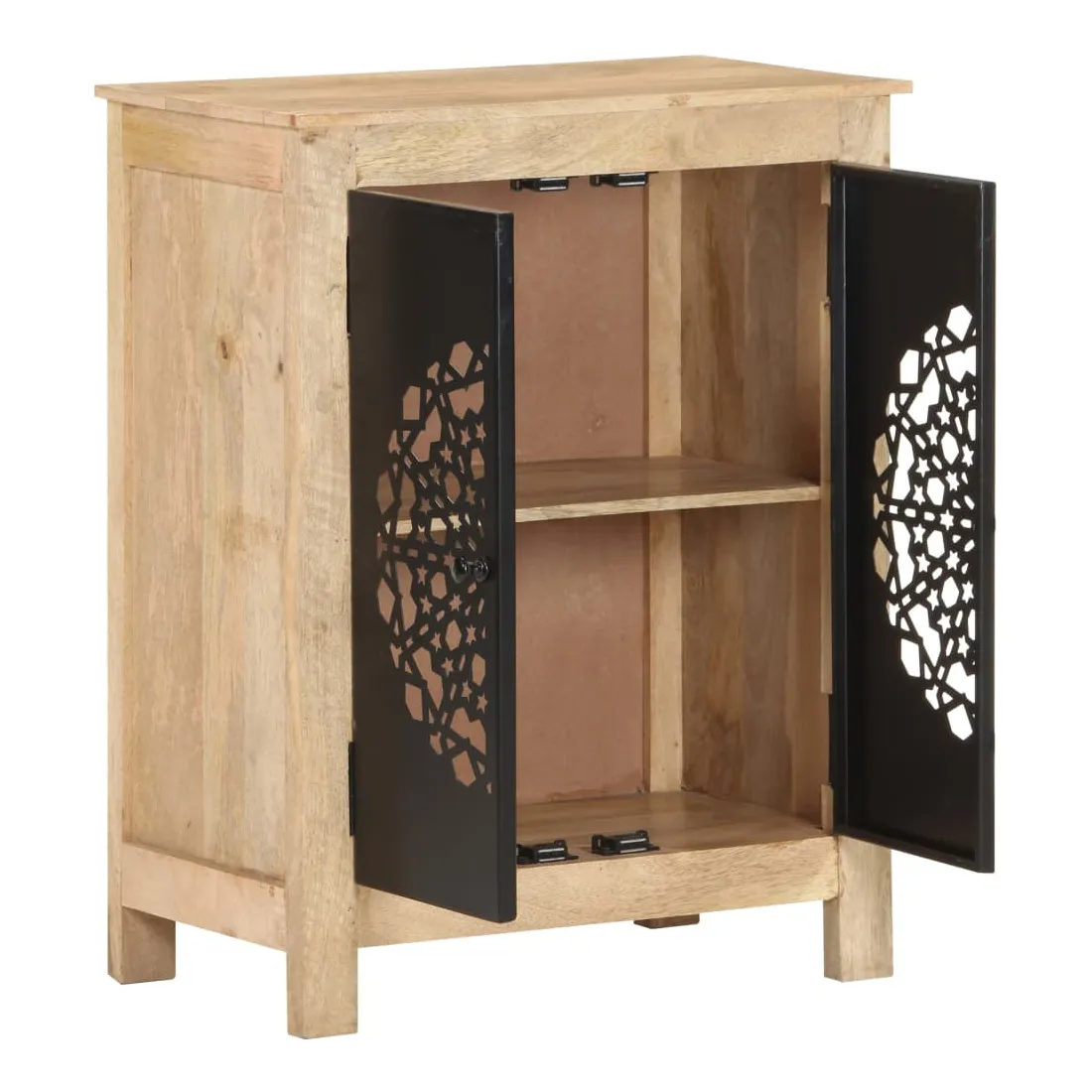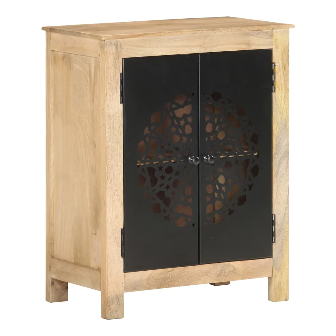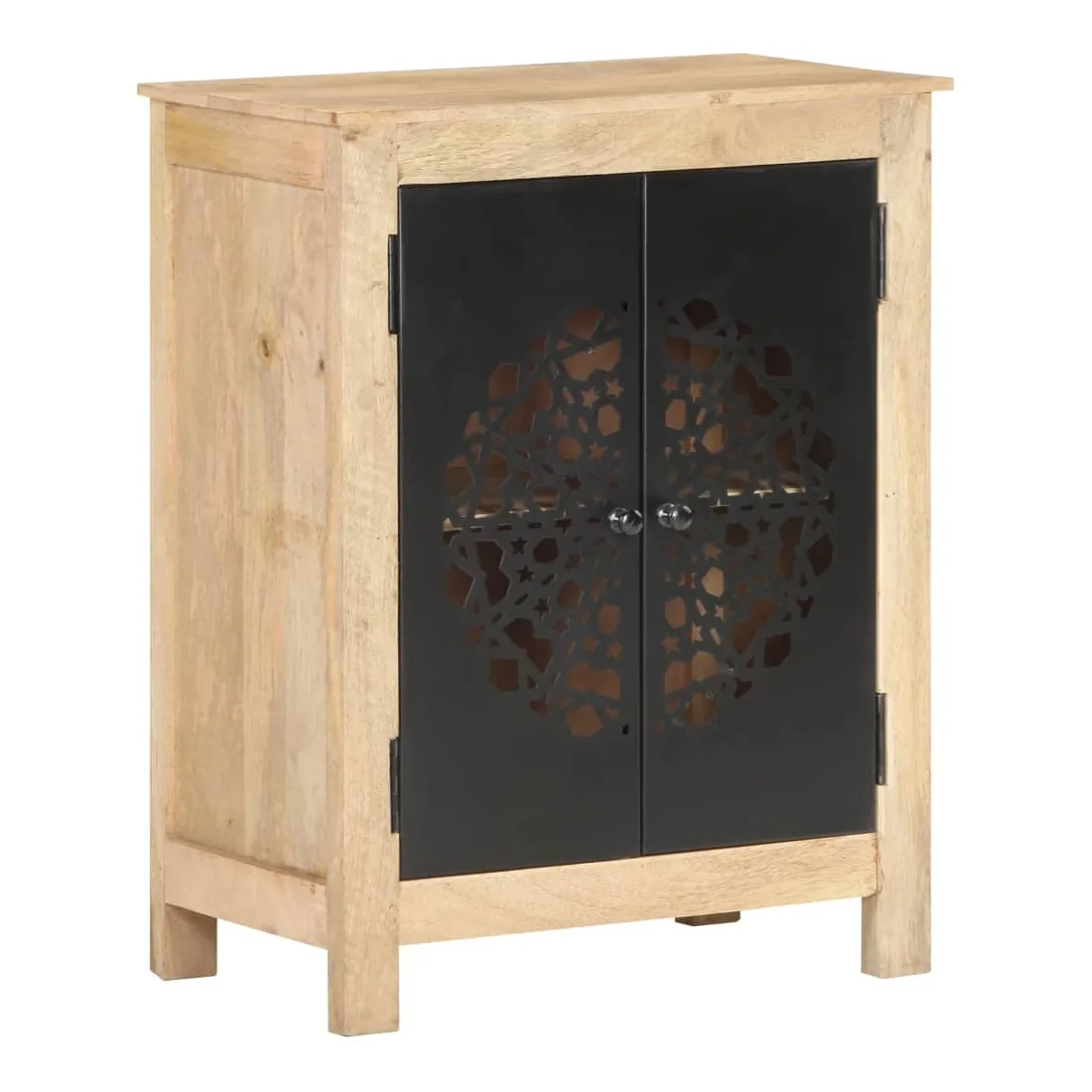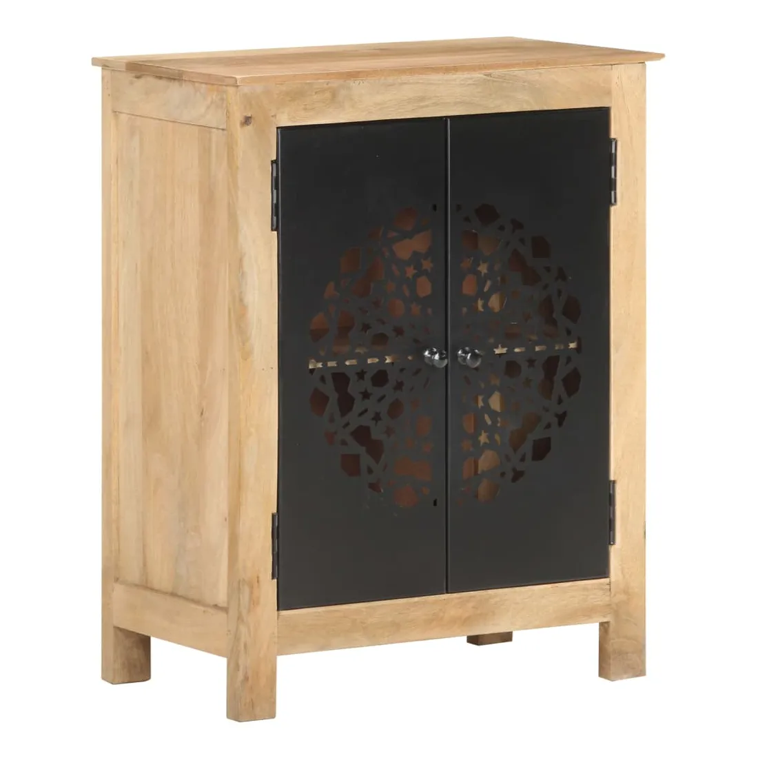 Ce buffet en bois est un supplément pratique et décoratif à votre salon ou à votre chambre à coucher. Cette armoire latérale est faite de bois de manguier massif, un bois dur tropical. Il a la force de soutenir le poids et de résister à l’usure du temps. De plus, l’artisanat exquis et les belles veines du bois font que chaque pièce soit légèrement différente l'une de l'autre. L’armoire dispose de 2 portes, offrant un grand espace de stockage pour stocker divers articles soigneusement organisés. Son dessus en bois robuste est idéal pour placer des objets décoratifs tels que des vases et des cadres photo. Ses belles et robustes portes en acier enduit de poudre rendent ce meuble de rangement élégant et accrocheur. Remarque importante : les couleurs varient d'une pièce à l'autre, rendant chaque pièce unique. La livraison est aléatoire, garantissant l'exclusivité et l'individualité de votre produit.