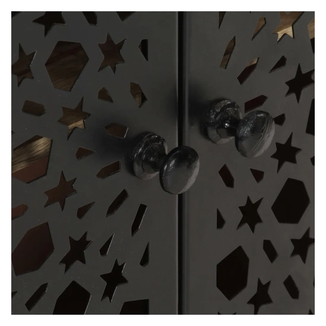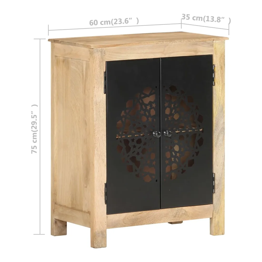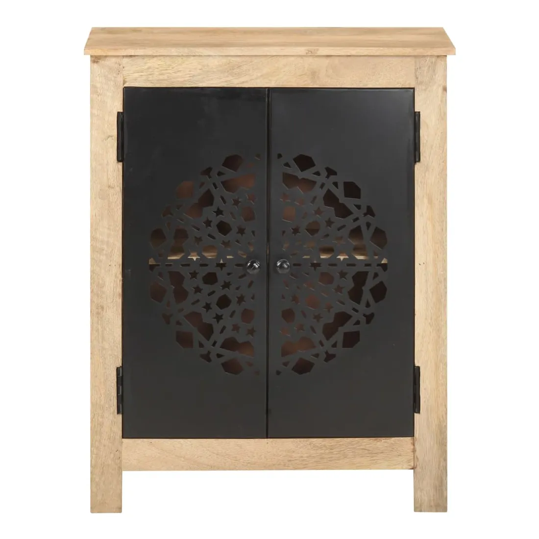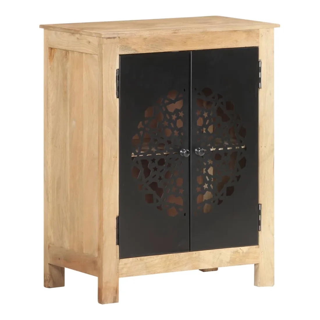Ce buffet en bois est un supplément pratique et décoratif à votre salon ou à votre chambre à coucher. Cette armoire latérale est faite de bois de manguier massif, un bois dur tropical. Il a la force de soutenir le poids et de résister à l’usure du temps. De plus, l’artisanat exquis et les belles veines du bois font que chaque pièce soit légèrement différente l'une de l'autre. L’armoire dispose de 2 portes, offrant un grand espace de stockage pour stocker divers articles soigneusement organisés. Son dessus en bois robuste est idéal pour placer des objets décoratifs tels que des vases et des cadres photo. Ses belles et robustes portes en acier enduit de poudre rendent ce meuble de rangement élégant et accrocheur. Remarque importante : les couleurs varient d'une pièce à l'autre, rendant chaque pièce unique. La livraison est aléatoire, garantissant l'exclusivité et l'individualité de votre produit.