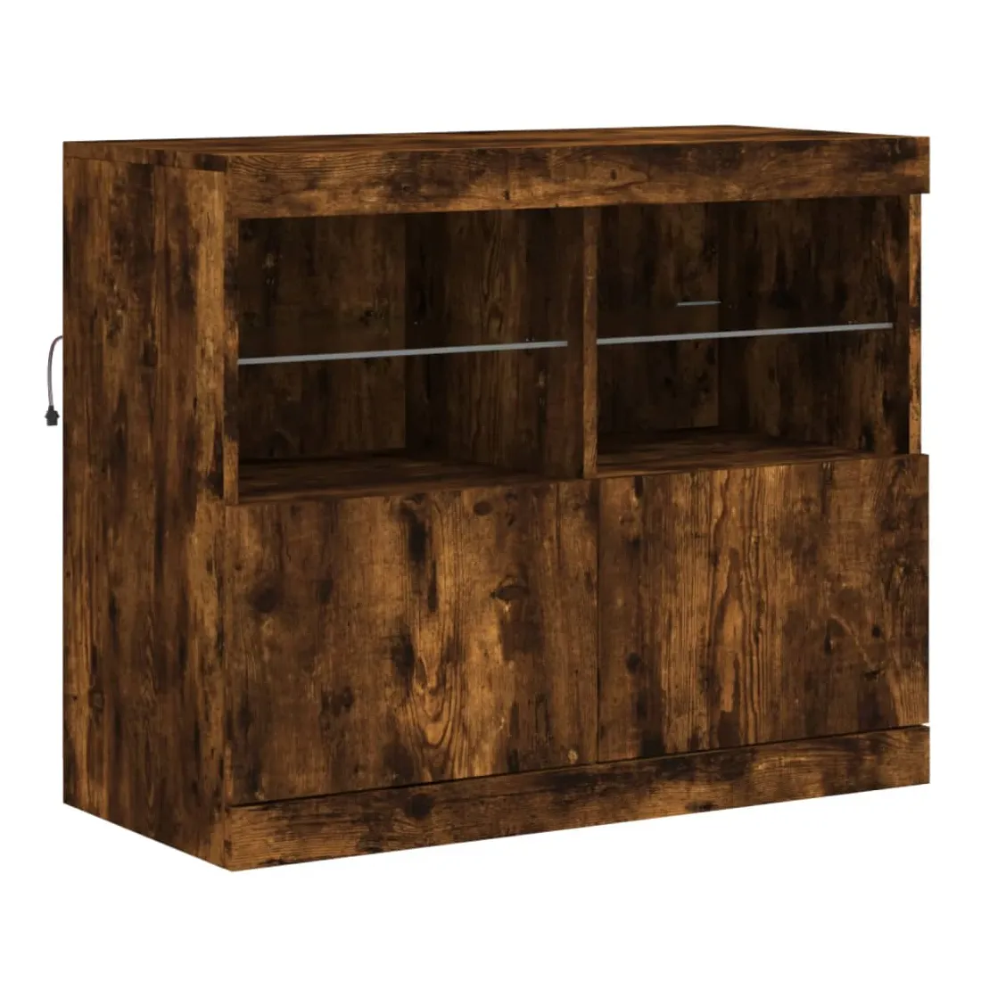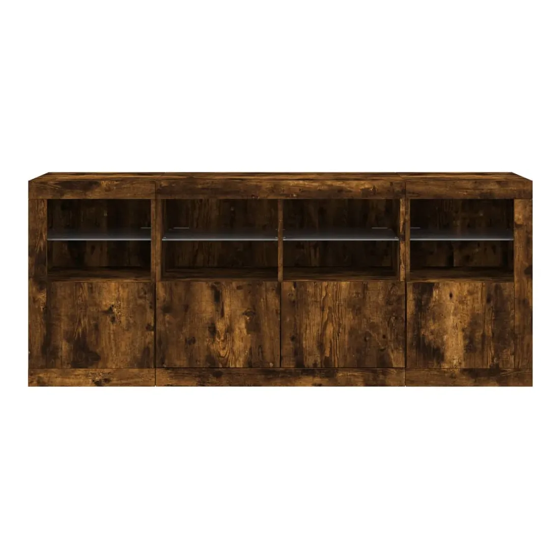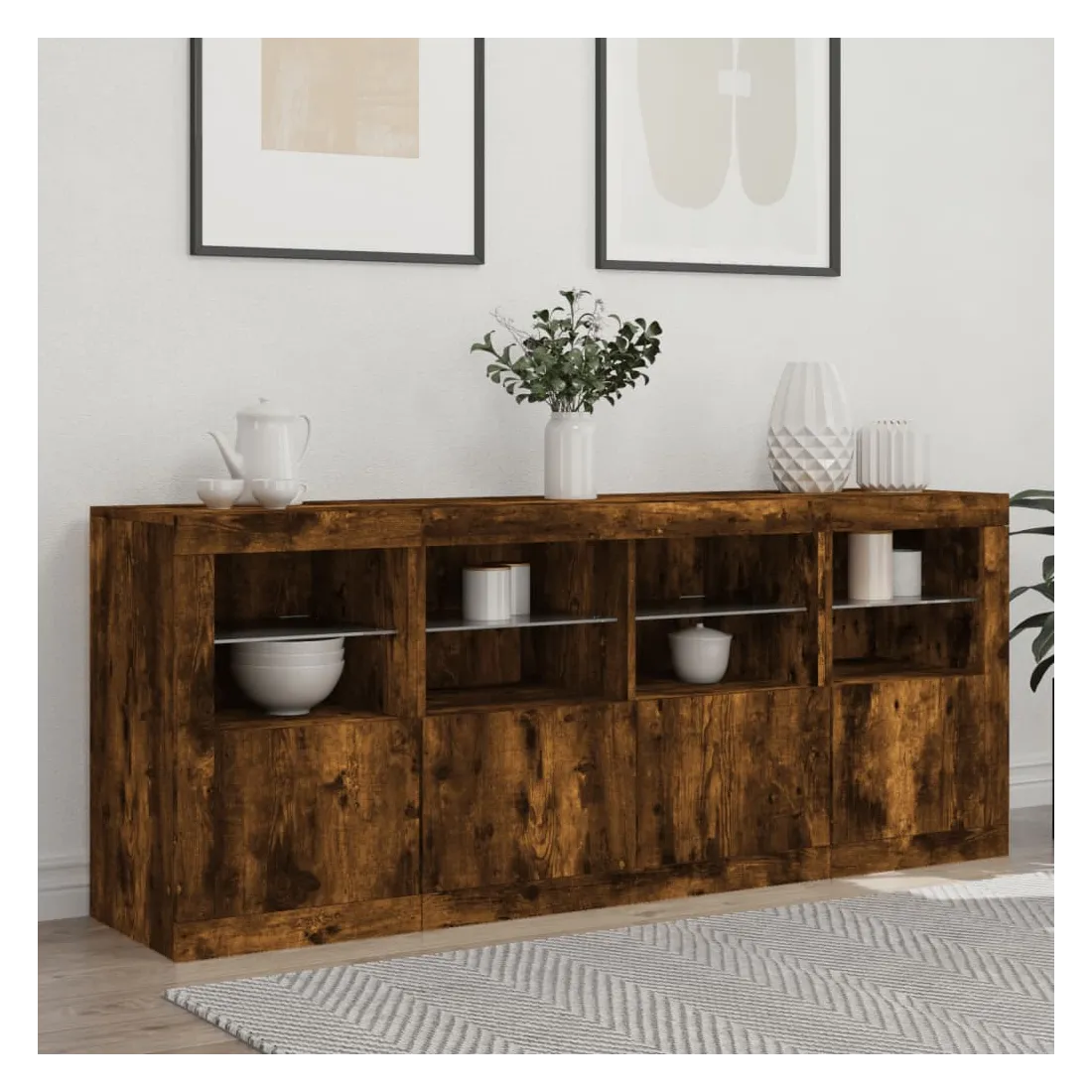 Décorez votre pièce avec ce buffet moderne avec éclairage LED, il s'harmonise facilement avec les meubles de tout style de votre maison. Matériau durable : le bois d'ingénierie est d'une qualité exceptionnelle avec une surface lisse et présente également résistance, stabilité et résistance à l'humidité.Lumières LED RVB : le buffet est équipé de lumières LED RVB vibrantes. Avec divers menus personnalisables, vous pouvez changer sans effort la couleur des lumières et même les régler automatiquement. Ces lumières LED renforcent non seulement l'aspect contemporain du buffet, mais aussi son attrait pour la mode.Grand espace de rangement : l'armoire de rangement offre beaucoup d'espace pour garder vos objets du quotidien bien rangés et facilement accessibles.Fonction d'exposition : la partie supérieure robuste de l'armoire d'entrée est idéale pour exposer des objets décoratifs, des cadres photo ou des plantes en pot.Porte pratiques : gardez vos essentiels à l'abri de la poussière en les cachant derrière les portes de l'armoire latérale. Bon à savoir :Ce produit est doté d'un connecteur USB qui nécessite une source d'alimentation USB de 5V certifiée (non incluse). Attention :Pour éviter qu'il ne soit renversé, ce produit doit être utilisé avec le dispositif de fixation au mur fourni.