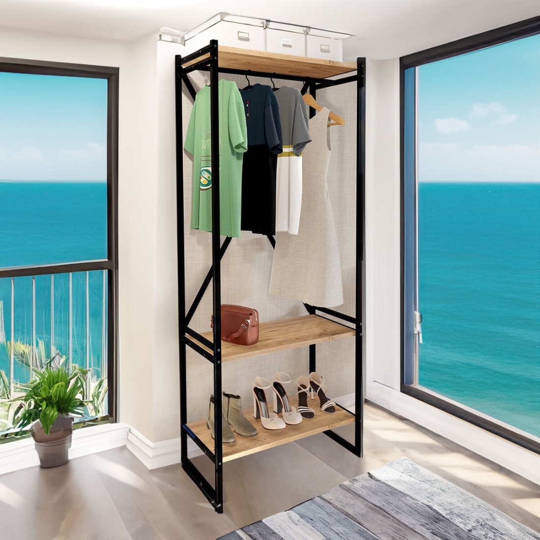 Armario Alexandra House Living Bert_AR0360 Negro Roble Metal Madera MDP 66 x 160 x 34 cm industrial 3 Estantes
