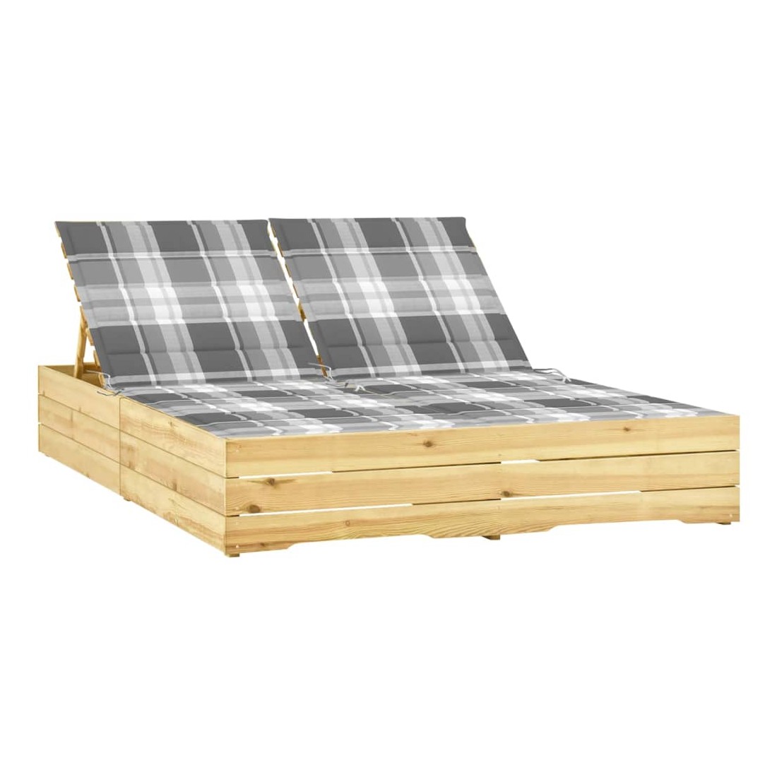Cette chaise longue double en bois avec coussin combine style et fonctionnalité et ajoute une touche de charme rustique à votre espace de vie extérieur. Fabriqué en bois de pin imprégné, le transat pour 2 personnes est résistant aux intempéries, très durable et facile à nettoyer avec un chiffon humide. Le dossier est réglable afin que vous puissiez trouver la position la plus confortable. De plus, le coussin inclus est plus qu’un supplément pratique ; il a également une fonction décorative. Remarque : afin de prolonger la durée de vie des meubles d'extérieur, nous vous recommandons de les protéger avec une housse imperméable.