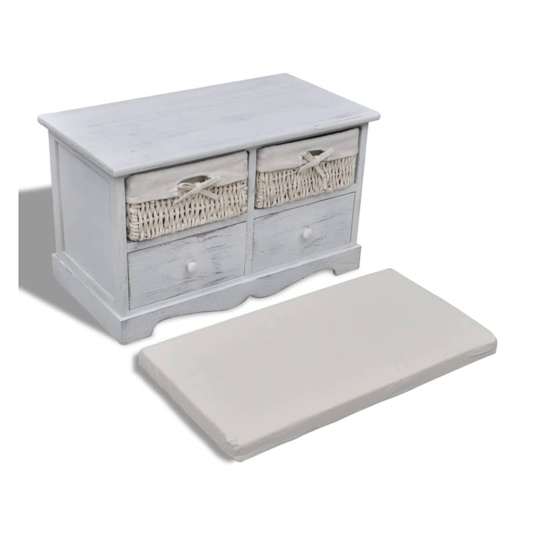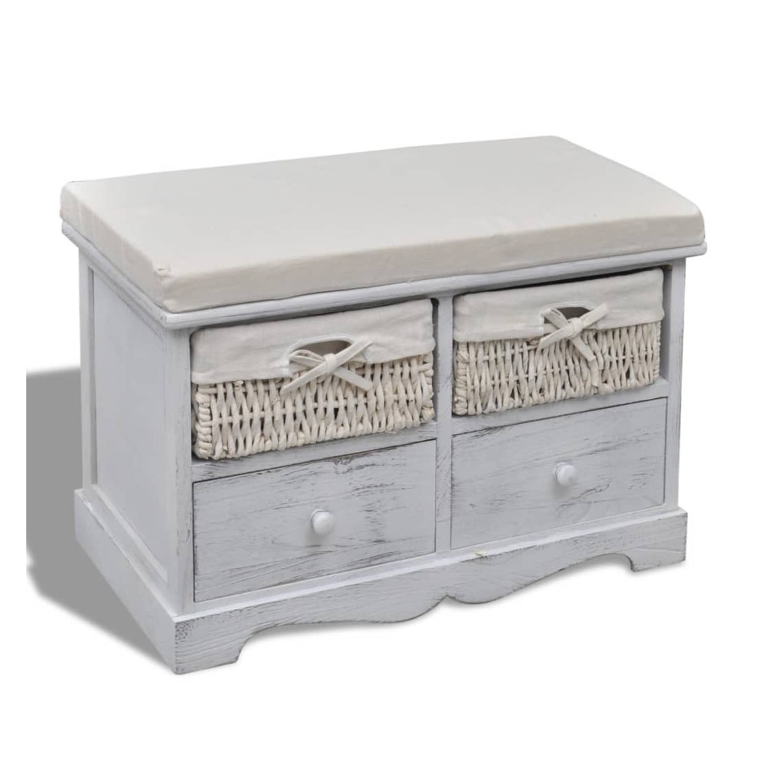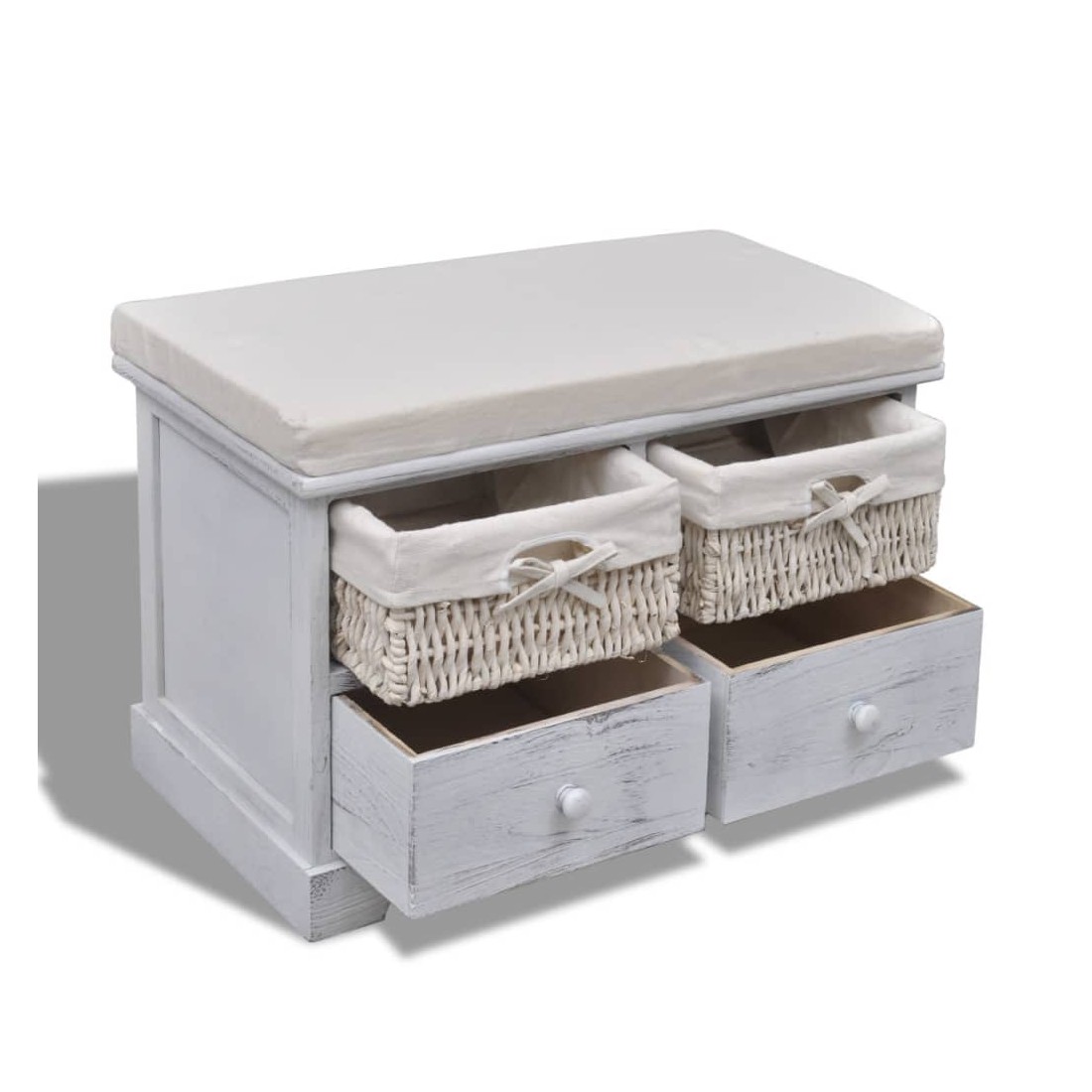 Ce banc de rangement en bois de haute qualité présente un design simple mais élégant. Il stocke non seulement vos affaires mais améliore également le décor de votre pièce. Livré avec deux paniers tissés et deux tiroirs en bois, ce banc de rangement durable vous offre beaucoup d'espace pour ranger vos objets de valeur, tout en apportant un style champêtre à votre pièce. Un coussin de siège supérieur offre un endroit confortable pour vous asseoir. Il sera parfait sur votre véranda, dans votre vestiaire, chambre à coucher et autres pièces que vous aimez.