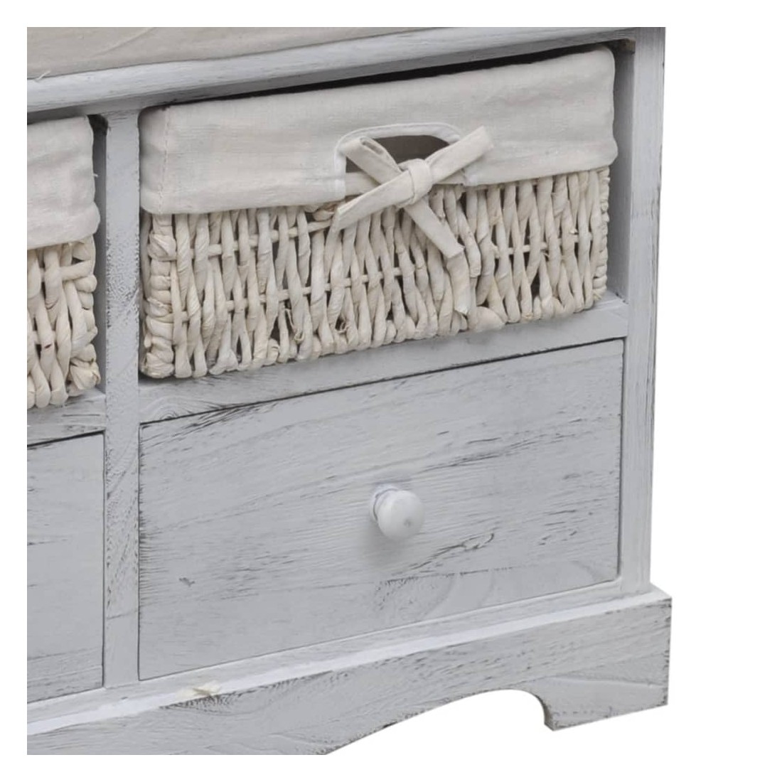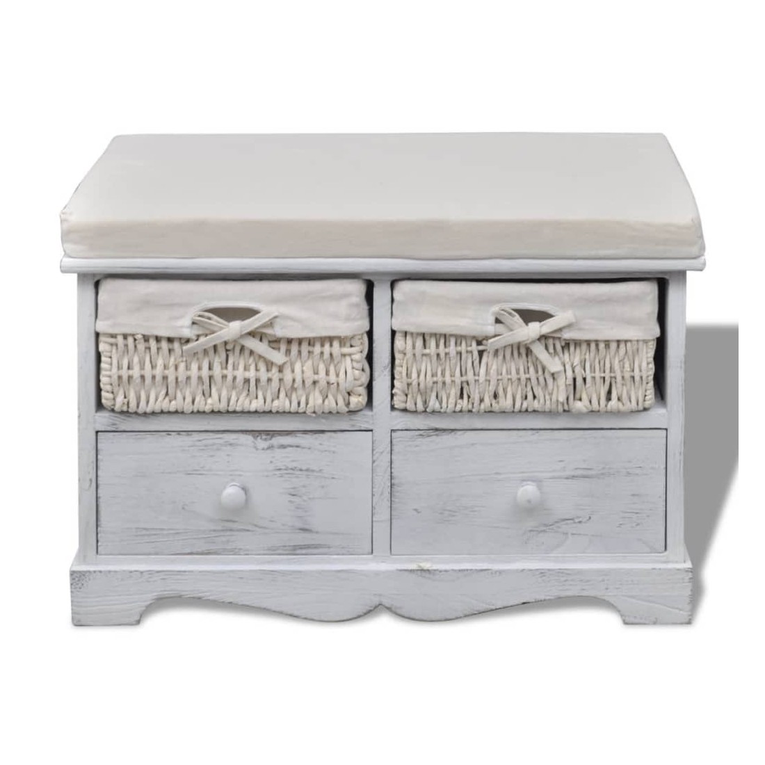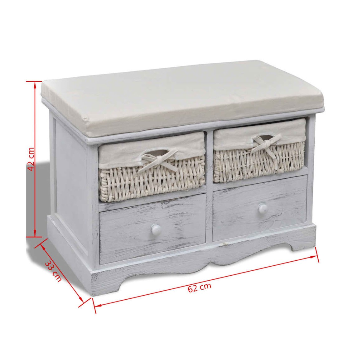 Ce banc de rangement en bois de haute qualité présente un design simple mais élégant. Il stocke non seulement vos affaires mais améliore également le décor de votre pièce. Livré avec deux paniers tissés et deux tiroirs en bois, ce banc de rangement durable vous offre beaucoup d'espace pour ranger vos objets de valeur, tout en apportant un style champêtre à votre pièce. Un coussin de siège supérieur offre un endroit confortable pour vous asseoir. Il sera parfait sur votre véranda, dans votre vestiaire, chambre à coucher et autres pièces que vous aimez.