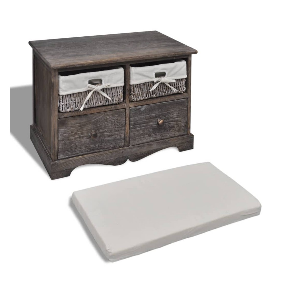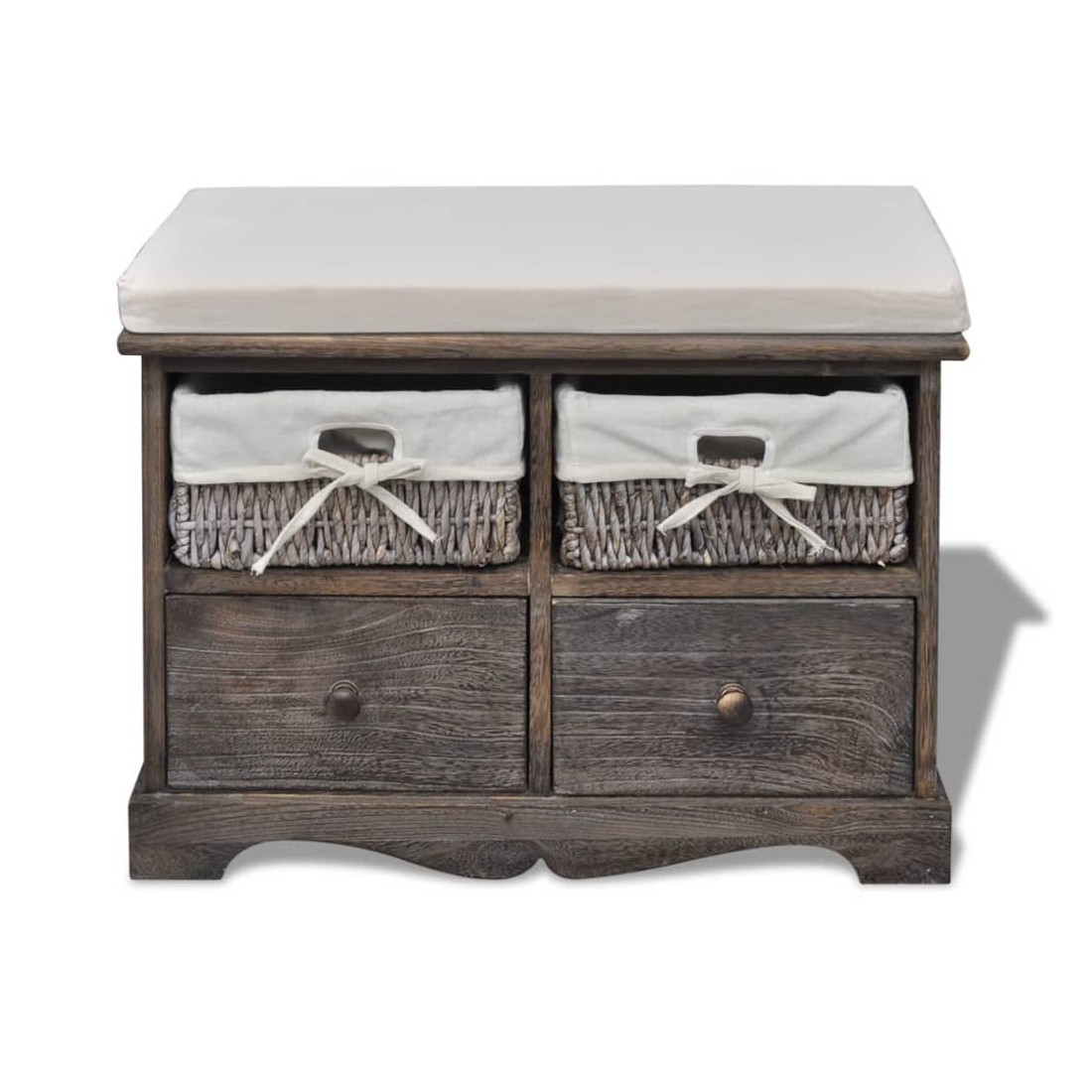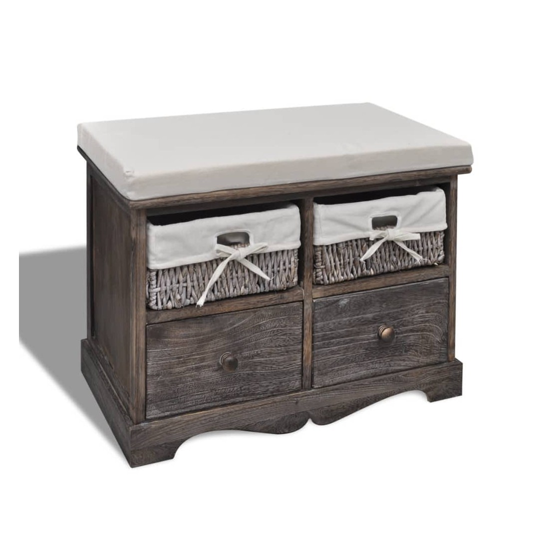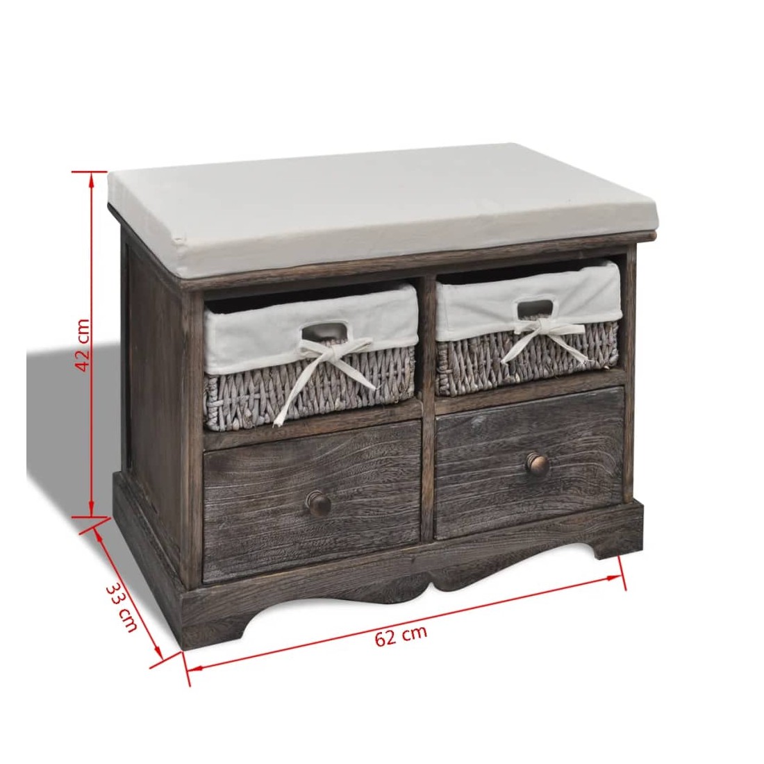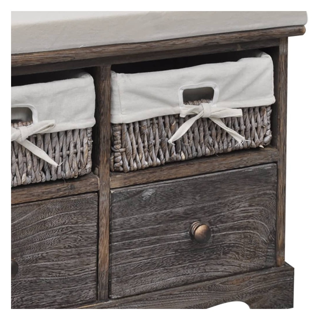 Ce banc de rangement en bois de haute qualité présente un design simple mais élégant. Il stocke non seulement vos affaires mais améliore également le décor de votre pièce. Livré avec deux paniers tissés et deux tiroirs en bois, ce banc de rangement durable vous offre beaucoup d'espace pour ranger vos objets de valeur, tout en apportant un style champêtre à votre pièce. Un coussin de siège supérieur offre un endroit confortable pour vous asseoir. Il sera parfait sur votre véranda, dans votre vestiaire, chambre à coucher et autres pièces que vous aimez.