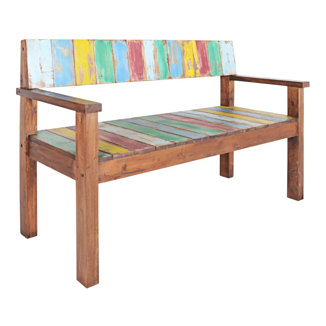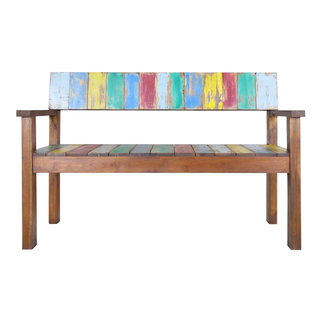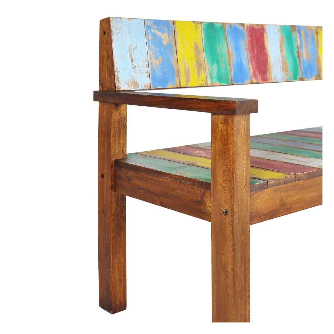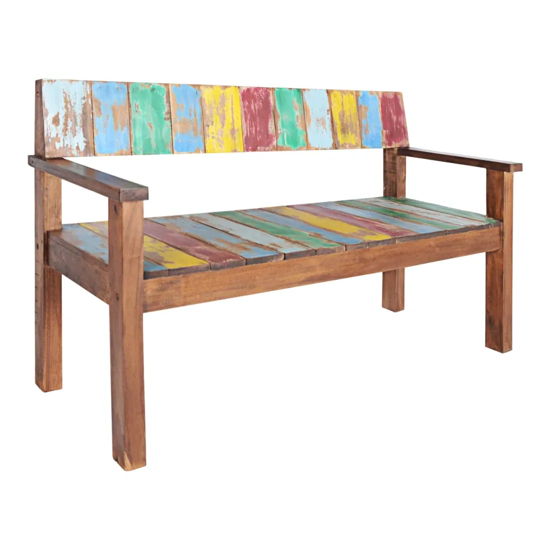 Ce banc en bois de style vintage ajoute une touche antique et constitue un supplément intemporel à votre pièce. Le banc est fabriqué à la main à partir de bois de récupération massif, une combinaison de bois récupérés, y compris le teck, le bois de manguier, le bois de pin, le hêtre, etc. Ces bois sont recyclés à partir de vieux bâtiments tels que des usines, des hangars et des bateaux. Cela en fait une option écologique excellente dans la fabrication de meubles. Comme chaque pièce est faite à la main, les couleurs varient avec beaucoup de bleus, de verts, de rouges et de jaunes révélés. Remarque importante : la couleur et les grains de bois peuvent varier d'une pièce à l'autre, ce qui rend chaque article unique et légèrement différent l'un de l'autre ; la livraison est également aléatoire.