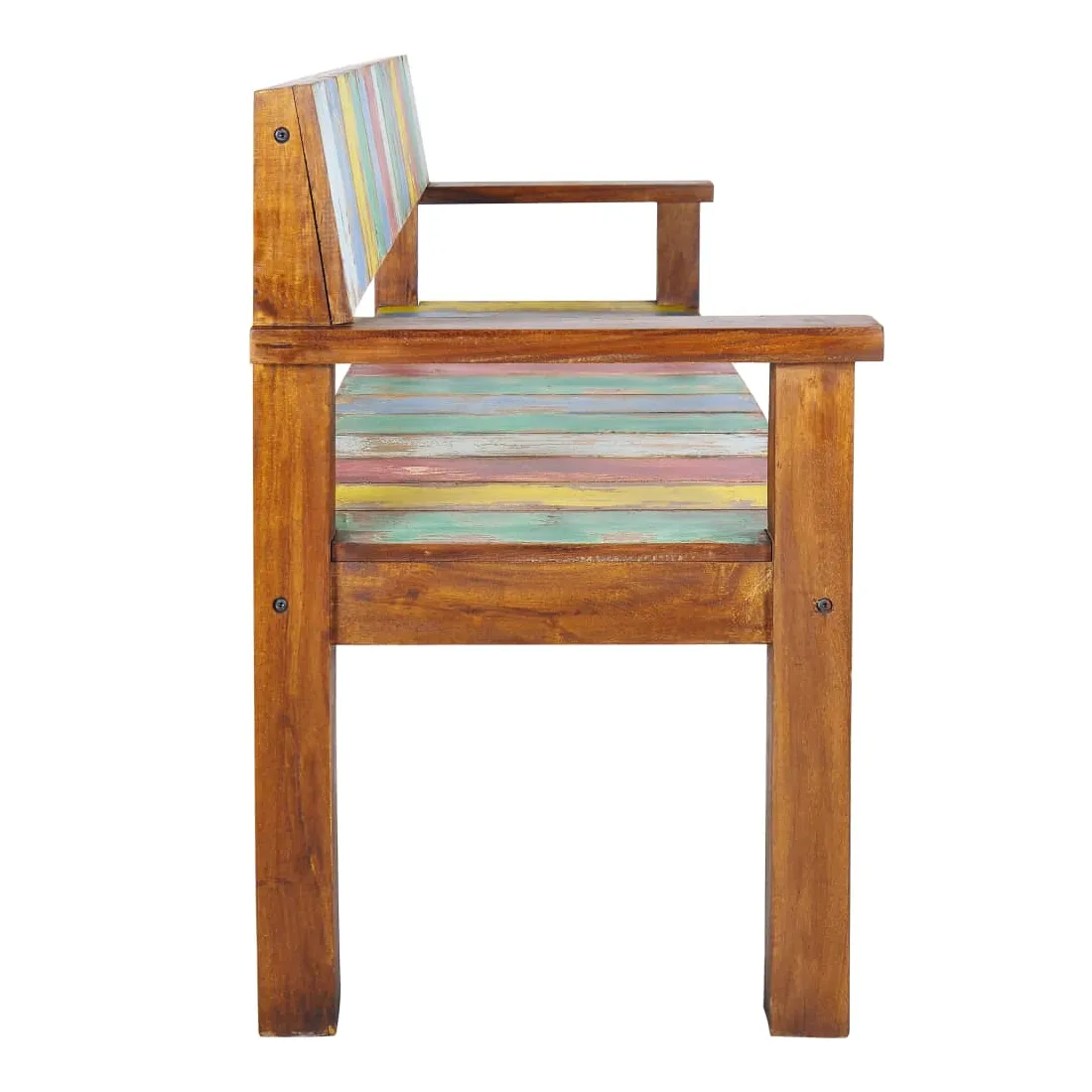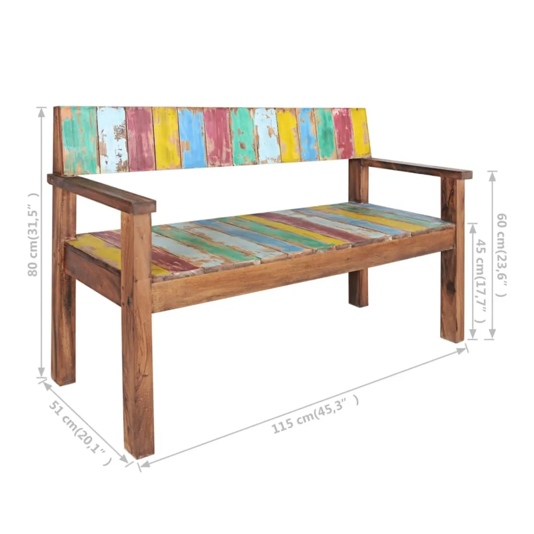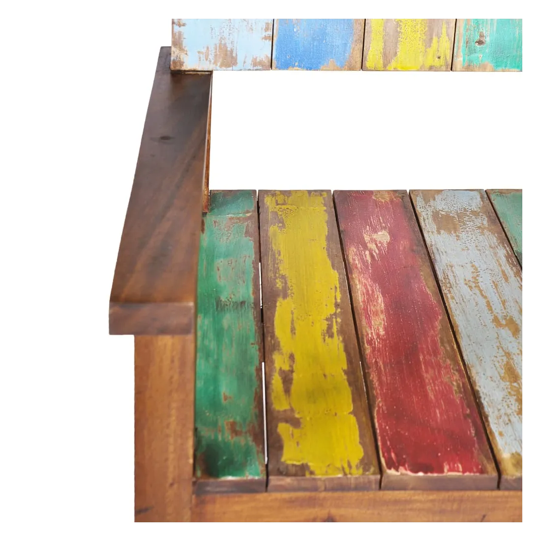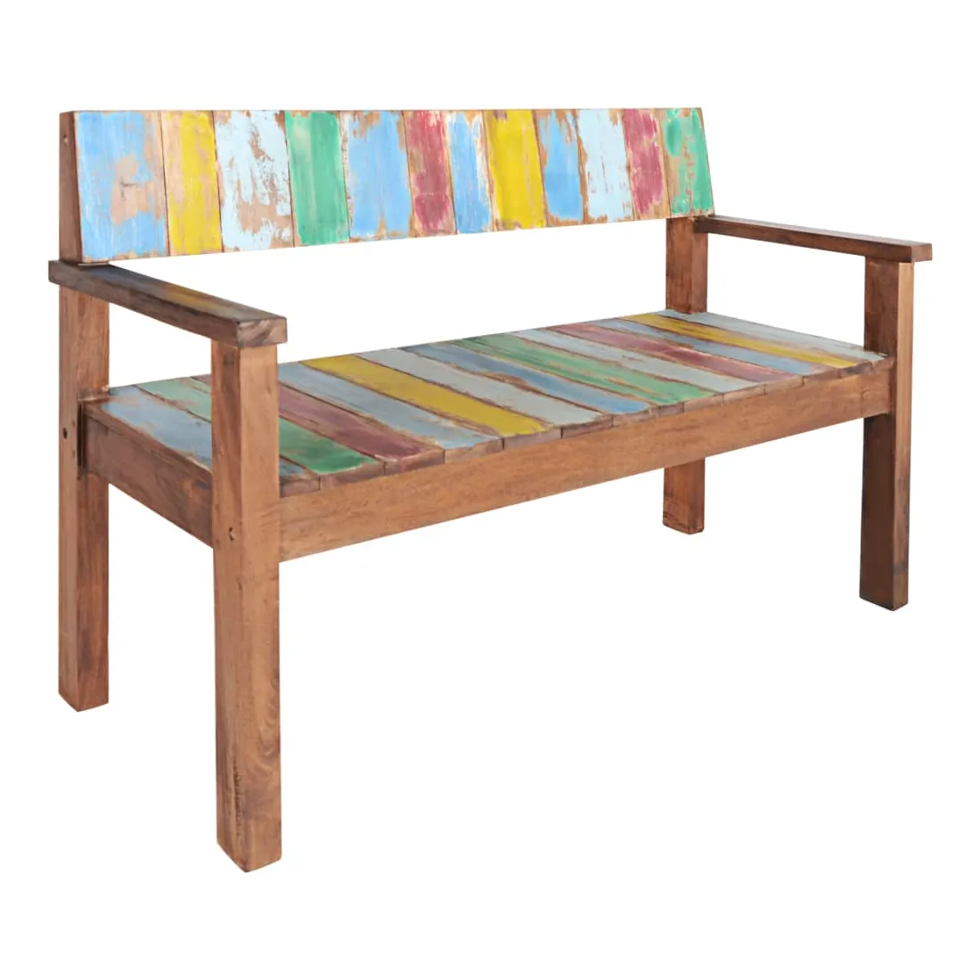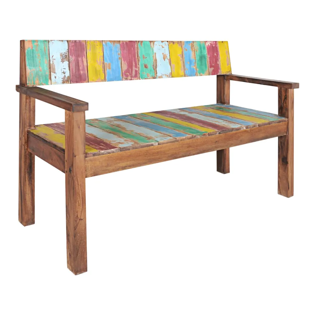 Ce banc en bois de style vintage ajoute une touche antique et constitue un supplément intemporel à votre pièce. Le banc est fabriqué à la main à partir de bois de récupération massif, une combinaison de bois récupérés, y compris le teck, le bois de manguier, le bois de pin, le hêtre, etc. Ces bois sont recyclés à partir de vieux bâtiments tels que des usines, des hangars et des bateaux. Cela en fait une option écologique excellente dans la fabrication de meubles. Comme chaque pièce est faite à la main, les couleurs varient avec beaucoup de bleus, de verts, de rouges et de jaunes révélés. Remarque importante : la couleur et les grains de bois peuvent varier d'une pièce à l'autre, ce qui rend chaque article unique et légèrement différent l'un de l'autre ; la livraison est également aléatoire.