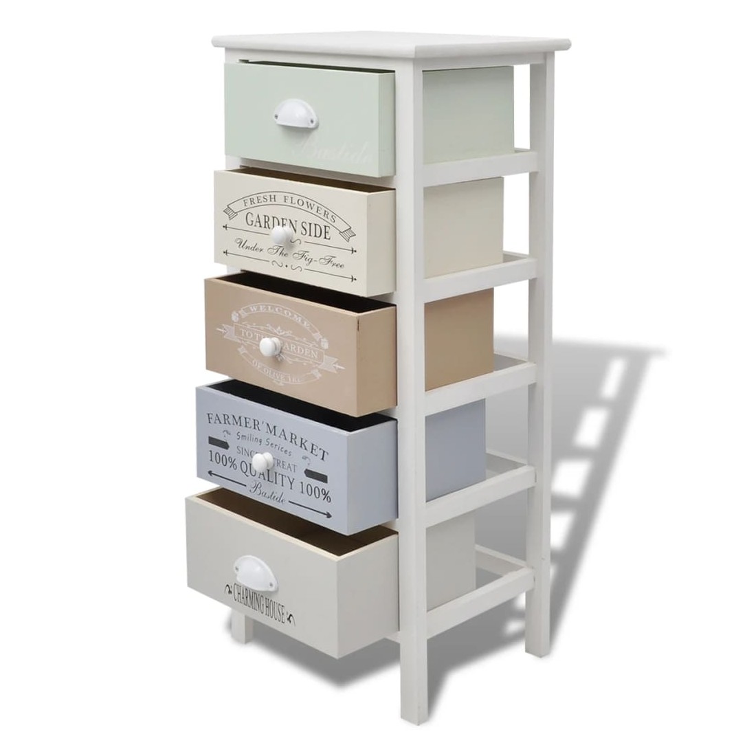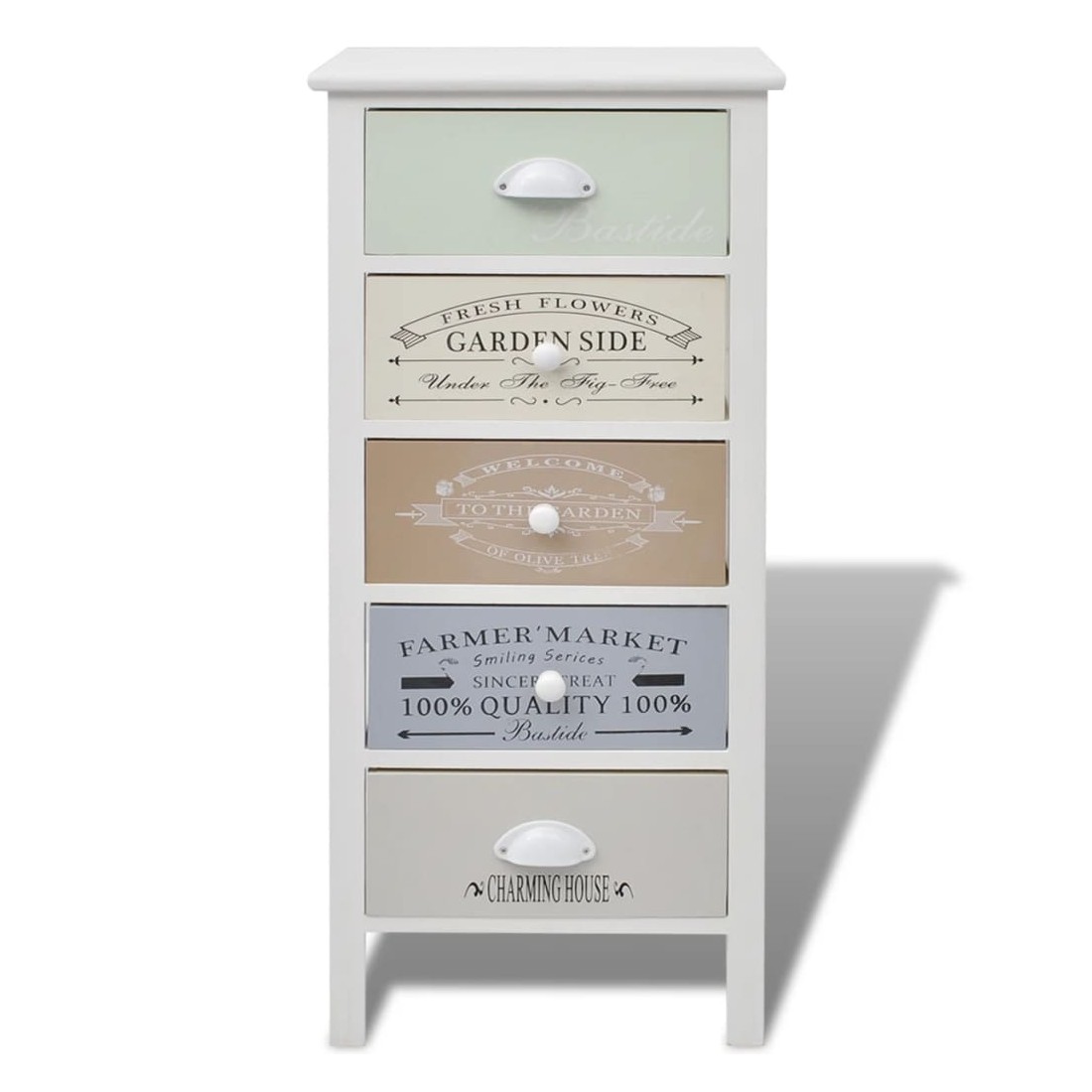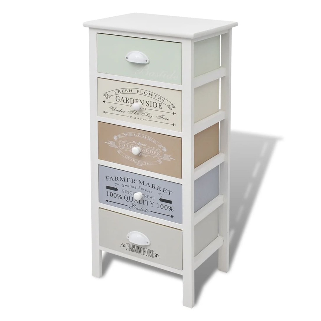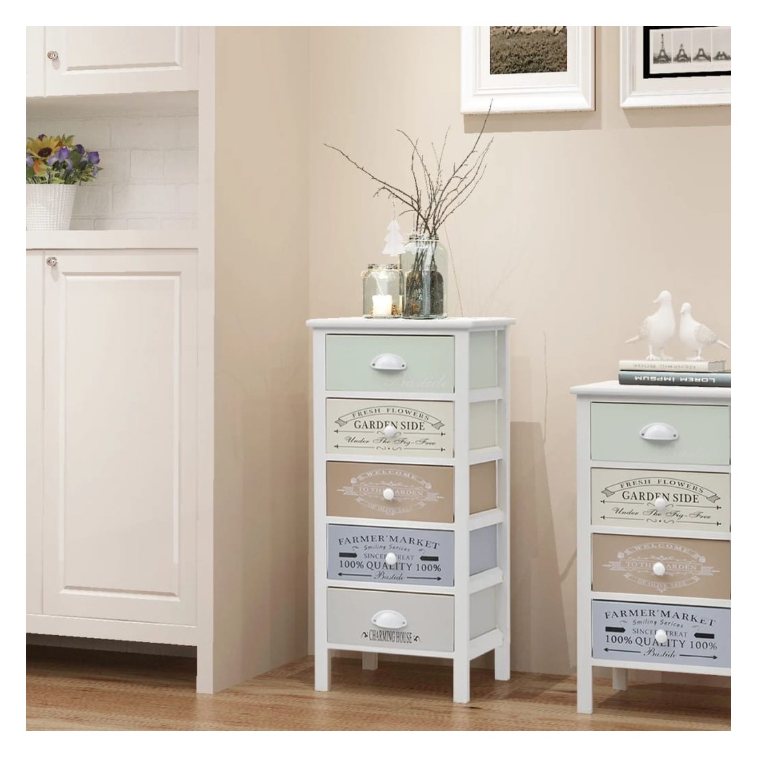 Ajoutez une touche de charme rustique à votre maison avec cet armoire de rangement chic en style français classique ! Cette armoire à tiroirs est dotée de 5 tiroirs coulissants qui fournissent un vaste espace de rangement pour vos effets personnels et gardent votre chambre rangée. Les tiroirs avec des gravures d'époque ajoutent du charme rural à votre armoire. Les tiroirs sont échangeables. Vous pouvez placer également des photos, des livres et des plantes en pot au-dessus de l'armoire de hall. Fabriquée en matériaux de haute qualité, l'armoire latérale est durable et facile à nettoyer.