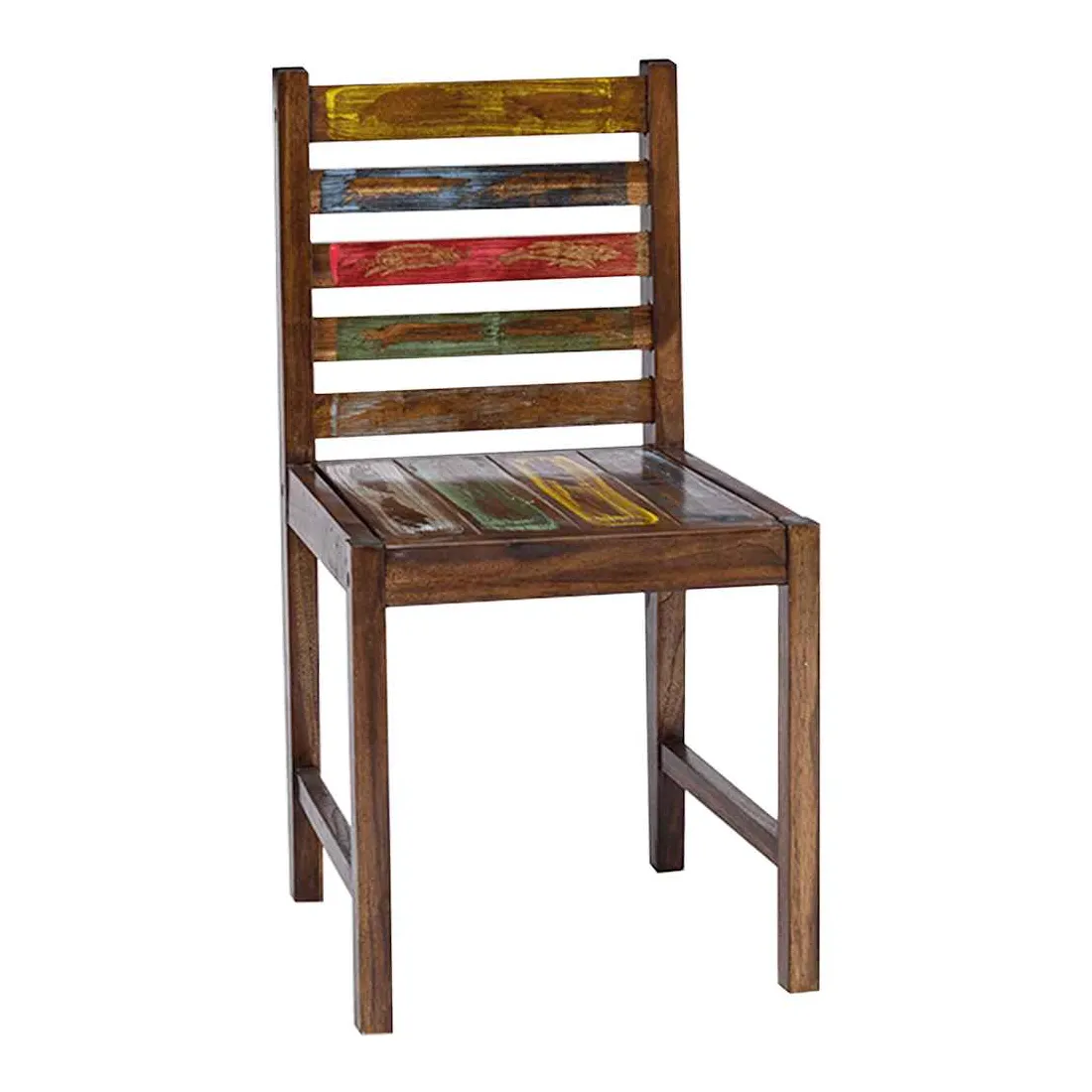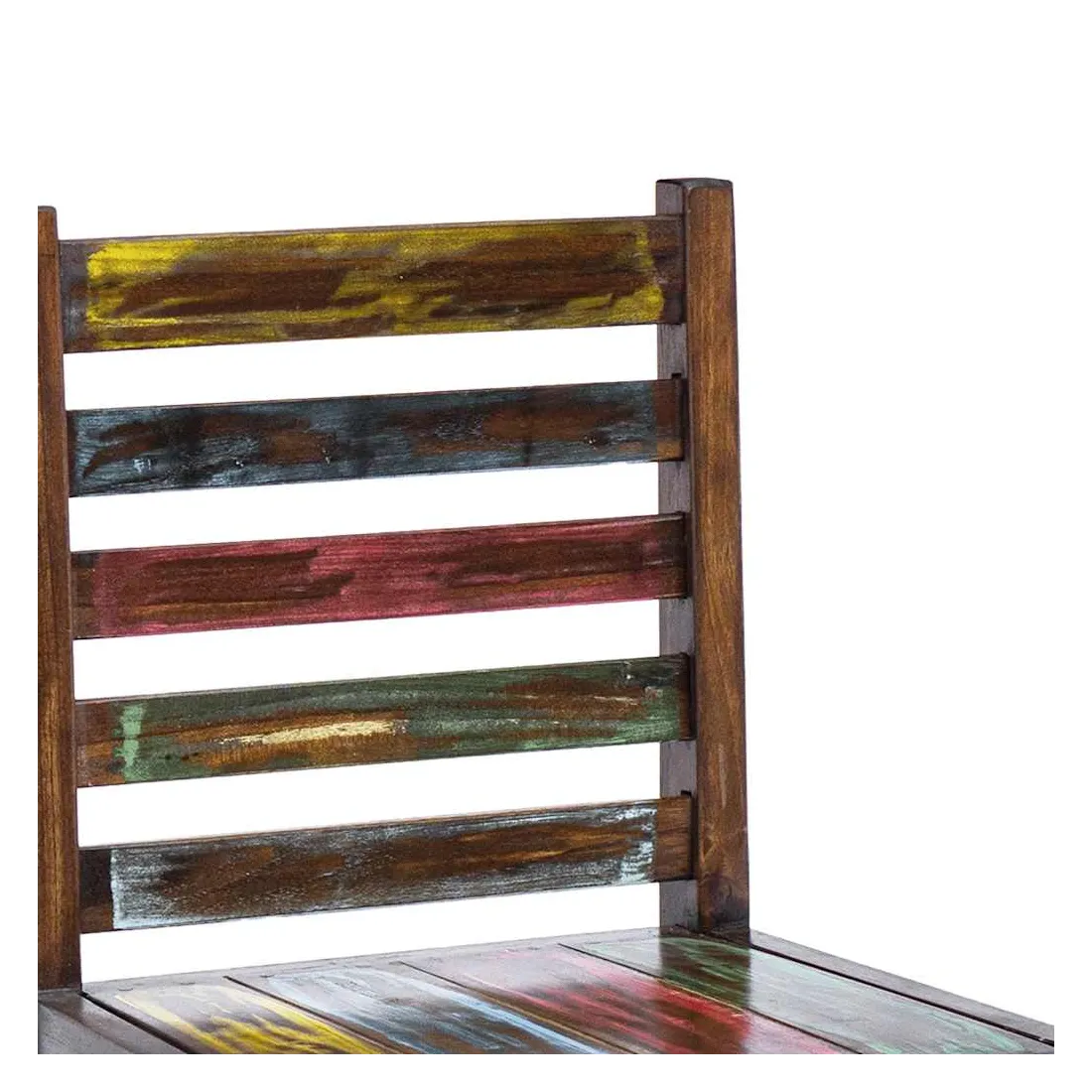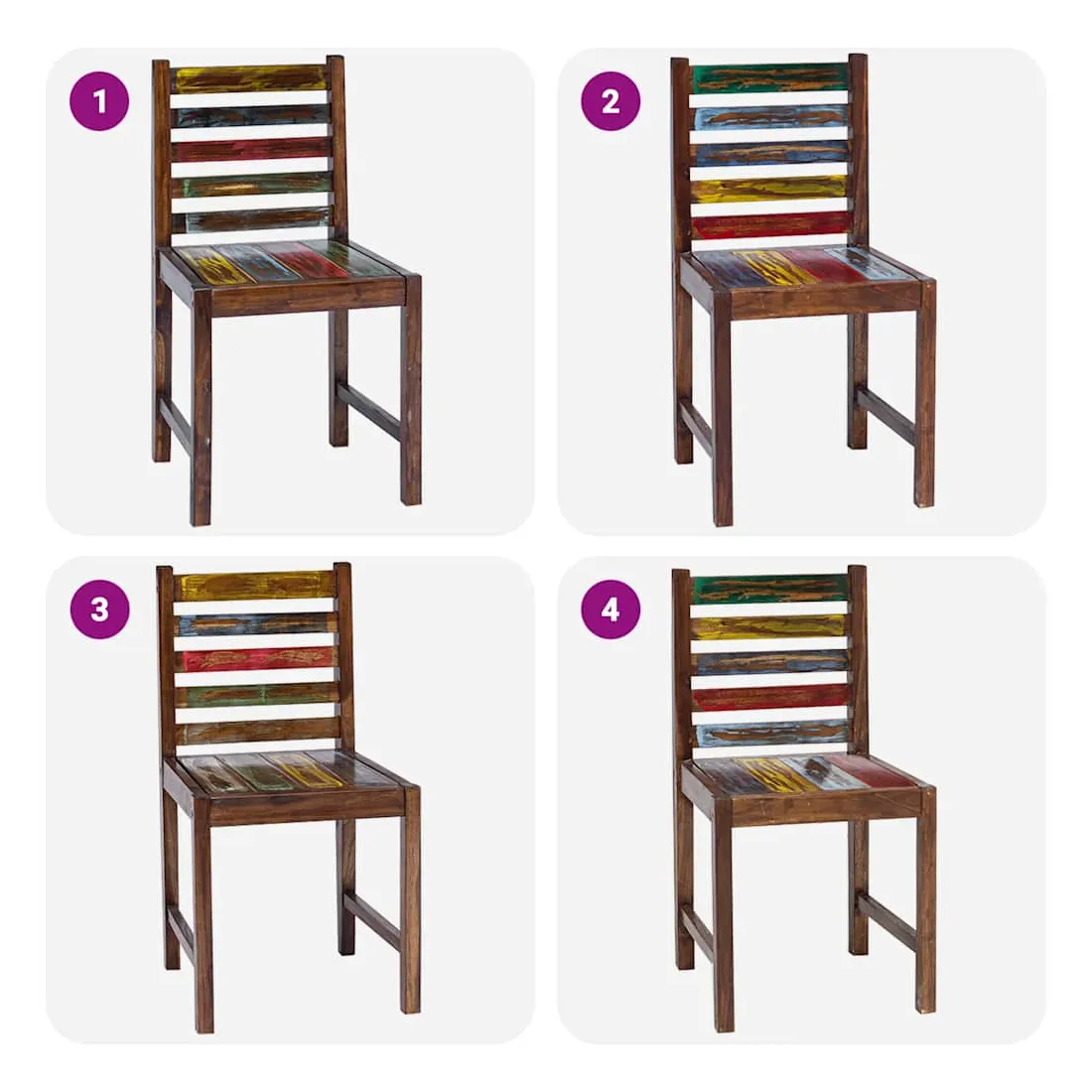 Ces chaises de salle à manger en bois de style vintage ajouteront une touche antique et constitueront un supplément intemporel au décor de votre salle à manger. Les chaises sont fabriquées à la main à partir de bois de récupération massif, une combinaison de bois récupérés, y compris le teck, le bois de manguier, le bois de pin, le hêtre, etc. Ces bois sont recyclés à partir de vieux bâtiments tels que des usines, des hangars et des bateaux. Cela en fait une option écologique excellente dans la fabrication de meubles. Comme chaque pièce est faite à la main, les couleurs varient avec beaucoup de bleus, de verts, de rouges et de jaunes révélés. Cela signifie même que chaque chaise est unique ! Remarque importante : la couleur et les grains de bois peuvent varier d'une pièce à l'autre, ce qui rend chaque article unique et légèrement différent l'un de l'autre ; la livraison est aléatoire.