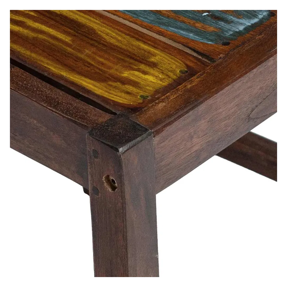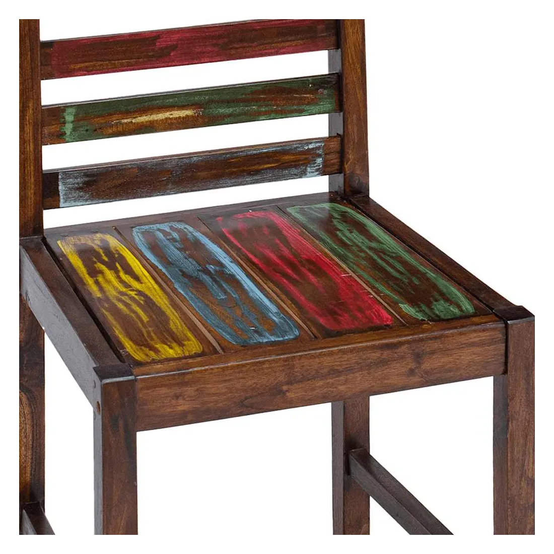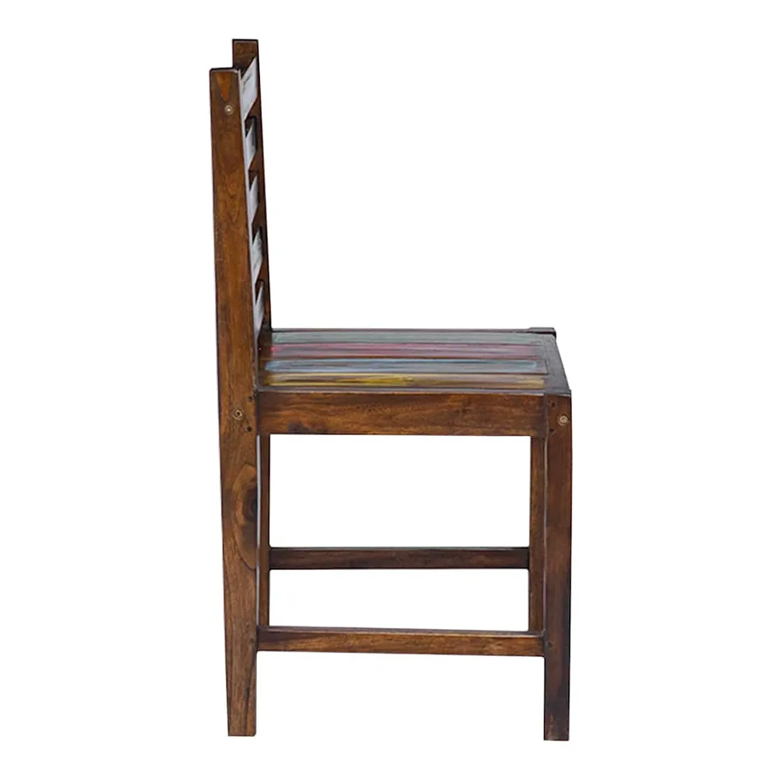 Ces chaises de salle à manger en bois de style vintage ajouteront une touche antique et constitueront un supplément intemporel au décor de votre salle à manger. Les chaises sont fabriquées à la main à partir de bois de récupération massif, une combinaison de bois récupérés, y compris le teck, le bois de manguier, le bois de pin, le hêtre, etc. Ces bois sont recyclés à partir de vieux bâtiments tels que des usines, des hangars et des bateaux. Cela en fait une option écologique excellente dans la fabrication de meubles. Comme chaque pièce est faite à la main, les couleurs varient avec beaucoup de bleus, de verts, de rouges et de jaunes révélés. Cela signifie même que chaque chaise est unique ! Remarque importante : la couleur et les grains de bois peuvent varier d'une pièce à l'autre, ce qui rend chaque article unique et légèrement différent l'un de l'autre ; la livraison est aléatoire.