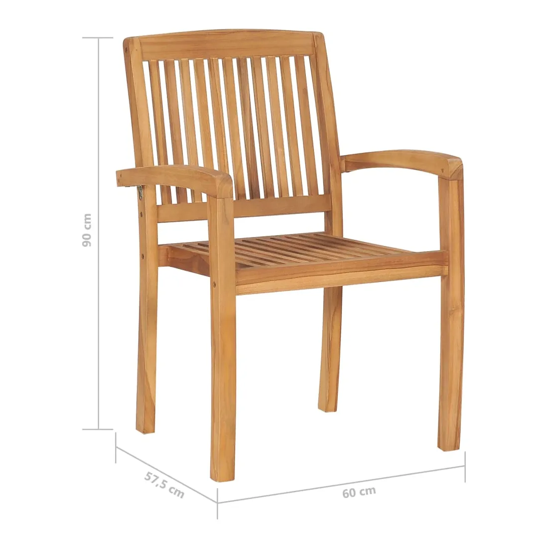 Ajoutez une touche de charme rustique à votre salle à manger, jardin ou terrasse avec cet ensemble de chaises de jardin empilables avec ensemble de coussins ! La chaise de salle à manger élève votre espace de vie intérieur ou extérieur à un niveau supérieur avec un design à lattes et élégant. Cet ensemble de meubles en teck est fabriqué à partir de bois dur de teck extrêmement durable et est chevronné, séché au four et poncé finement pour lui donner un aspect très lisse. Le bois de teck est connu pour sa solidité et sa résistance aux intempéries exceptionnelles, ce qui le rend bien plus adapté aux meubles de jardin que tout autre type de bois. Le bois de teck est le choix parfait si vous souhaitez acheter un meuble de jardin durable. Il est facile à entretenir et à nettoyer avec un chiffon humide. De plus, la chaise de salle à manger peut être empilée pour économiser de l'espace de stockage lorsqu'elle n'est pas utilisée. De plus, les coussins inclus offrent un confort supplémentaire. Chaque coussin a 2 jeux de cordes pour le fixer fermement sur la chaise. Remarque : afin de prolonger la durée de vie de vos meubles d'extérieur, nous vous recommandons de les nettoyer régulièrement et de ne pas les laisser à l'extérieur sans protection inutilement.Nettoyage : utiliser une solution savonneuse douceStockage : si possible, stockez dans un endroit frais et sec à l'intérieur. Si le produit est stocké à l'extérieur, protégez-le avec une housse imperméable. Essuyez et séchez l'excès d'eau ou de neige des surfaces planes après la pluie ou une chute de neige. Permettez une circulation d'air suffisante afin d'éviter les dommages liés à l'humidité.