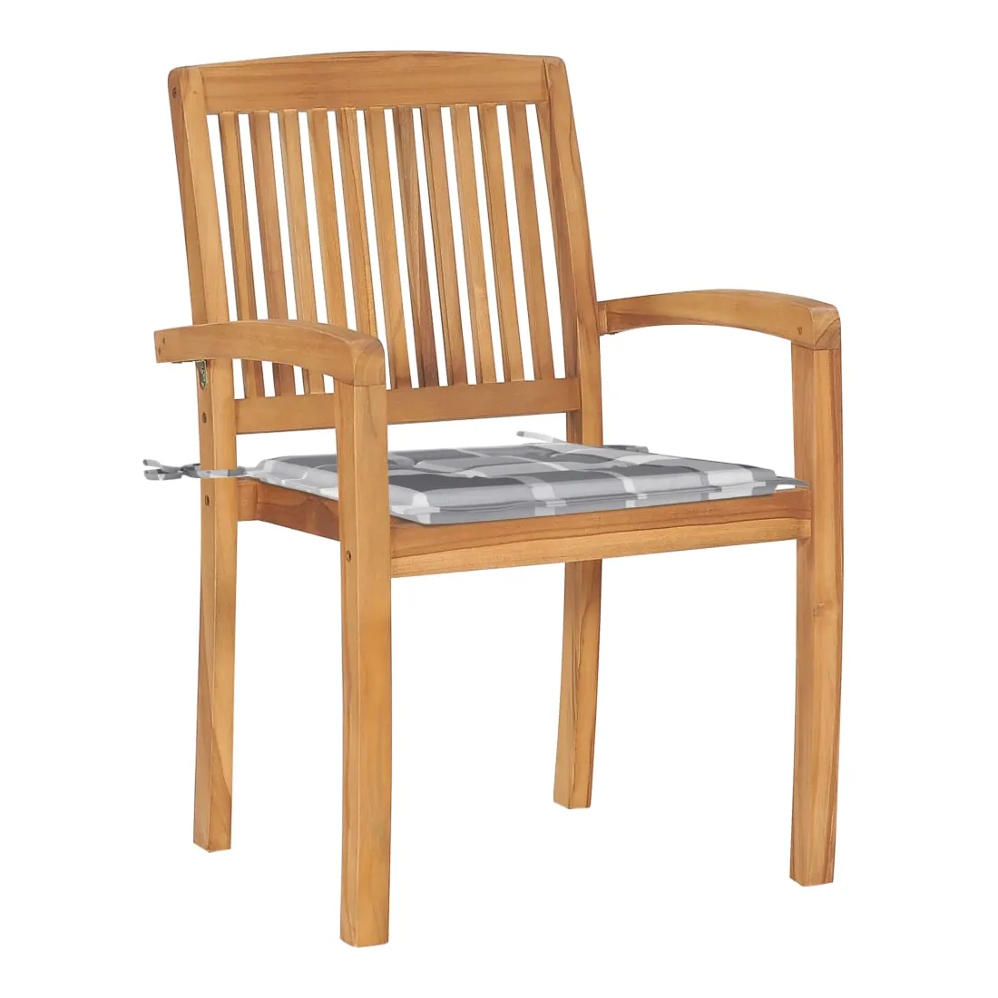 vidaXLAjoutez une touche de charme rustique à votre salle à manger, jardin ou terrasse avec cet ensemble de chaises de jardin empilables avec ensemble de coussins ! La chaise de salle à manger élève votre espace de vie intérieur ou extérieur à un niveau supérieur avec un design à lattes et élégant. Cet ensemble de meubles en teck est fabriqué à partir de bois dur de teck extrêmement durable et est chevronné, séché au four et poncé finement pour lui donner un aspect très lisse. Le bois de teck est connu pour sa solidité et sa résistance aux intempéries exceptionnelles, ce qui le rend bien plus adapté aux meubles de jardin que tout autre type de bois. Le bois de teck est le choix parfait si vous souhaitez acheter un meuble de jardin durable. Il est facile à entretenir et à nettoyer avec un chiffon humide. De plus, la chaise de salle à manger peut être empilée pour économiser de l'espace de stockage lorsqu'elle n'est pas utilisée. De plus, les coussins inclus offrent un confort supplémentaire. Chaque coussin a 2 jeux de cordes pour le fixer fermement sur la chaise. Remarque : afin de prolonger la durée de vie de vos meubles d'extérieur, nous vous recommandons de les nettoyer régulièrement et de ne pas les laisser à l'extérieur sans protection inutilement.Nettoyage : utiliser une solution savonneuse douceStockage : si possible, stockez dans un endroit frais et sec à l'intérieur. Si le produit est stocké à l'extérieur, protégez-le avec une housse imperméable. Essuyez et séchez l'excès d'eau ou de neige des surfaces planes après la pluie ou une chute de neige. Permettez une circulation d'air suffisante afin d'éviter les dommages liés à l'humidité.