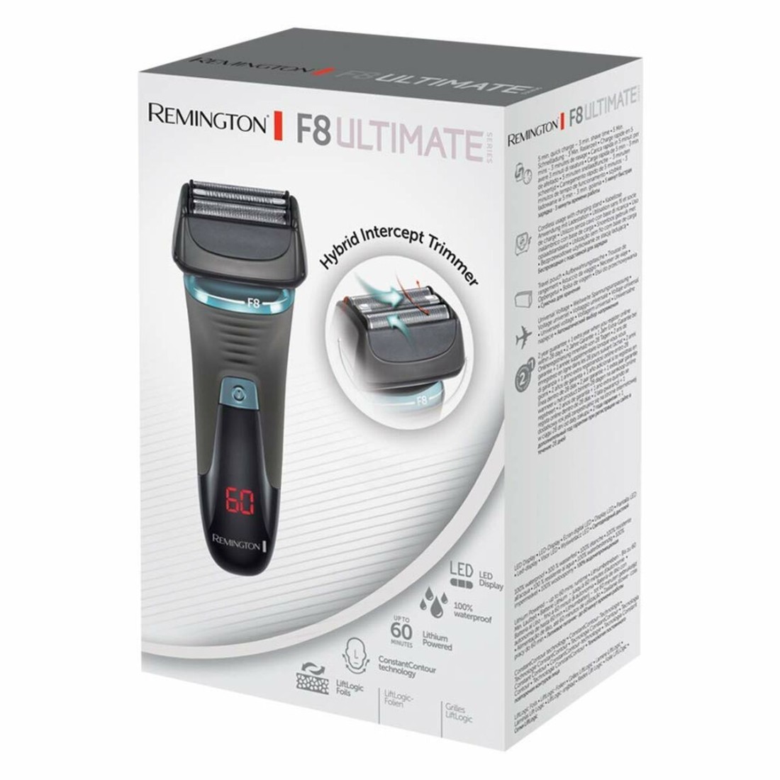 Remington XF8705. Sistema de afeitado: Máquina de afeitar de láminas, Color del producto: Negro, Gris, Tipo de visualizador: LED. Fuente de energía: Batería, Tipo de batería: Integrado, Tiempo de carga rápida: 5 min. Funciones de la base de la máquina de afeitar: Carga
