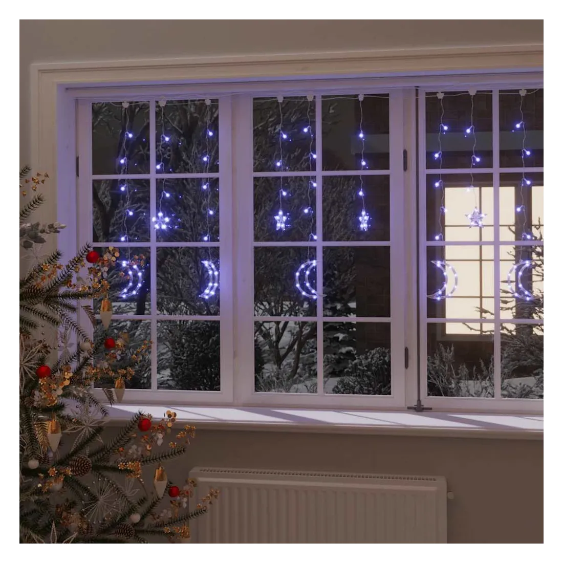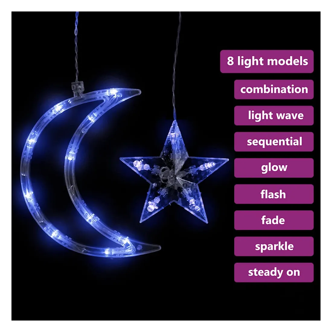 La guirlande lumineuse d'étoile et de lune est parfaite pour une utilisation comme un complément d’éclairage à tout projet décoratif. Elle est adaptée pour Noël, fêtes, mariages et autres jours fériés. Le rideau lumineux est équipé de 345 LED à économie d'énergie, créant une performance d'éclairage magique. Il dispose de 8 effets d'éclairage différents : mode combiné, vagues, mode séquentiel, mode de lumière lente, clignotant, mode d'atténuation lente, scintillement et éclairage continu. La télécommande (pile non incluse. Utilisez une pile bouton CR2025) incluse vous permet de régler les modes d'éclairage facilement et commodément. C'est un excellent accessoire de décoration pour illuminer les espaces extérieurs et intérieurs. Remarque: l'USB inclus n'est pas étanche, donc cette partie doit éviter l'eau, mais grâce au câble de 3 m, la décoration de Noël peut être utilisée à l’extérieur car le câble et le produit sont étanches. Ce produit est doté d'un connecteur USB, mais la source d'alimentation certifiée de USB 5V n'est pas incluse.