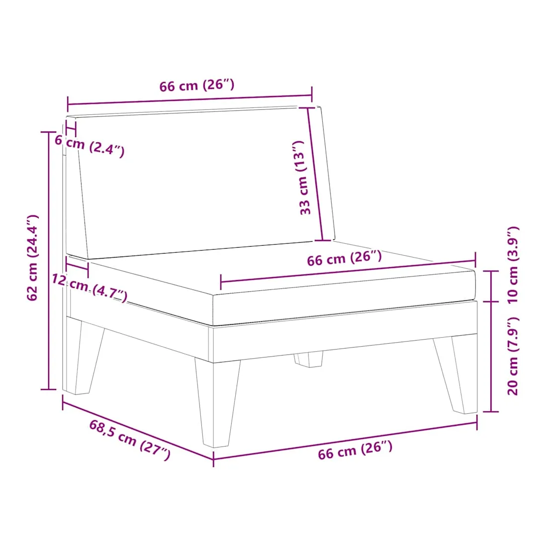 Ce canapé central en bois est un choix idéal pour vous détendre, profiter du beau temps, faire une sieste ou discuter en famille ou entre amis. Avec son design indémodable, cette chaise centrale ajoute une touche de charme rustique à votre espace de vie. Le siège central est fabriqué en bois d’acacia massif, un bois dur tropical, qui est résistant aux intempéries et très durable. Il a une construction solide et nécessite peu d’entretien. Combiné avec des coussins bien rembourrés, ce canapé offre le plus grand confort. Le canapé en bois est spécialement conçu pour faire partie d'un ensemble de salon et peut également être utilisé comme un canapé simple. Vous pouvez le combiner avec d’autres segments modulaires comme table basse, repose-pied et canapé d'angle pour créer vos propres configurations de salon de jardin ! Remarque : afin de prolonger la durée de vie de vos meubles d'extérieur, nous vous recommandons de les nettoyer régulièrement et de ne pas les laisser à l'extérieur sans protection inutilement.Nettoyage : Utiliser une solution savonneuse douce.Stockage : si possible, stockez dans un endroit frais et sec à l'intérieur. Si le produit est stocké à l'extérieur, protégez-le avec une housse imperméable. Essuyez et séchez l'excès d'eau ou de neige des surfaces planes après la pluie ou une chute de neige. Permettez une circulation d'air suffisante afin d'éviter les dommages liés à l'humidité.
