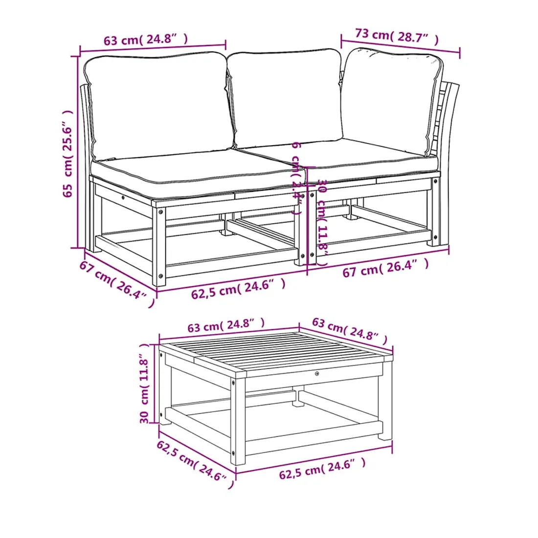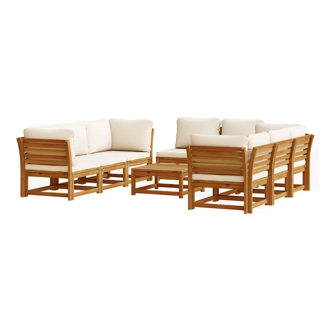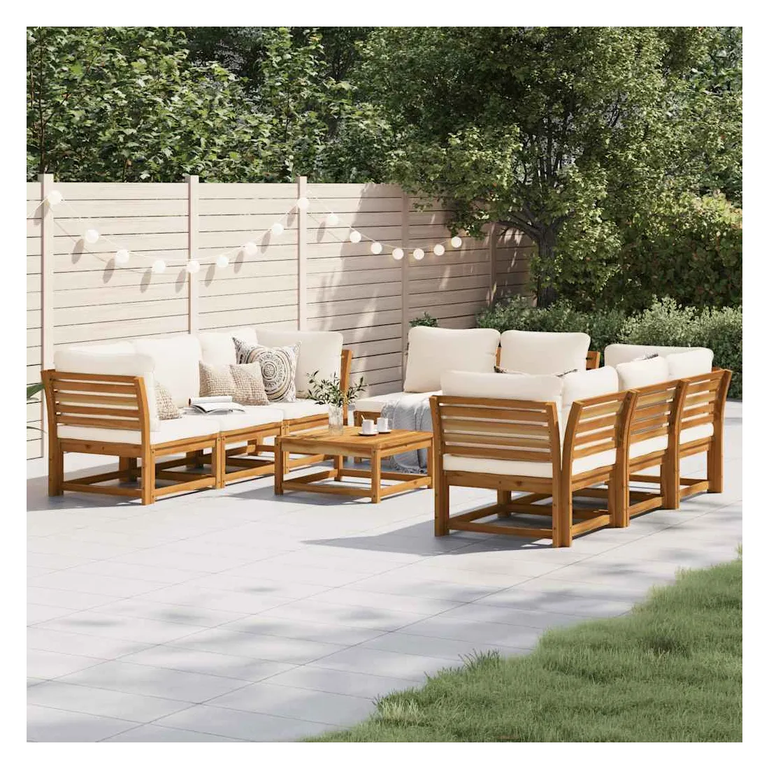 Cet ensemble de salon de jardin en bois avec coussins a un design élégant et constitue un excellent choix pour vous détendre et profiter du jardin ou du patio. Bois d'acacia massif : le bois d'acacia massif est un matériau naturel magnifique. Le bois d'acacia un bois dur tropical, qui est dense, robuste et durable.Expérience d'assise confortable : le dossier et les coussins rembourrés rendent l’ensemble de canapé de jardin plus confortable pour s'asseoir.Conception à lattes : la conception à lattes de l’ensemble de meubles en bois empêche efficacement l'eau de s'accumuler, ce qui garantit que l'assise reste sèche et exempte de tout risque de pourriture.Conception modulaire : cet ensemble de meubles d'extérieur a une conception modulaire, ce qui le rend complètement flexible et facile à déplacer, afin que vous puissiez créer un agencement de meubles d'extérieur personnalisé. Bon à savoir :Pour que vos meubles d'extérieur restent beaux, nous vous recommandons de les protéger avec une housse imperméable.