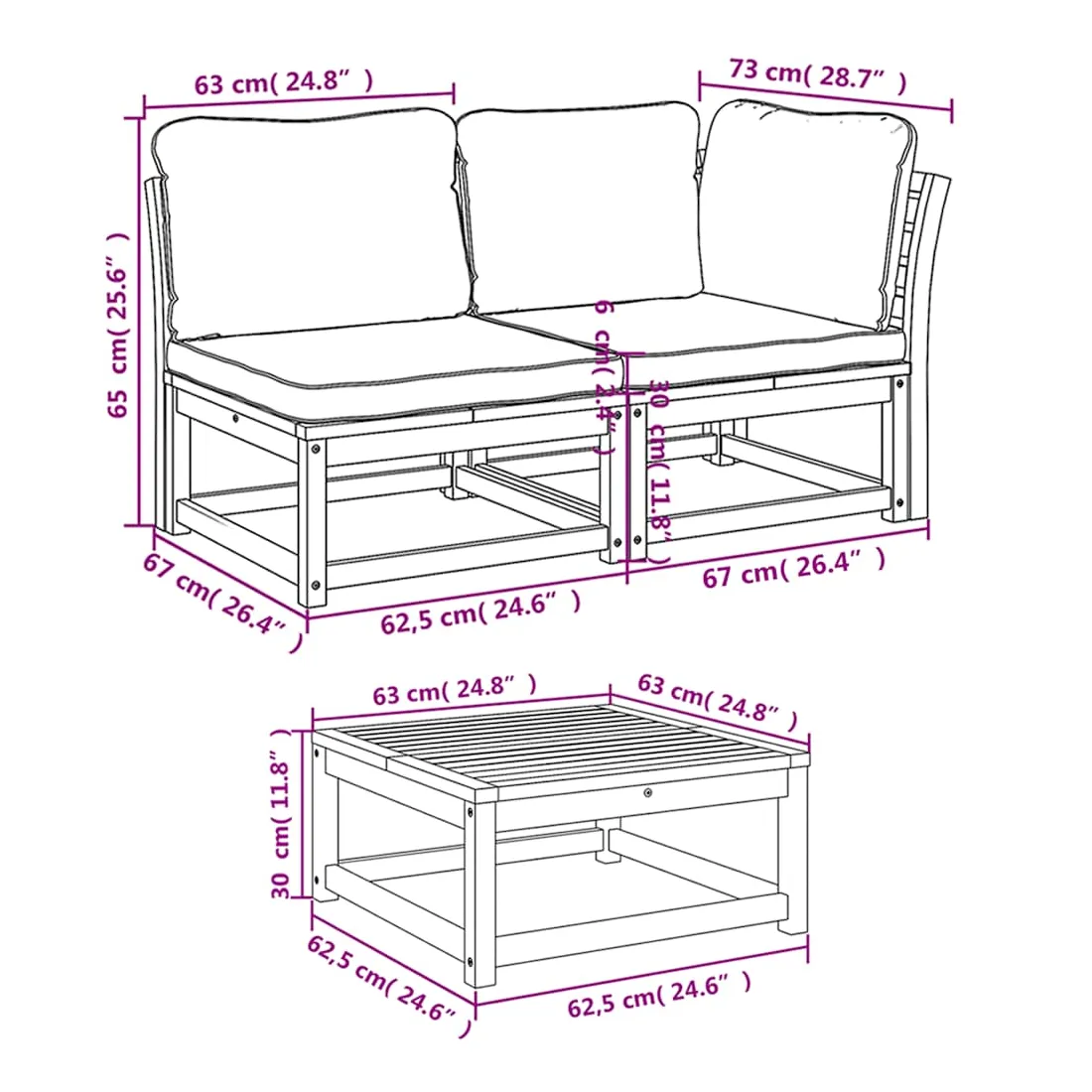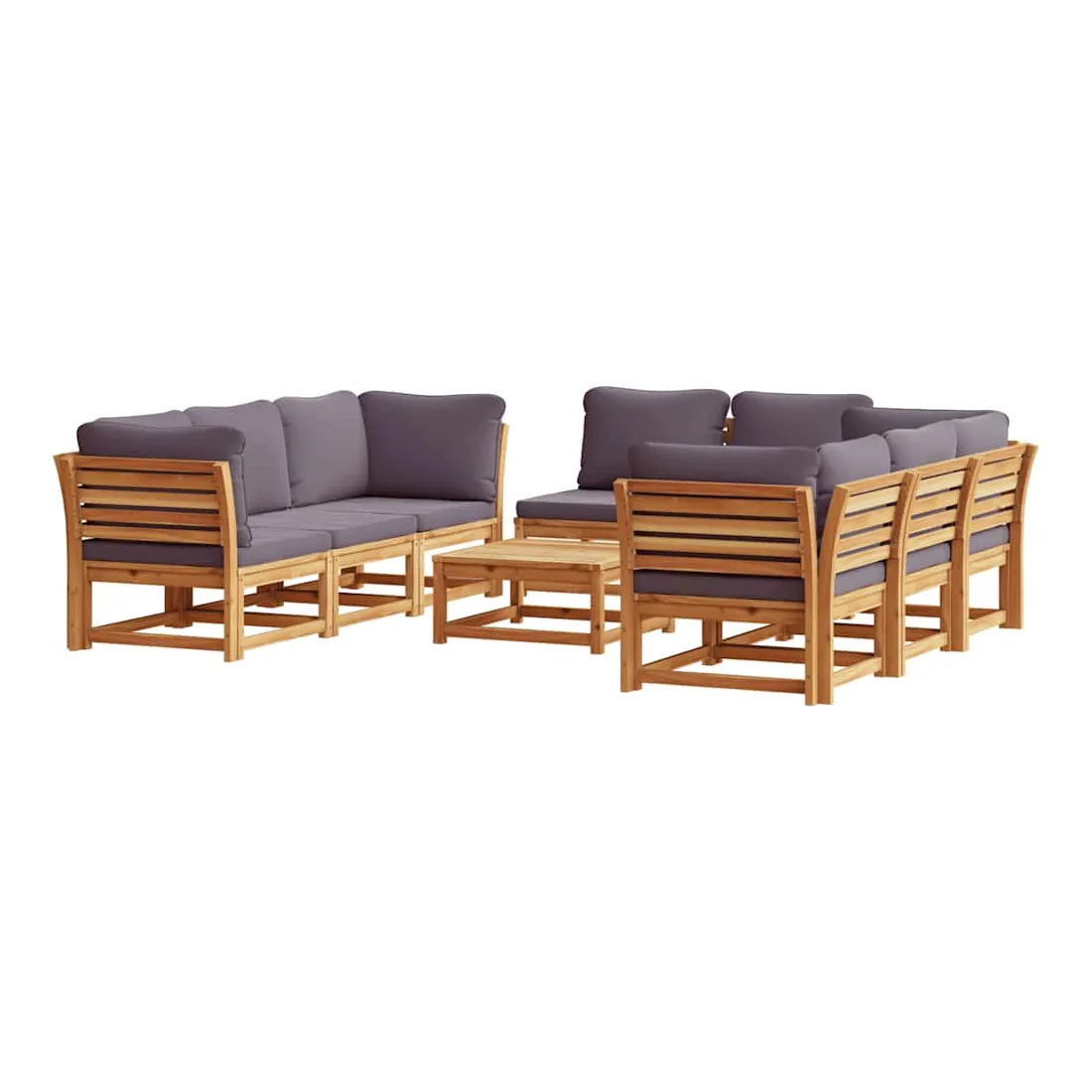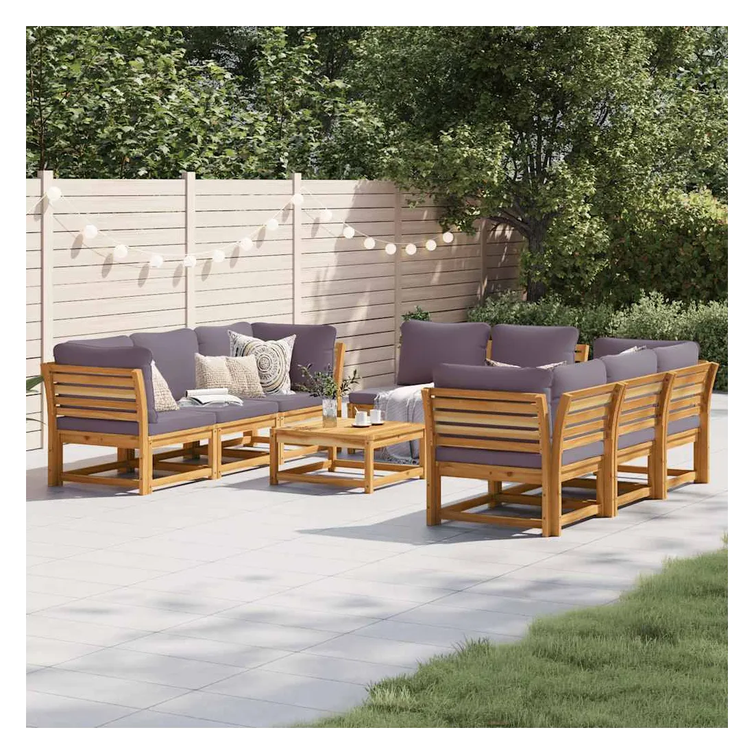 Cet ensemble de salon de jardin en bois avec coussins a un design élégant et constitue un excellent choix pour vous détendre et profiter du jardin ou du patio. Bois d'acacia massif : le bois d'acacia massif est un matériau naturel magnifique. Le bois d'acacia un bois dur tropical, qui est dense, robuste et durable.Expérience d'assise confortable : le dossier et les coussins rembourrés rendent l’ensemble de canapé de jardin plus confortable pour s'asseoir.Conception à lattes : la conception à lattes de l’ensemble de meubles en bois empêche efficacement l'eau de s'accumuler, ce qui garantit que l'assise reste sèche et exempte de tout risque de pourriture.Conception modulaire : cet ensemble de meubles d'extérieur a une conception modulaire, ce qui le rend complètement flexible et facile à déplacer, afin que vous puissiez créer un agencement de meubles d'extérieur personnalisé. Bon à savoir :Pour que vos meubles d'extérieur restent beaux, nous vous recommandons de les protéger avec une housse imperméable.