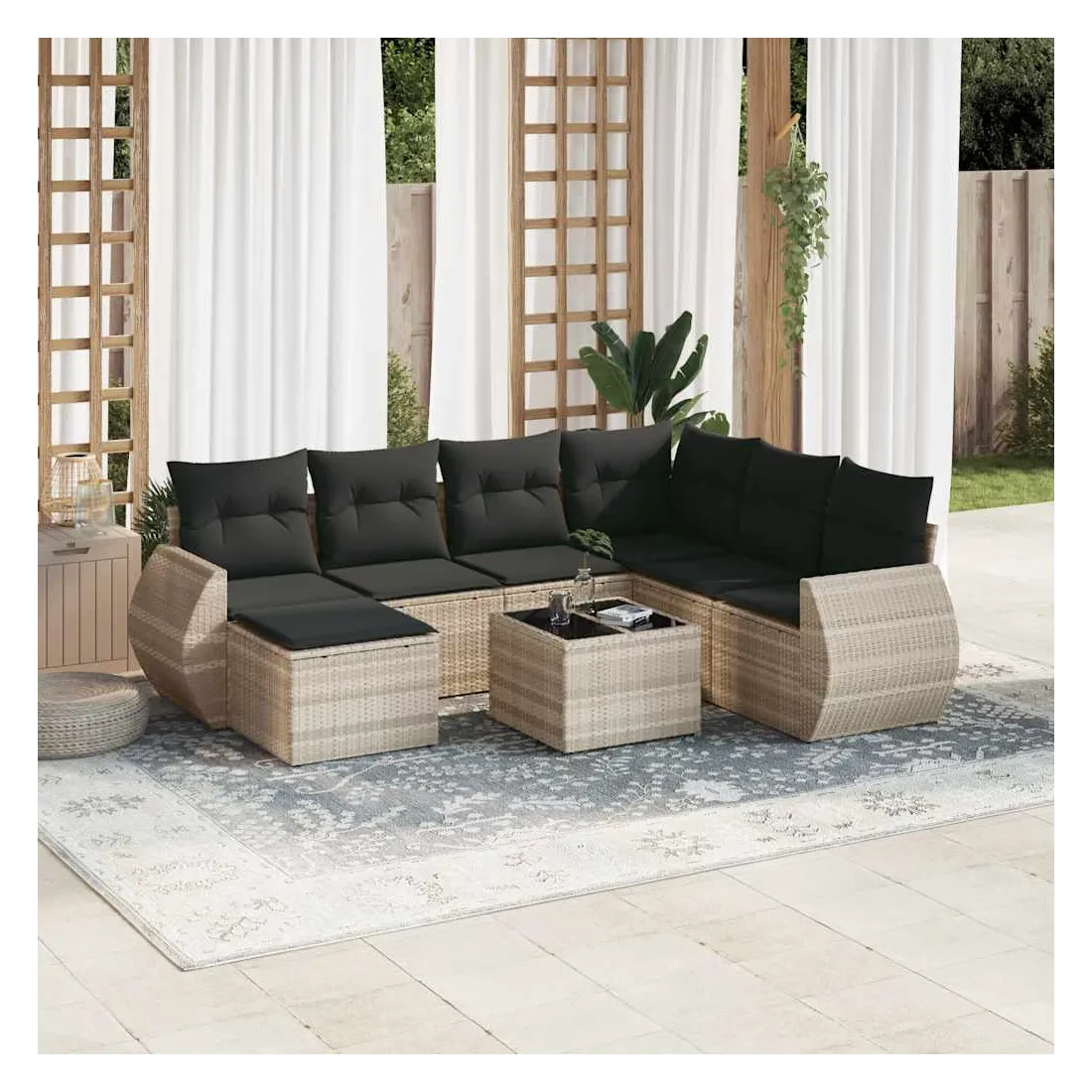 Cet ensemble de canapés de jardin est le complément parfait de votre arrière-cour, terrasse ou patio, offrant un espace confortable et accueillant pour discuter avec la famille et les amis ou simplement se détendre et profiter de l'extérieur. Matériau durable : la résine tressée, également connue sous le nom de poly rotin, est un matériau synthétique solide et nécessitant peu d'entretien qui ressemble au rotin naturel. Il est léger, facile à nettoyer et couramment utilisé pour les meubles d'extérieur en raison de sa durabilité et de ses propriétés de résistance aux intempéries.Dessus en verre : le dessus de la table d'extérieur est fabriqué en verre trempé solide et durable, ce qui le rend facile à nettoyer avec un chiffon humide et ajoute une touche d'élégance à votre espace extérieur.Expérience d'assise confortable : ce mobilier d'extérieur, doté de coussins épais, offre une expérience d'assise confortable.Housse amovible et lavable : ces coussins de siège sont dotés de housses amovibles pour un lavage et un entretien faciles.Conception modulaire : cet ensemble de meubles d'extérieur a une conception modulaire, ce qui le rend complètement flexible et facile à déplacer, afin que vous puissiez créer un agencement de meubles d'extérieur personnalisé. Bon à savoir :Pour que vos meubles d'extérieur restent beaux, nous vous recommandons de les protéger avec une housse imperméable.