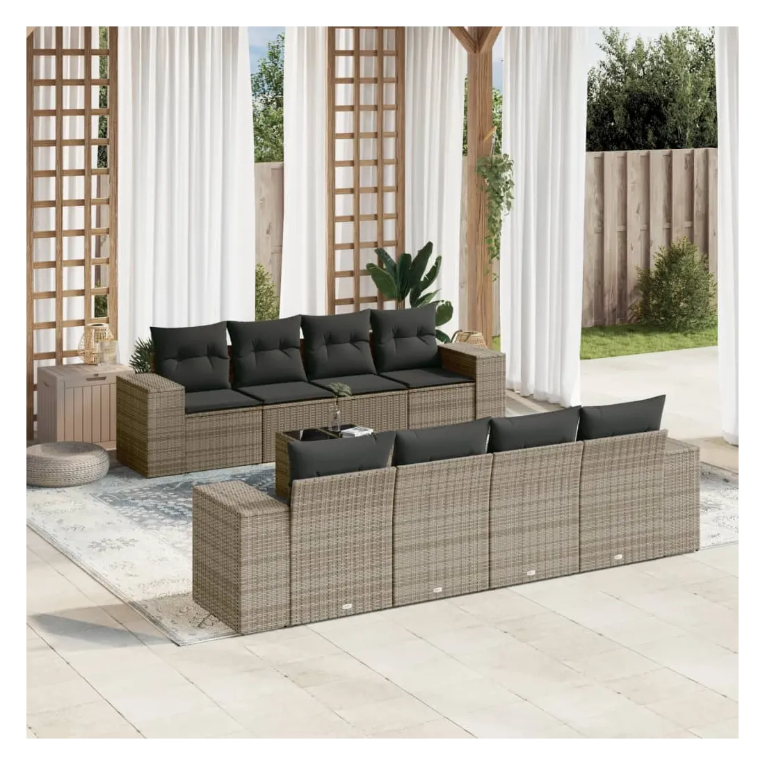 Cet ensemble de canapés de jardin est le complément parfait de votre arrière-cour, terrasse ou patio, offrant un espace confortable et accueillant pour discuter avec la famille et les amis ou simplement se détendre et profiter de l'extérieur. Matériau durable : la résine tressée, également connue sous le nom de poly rotin, est un matériau synthétique solide et nécessitant peu d'entretien qui ressemble au rotin naturel. Il est léger, facile à nettoyer et couramment utilisé pour les meubles d'extérieur en raison de sa durabilité et de ses propriétés de résistance aux intempéries.Dessus en verre : le dessus de la table d'extérieur est fabriqué en verre trempé solide et durable, ce qui le rend facile à nettoyer avec un chiffon humide et ajoute une touche d'élégance à votre espace extérieur.Expérience d'assise confortable : ce mobilier d'extérieur, doté de coussins épais, offre une expérience d'assise confortable.Housse amovible et lavable : ces coussins de siège sont dotés de housses amovibles pour un lavage et un entretien faciles.Conception modulaire : cet ensemble de meubles d'extérieur a une conception modulaire, ce qui le rend complètement flexible et facile à déplacer, afin que vous puissiez créer un agencement de meubles d'extérieur personnalisé. Bon à savoir :Pour que vos meubles d'extérieur restent beaux, nous vous recommandons de les protéger avec une housse imperméable.