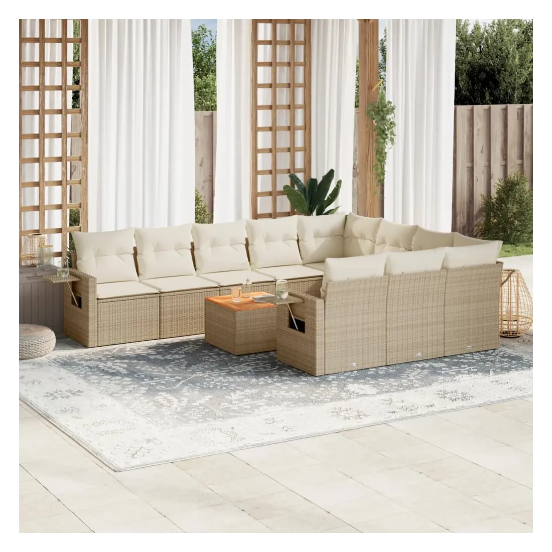 Cet ensemble de canapés de jardin est le complément parfait de votre arrière-cour, terrasse ou patio, offrant un espace confortable et accueillant pour discuter avec la famille et les amis ou simplement se détendre et profiter de l'extérieur. Matériau durable : la résine tressée, également connue sous le nom de poly rotin, est un matériau synthétique solide et nécessitant peu d'entretien qui ressemble au rotin naturel. Il est léger, facile à nettoyer et couramment utilisé pour les meubles d'extérieur en raison de sa durabilité et de ses propriétés de résistance aux intempéries.Table d'appoint pratique : ce mobilier d'extérieur comprend une table d'appoint pliable avec un ressort à gaz sur les accoudoirs, offrant un endroit pratique pour garder vos essentiels à portée de main.Dessus stable et facile à nettoyer : cette table de jardin a un dessus en bois d'acacia robuste, durable et facile à nettoyer avec un chiffon humide.Housse amovible et lavable : ces coussins de siège sont dotés de housses amovibles pour un lavage et un entretien faciles.Conception modulaire : cet ensemble de meubles d'extérieur a une conception modulaire, ce qui le rend complètement flexible et facile à déplacer, afin que vous puissiez créer un agencement de meubles d'extérieur personnalisé. Bon à savoir :Pour que vos meubles d'extérieur restent beaux, nous vous recommandons de les protéger avec une housse imperméable.