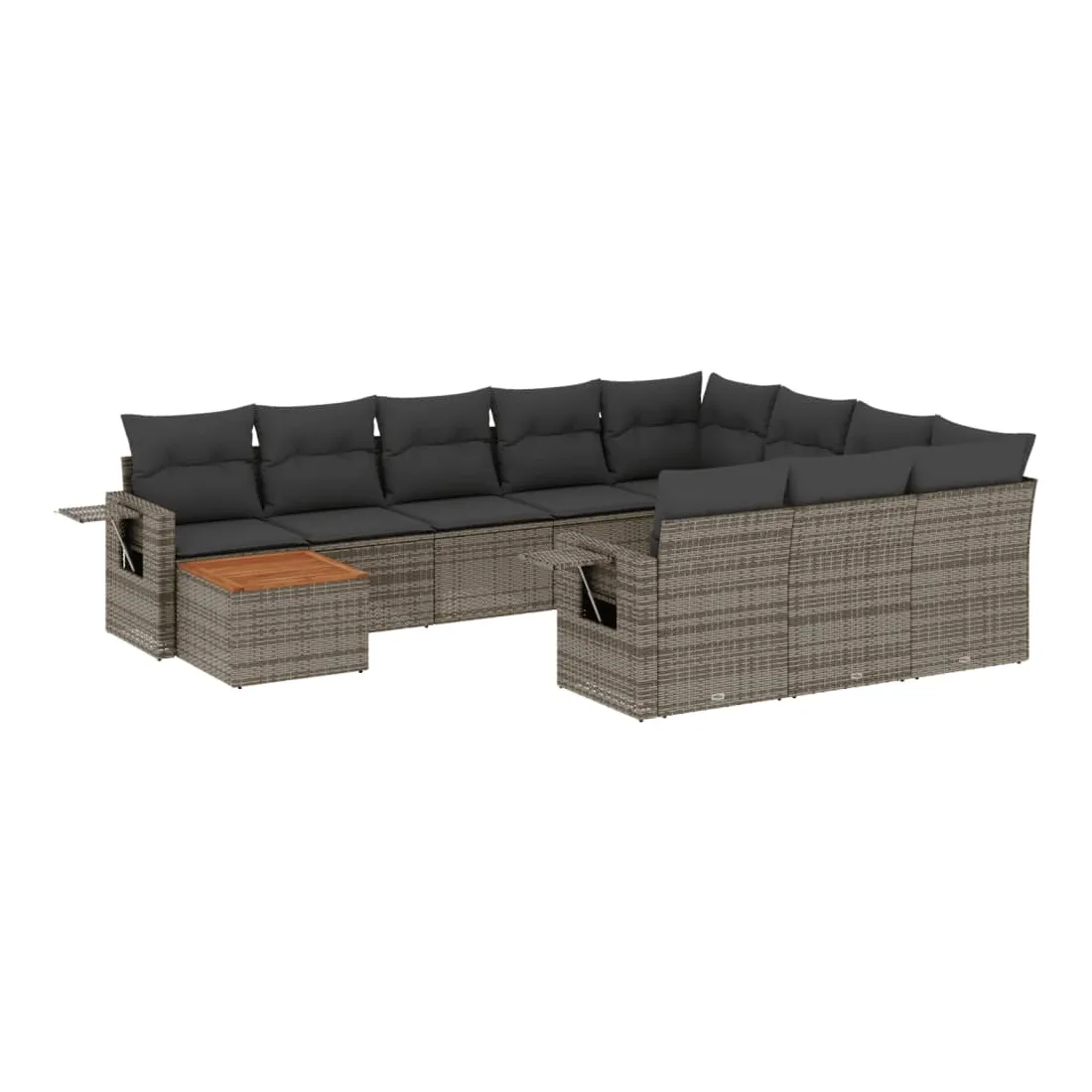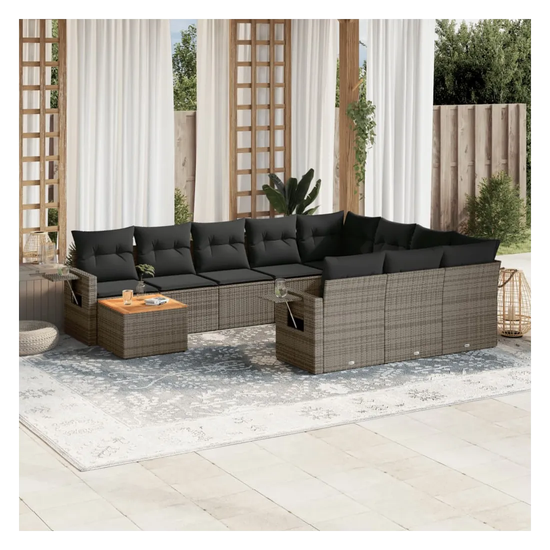 Cet ensemble de canapés de jardin est le complément parfait de votre arrière-cour, terrasse ou patio, offrant un espace confortable et accueillant pour discuter avec la famille et les amis ou simplement se détendre et profiter de l'extérieur. Matériau durable : la résine tressée, également connue sous le nom de poly rotin, est un matériau synthétique solide et nécessitant peu d'entretien qui ressemble au rotin naturel. Il est léger, facile à nettoyer et couramment utilisé pour les meubles d'extérieur en raison de sa durabilité et de ses propriétés de résistance aux intempéries.Table d'appoint pratique : ce mobilier d'extérieur comprend une table d'appoint pliable avec un ressort à gaz sur les accoudoirs, offrant un endroit pratique pour garder vos essentiels à portée de main.Dessus stable et facile à nettoyer : cette table de jardin a un dessus en bois d'acacia robuste, durable et facile à nettoyer avec un chiffon humide.Housse amovible et lavable : ces coussins de siège sont dotés de housses amovibles pour un lavage et un entretien faciles.Conception modulaire : cet ensemble de meubles d'extérieur a une conception modulaire, ce qui le rend complètement flexible et facile à déplacer, afin que vous puissiez créer un agencement de meubles d'extérieur personnalisé. Bon à savoir :Pour que vos meubles d'extérieur restent beaux, nous vous recommandons de les protéger avec une housse imperméable.