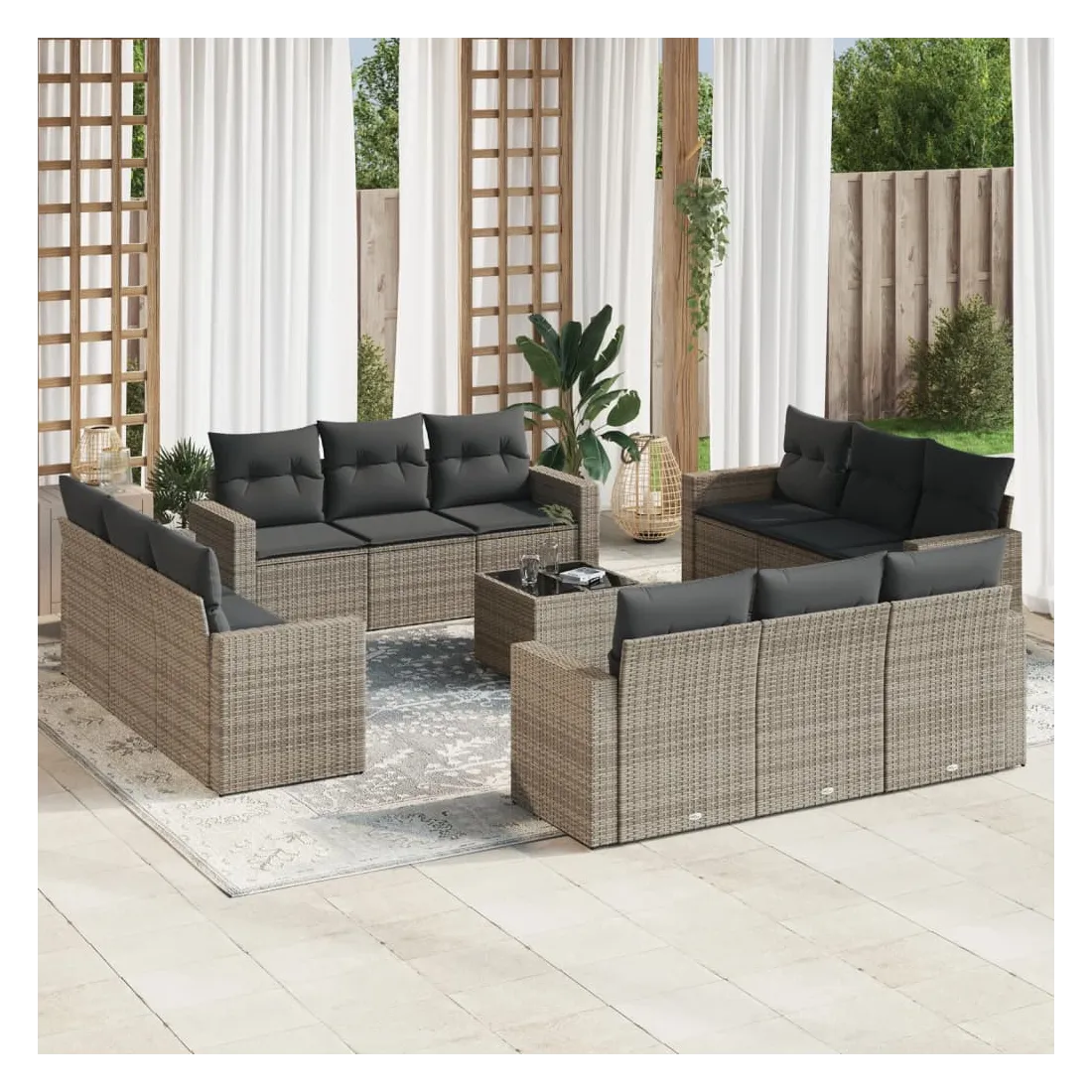 Cet ensemble de canapés de jardin est le complément parfait de votre arrière-cour, terrasse ou patio, offrant un espace confortable et accueillant pour discuter avec la famille et les amis ou simplement se détendre et profiter de l'extérieur. Matériau durable : la résine tressée, également connue sous le nom de poly rotin, est un matériau synthétique solide et nécessitant peu d'entretien qui ressemble au rotin naturel. Il est léger, facile à nettoyer et couramment utilisé pour les meubles d'extérieur en raison de sa durabilité et de ses propriétés de résistance aux intempéries.Fonction de rangement avec sac résistant à l'eau : chaque siège de jardin dispose d'un espace de rangement sous l'assise, complété par un sac résistant à l'eau pour ranger les coussins, les jouets et d'autres objets. Les sacs intérieurs sont dotés d'un couvercle et peuvent être solidement fixés aux sièges à l'aide de bandes auto-agrippantes pour plus de stabilité.Dessus en verre : le dessus de la table d'extérieur est fabriqué en verre trempé solide et durable, ce qui le rend facile à nettoyer avec un chiffon humide et ajoute une touche d'élégance à votre espace extérieur.Housse amovible et lavable : ces coussins de siège sont dotés de housses amovibles pour un lavage et un entretien faciles.Conception modulaire : cet ensemble de meubles d'extérieur a une conception modulaire, ce qui le rend complètement flexible et facile à déplacer, afin que vous puissiez créer un agencement de meubles d'extérieur personnalisé. Bon à savoir :Pour que vos meubles d'extérieur restent beaux, nous vous recommandons de les protéger avec une housse imperméable.