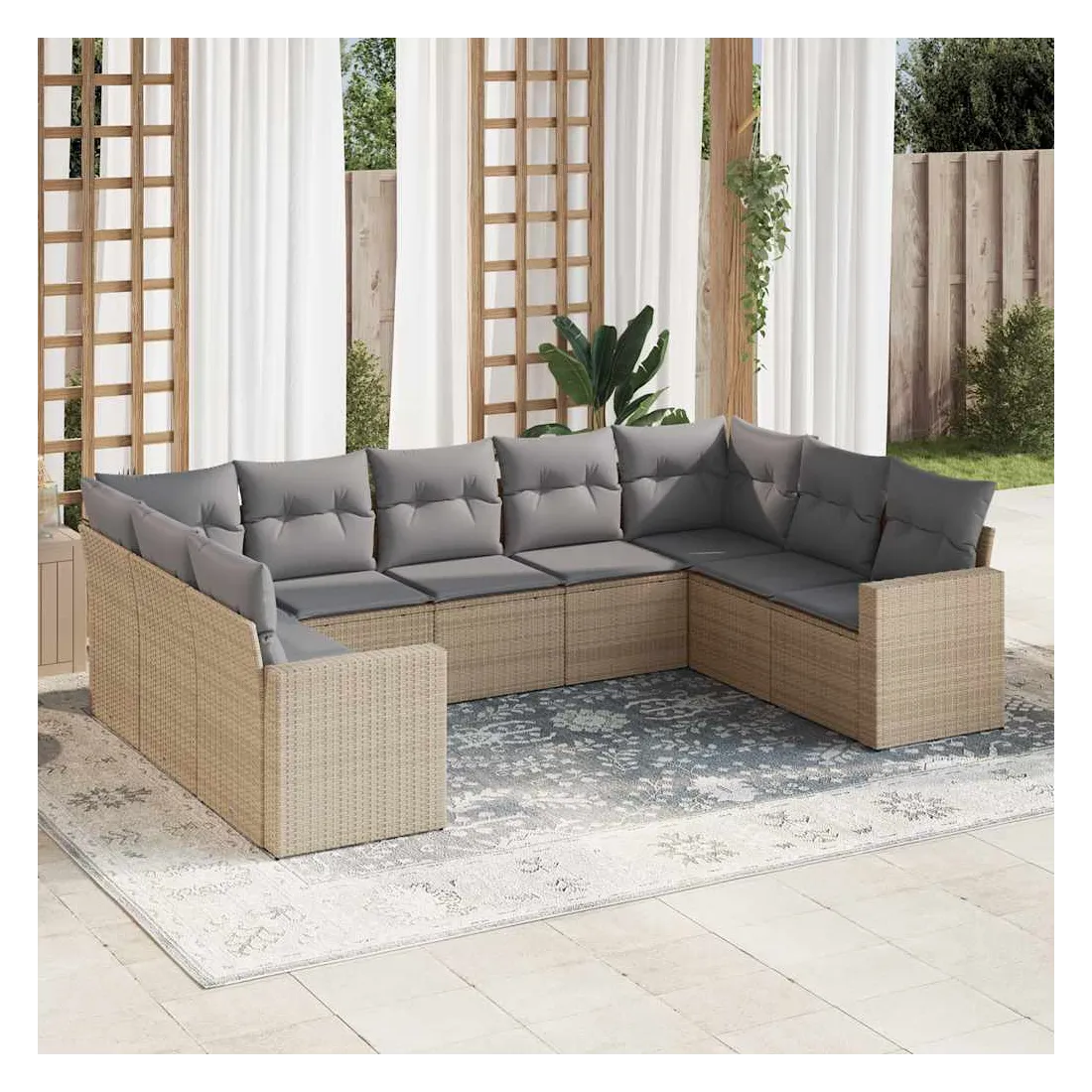 Cet ensemble de canapés de jardin est le complément parfait de votre arrière-cour, terrasse ou patio, offrant un espace confortable et accueillant pour discuter avec la famille et les amis ou simplement se détendre et profiter de l'extérieur. Matériau durable : la résine tressée, également connue sous le nom de poly rotin, est un matériau synthétique solide et nécessitant peu d'entretien qui ressemble au rotin naturel. Il est léger, facile à nettoyer et couramment utilisé pour les meubles d'extérieur en raison de sa durabilité et de ses propriétés de résistance aux intempéries.Fonction de rangement avec sac résistant à l'eau : chaque siège de jardin dispose d'un espace de rangement sous l'assise, complété par un sac résistant à l'eau pour ranger les coussins, les jouets et d'autres objets. Les sacs intérieurs sont dotés d'un couvercle et peuvent être solidement fixés aux sièges à l'aide de bandes auto-agrippantes pour plus de stabilité.Expérience d'assise confortable : ce mobilier d'extérieur, doté de coussins épais, offre une expérience d'assise confortable.Housse amovible et lavable : ces coussins de siège sont dotés de housses amovibles pour un lavage et un entretien faciles.Conception modulaire : cet ensemble de meubles d'extérieur a une conception modulaire, ce qui le rend complètement flexible et facile à déplacer, afin que vous puissiez créer un agencement de meubles d'extérieur personnalisé. Bon à savoir :Pour que vos meubles d'extérieur restent beaux, nous vous recommandons de les protéger avec une housse imperméable.