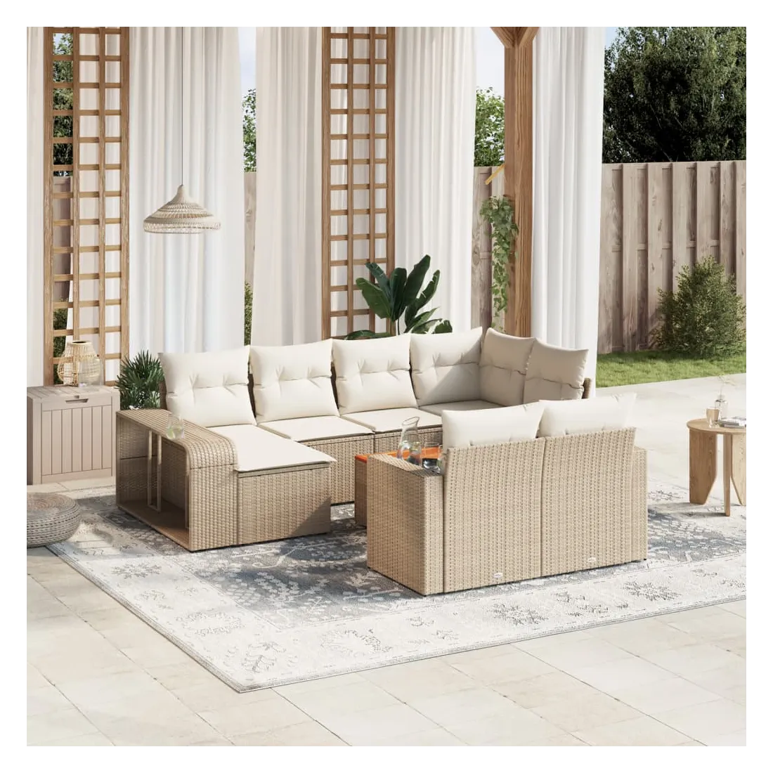Cet ensemble de canapés de jardin est le complément parfait de votre arrière-cour, terrasse ou patio, offrant un espace confortable et accueillant pour discuter avec la famille et les amis ou simplement se détendre et profiter de l'extérieur. Matériau durable : la résine tressée, également connue sous le nom de poly rotin, est un matériau synthétique solide et nécessitant peu d'entretien qui ressemble au rotin naturel. Il est léger, facile à nettoyer et couramment utilisé pour les meubles d'extérieur en raison de sa durabilité et de ses propriétés de résistance aux intempéries.Fonction de rangement avec sac résistant à l'eau : chaque siège de jardin dispose d'un espace de rangement sous l'assise, complété par un sac résistant à l'eau pour ranger les coussins, les jouets et d'autres objets. Les sacs intérieurs sont dotés d'un couvercle et peuvent être solidement fixés aux sièges à l'aide de bandes auto-agrippantes pour plus de stabilité.Dessus stable et facile à nettoyer : cette table de jardin a un dessus en bois d'acacia robuste, durable et facile à nettoyer avec un chiffon humide.Housse amovible et lavable : ces coussins de siège sont dotés de housses amovibles pour un lavage et un entretien faciles.Conception modulaire : cet ensemble de meubles d'extérieur a une conception modulaire, ce qui le rend complètement flexible et facile à déplacer, afin que vous puissiez créer un agencement de meubles d'extérieur personnalisé. Bon à savoir :Pour que vos meubles d'extérieur restent beaux, nous vous recommandons de les protéger avec une housse imperméable.