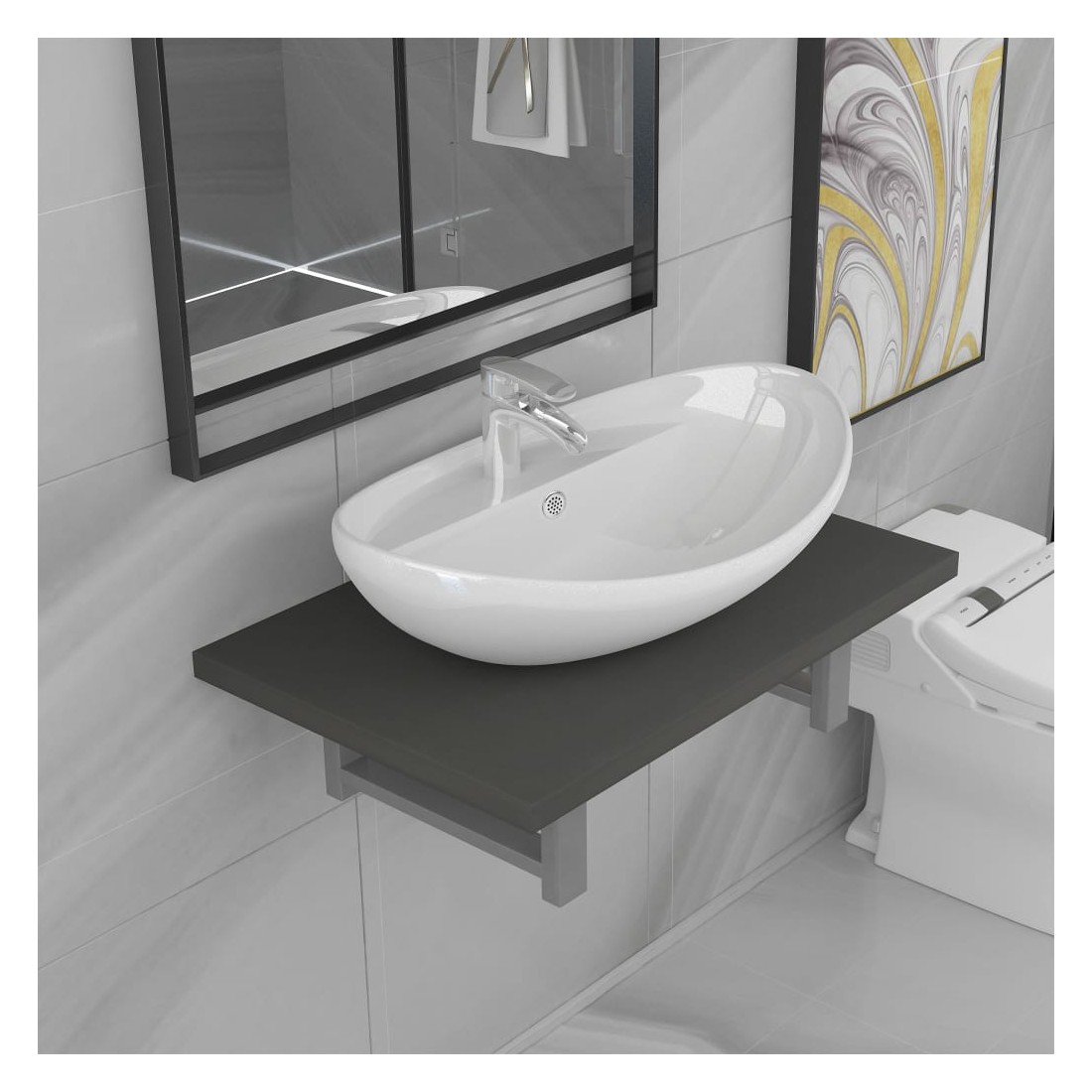 Notre ensemble de meubles de salle de bain pratique et intemporel se compose d'une étagère murale et d'un lavabo de forme ovale. Il fera un ajout élégant à toute salle de bain, salle d'eau ou toilette. Fabriquée dans un matériau solide, l'étagère murale de salle de bain est extrêmement stable et durable, ce qui en fait l'endroit idéal pour placer le lavabo en céramique inclus. Ce lavabo en céramique a une finition brillante et est facile à nettoyer avec un chiffon humide. De plus, les meubles de salle de bain peuvent être facilement installés sur le mur avec nos supports et matériaux de montage inclus. La combinaison parfaite de l'étagère murale et du lavabo sera le point d'attention de votre salle de bain ! Veuillez noter qu'aucun drain n'est inclus dans la livraison.