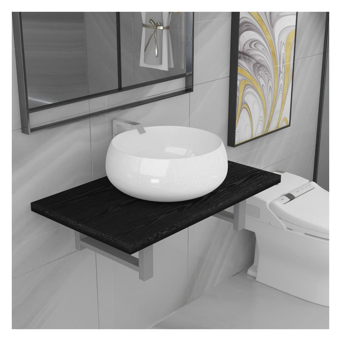 Notre ensemble de meubles de salle de bain pratique et intemporel se compose d'une étagère murale et d'un lavabo de forme ronde. Il fera un ajout élégant à toute salle de bain, salle d'eau ou toilette. Fabriquée dans un matériau solide, l'étagère murale de salle de bain est extrêmement stable et durable, ce qui en fait l'endroit idéal pour placer le lavabo en céramique inclus. Ce lavabo en céramique a une finition brillante et est facile à nettoyer avec un chiffon humide. De plus, les meubles de salle de bain peuvent être facilement installés sur le mur avec nos supports et matériaux de montage inclus. La combinaison parfaite de l'étagère murale et du lavabo sera le point d'attention de votre salle de bain ! Veuillez noter qu'aucun drain n'est inclus dans la livraison.