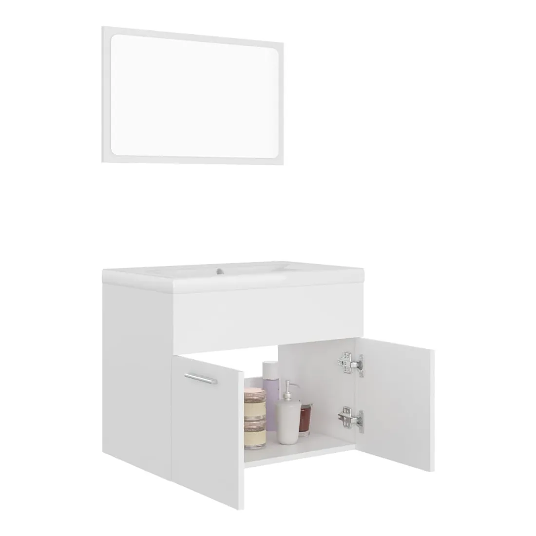 Cet ensemble de meubles de salle de bain élégant, qui se compose d'un meuble lavabo, d'un lavabo intégré et d'un miroir, s'agence parfaitement à votre salle de bain ou toilette avec un aspect saisissant et bien rangé. L'armoire d'évier est en aggloméré, ce qui la rend robuste et stable. L'armoire a 1 compartiment et 2 portes, offrant amplement d'espace pour ranger des objets. Elle s'intègre parfaitement sous l'évier et rend le rangement de la salle de bain très pratique. Fabriqué en céramique, le lavabo peut non seulement servir de récipient pour un usage quotidien, mais également d'ornement dans votre espace de vie. Grâce à son design avant-gardiste et contemporain, ce lavabo s'adaptera à n'importe quel décor. Un trop-plein est également équipé pour évacuer l'eau lorsqu'il est trop plein. Sa surface vitrée lui confère un design à la fois moderne et élégant. Le miroir ajoute également une excellente apparence à votre décoration intérieure. De plus, cet ensemble est facile à nettoyer avec un chiffon humide. Veuillez noter que le robinet et le drain ne sont pas inclus dans la livraison.
