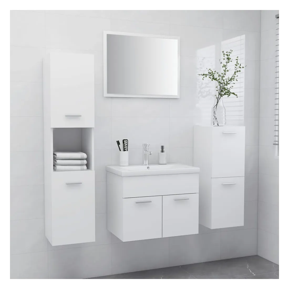 Avec cet élégant ensemble de meubles de salle de bain, vous pouvez créer un espace de rangement supplémentaire pour votre salle de bain avec un aspect remarquable et bien rangé. Les lignes épurées et le design élégant s'intègrent parfaitement à votre salle de bain. L'ensemble de meubles comprend une armoire de lavabo avec lavabo, une armoire basse, une armoire haute et un miroir. L’armoire de lavabo chic a 1 compartiment et s’adapte parfaitement sous votre évier, ce qui rend le rangement de votre salle de bain très pratique. Fabriqué en céramique, le lavabo peut non seulement servir de récipient pour une utilisation quotidienne, mais aussi une parure dans votre espace de vie. Grâce à son design tendance et contemporain, ce lavabo conviendra à tout décor. Un trop-plein est également équipé pour vidanger l’eau lorsqu'il est trop plein. L’armoire haute dispose d’un total de 5 compartiments et 2 portes tandis que l’armoire basse dispose de 2 compartiments. Ces 2 armoires offrent diverses options de rangement et un espace supplémentaire pour ranger des articles dans votre salle de bain. Le miroir ajoute également une excellente apparence à votre décoration intérieure. De plus, cet ensemble de salle de bains est facile à nettoyer avec un chiffon humide. Veuillez noter que le robinet et le drain ne sont pas inclus dans la livraison.