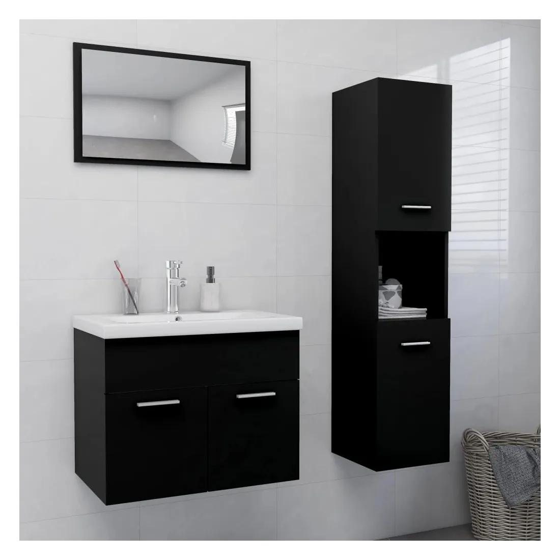vidaXLAvec cet élégant ensemble de meubles de salle de bain, vous pouvez créer un espace de rangement supplémentaire pour votre salle de bain avec un aspect remarquable et bien rangé. Les lignes épurées et le design élégant s'intègrent parfaitement à votre salle de bain. L’ensemble de meubles se compose d’une armoire de lavabo, d’une armoire haute, d’un lavabo encastré et d’un miroir. L’armoire de lavabo chic a 1 compartiment et le dessus de celle-ci est idéal pour placer l’évier. L’armoire haute dispose d’un total de 5 compartiments et de 2 portes, offrant ainsi un espace suffisant pour ranger les objets de votre salle de bain. Fabriqué en céramique, ce lavabo peut non seulement servir de récipient pour une utilisation quotidienne, mais aussi comme ornement dans votre espace de vie. Grâce à son design tendance et contemporain, ce lavabo conviendra à tout décor. Un trop-plein est équipé pour vidanger l’eau quand il est trop plein. Le miroir ajoute également une excellente apparence à votre décoration intérieure. De plus, cet ensemble de salle de bain est facile à nettoyer avec un chiffon humide. Remarque : le robinet et l'égouttoir à poussoir avec fonction de trop-plein sont inclus dans la livraison.