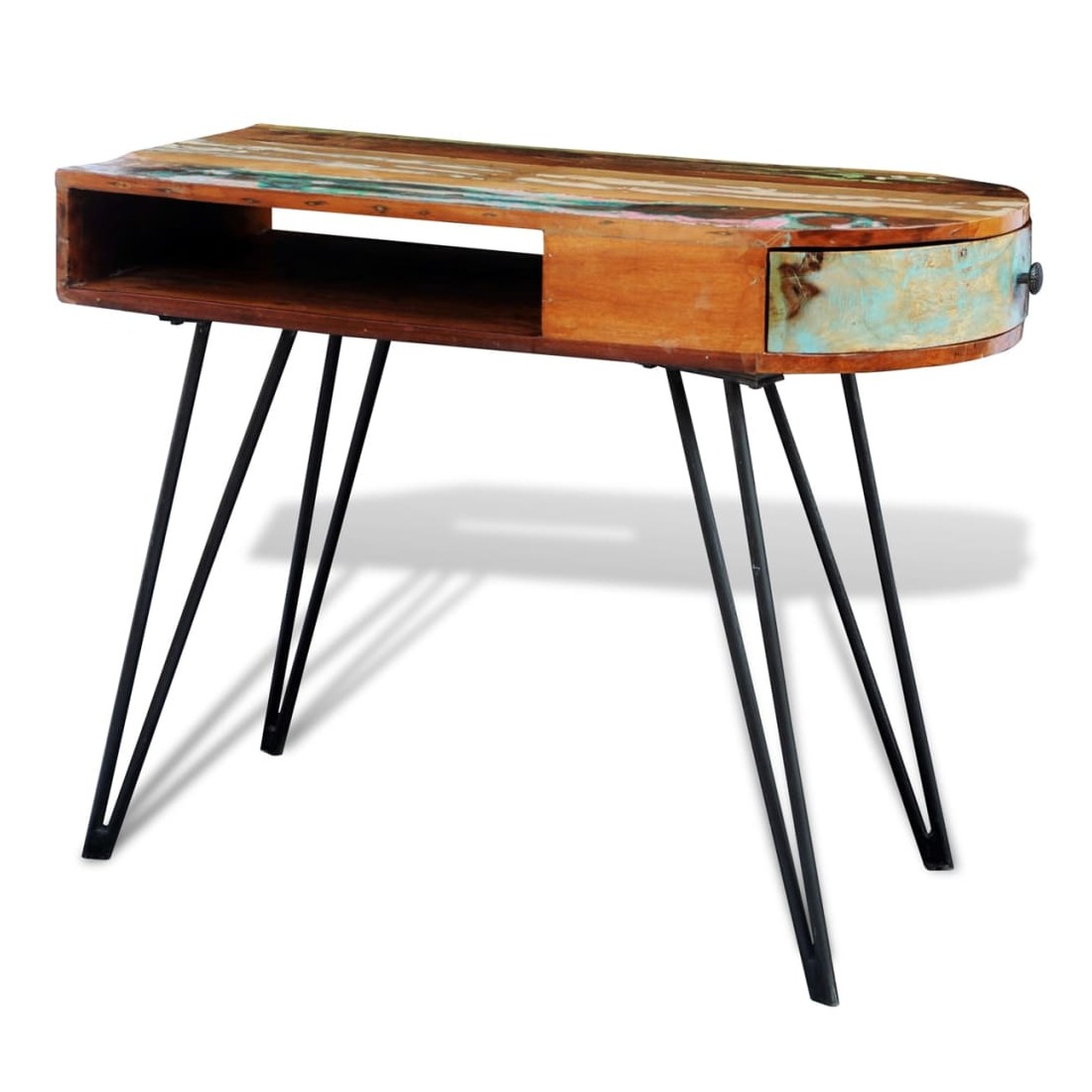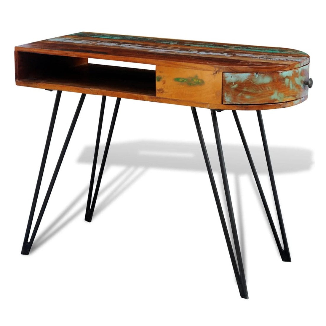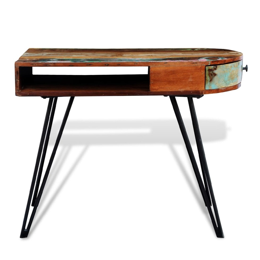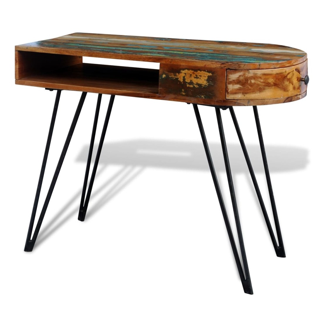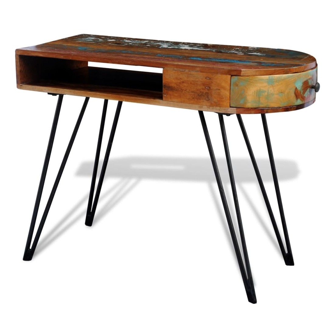 Ce bureau en bois de récupération de style antique, avec un dessus de table multicolore et 4 pieds en fer durables, est un accessoire intemporel pour votre maison. Son dessus en bois massif de récupération offre une surface stable et sécurisée pour y placer vos ordinateurs, tablettes, livres ou ornements. Le bureau a un compartiment sous le dessus de table et un tiroir latéral, qui vous offrira un espace de stockage supplémentaire. Le bureau est fait de bois de récupération, ce qui signifie que chaque meuble est unique et légèrement différent l'un de l'autre. Le mobilier fabriqué à partir de bois de récupération a des caractéristiques de différents bois comme le bois de teck, l'acacia, le bois de manguier, le bois de saal etc. Le bois de récupération est solide, stable, durable et beau. Les trous de clous ou les grains à face claire apportent leur histoire avec eux et invitent une autre génération à les imprégner des leurs. Garder ce meuble à la maison montrera votre concept de conservation des ressources, de protection de l'environnement et de développement durable. En outre, l'artisanat à la main ajoute un style spectaculaire vintage au bureau et dégage de l'exotisme. Chaque processus de recombinaison, de polissage, de peinture et de cirage est minutieusement préparé. Le bureau vintage sera sûrement un supplément parfait à votre maison ! Remarque importante : les couleurs varient d'un meuble à l'autre, rendant chacun de nos bureaux unique. La livraison est aléatoire, ce qui garantit l'exclusivité et l'individualité de votre produit.