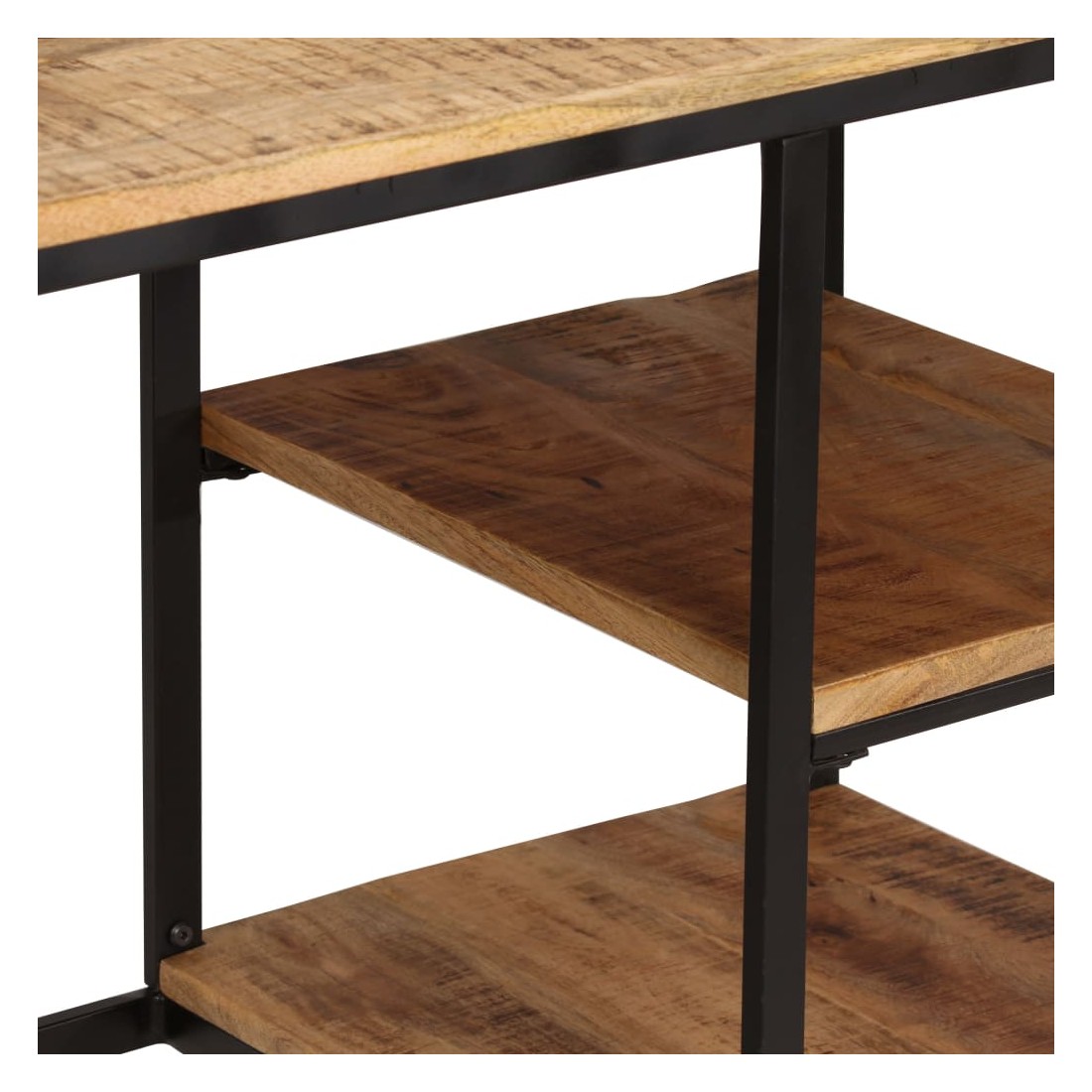 Ce bureau de style antique, livré avec un tabouret assorti, dégage un charme vintage et sera un excellent complément à votre lieu de travail ou chambre d'étude. Le tabouret et le bureau d'ordinateur sont en bois massif de manguier qui a reçu une belle finition par polissage et laquage pour lui donner un aspect raffiné. Les belles veines de bois rendent chaque meuble unique et légèrement différent l'un de l'autre. Ce bureau dispose de deux étagères qui offrent suffisamment d'espace pour ranger et organiser vos dossiers, papiers, documents et autres effets personnels. Les roulettes intégrées facilitent le déplacement du bureau. La structure en acier enduit de poudre ajoute à la stabilité du bureau et du tabouret ainsi qu'à leur style industriel. Le tabouret peut être plié pour faciliter