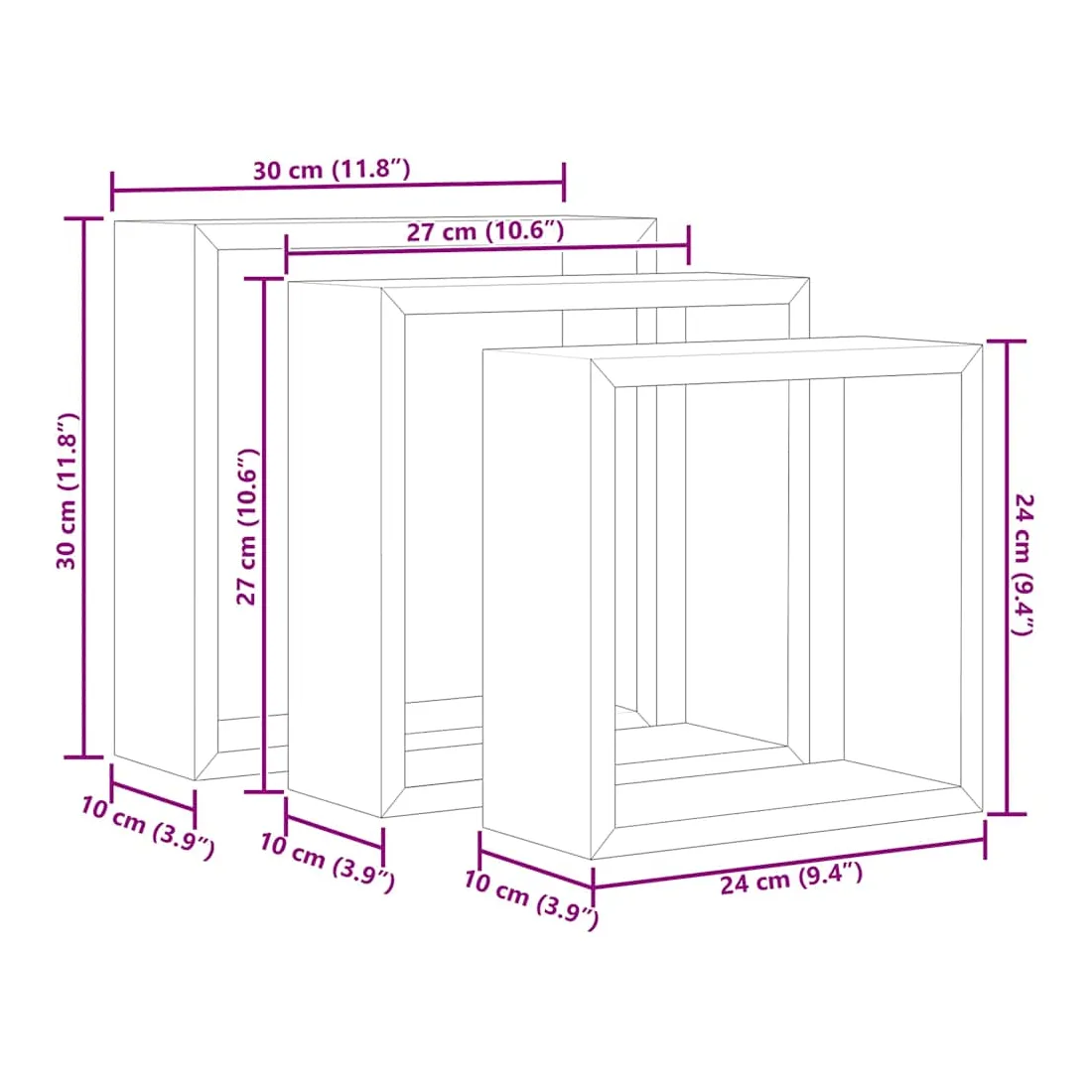 - Dimensions de la grande étagère sous forme de cube : 30 x 10 x 30 cm (l x P x H)