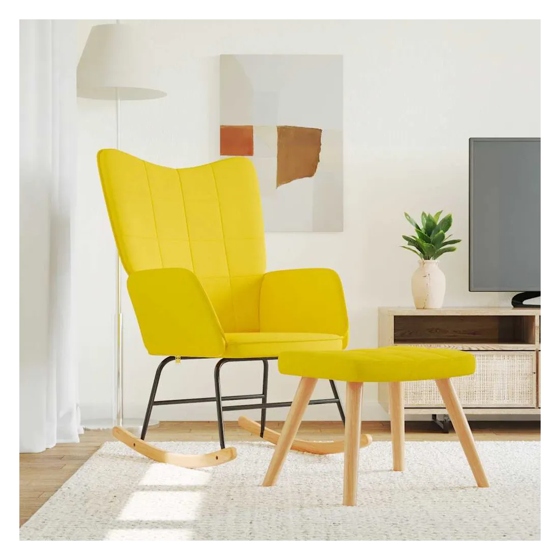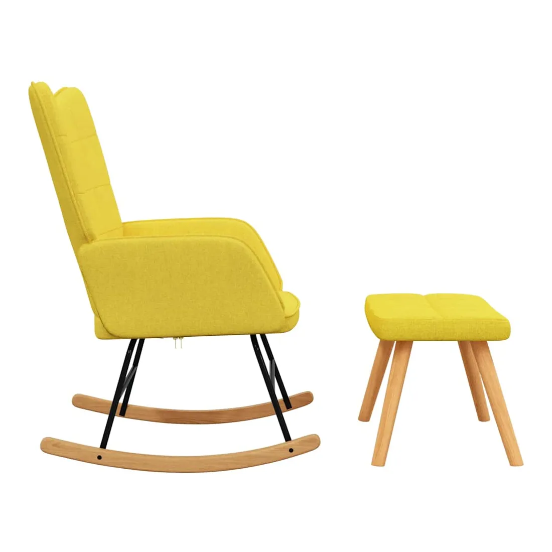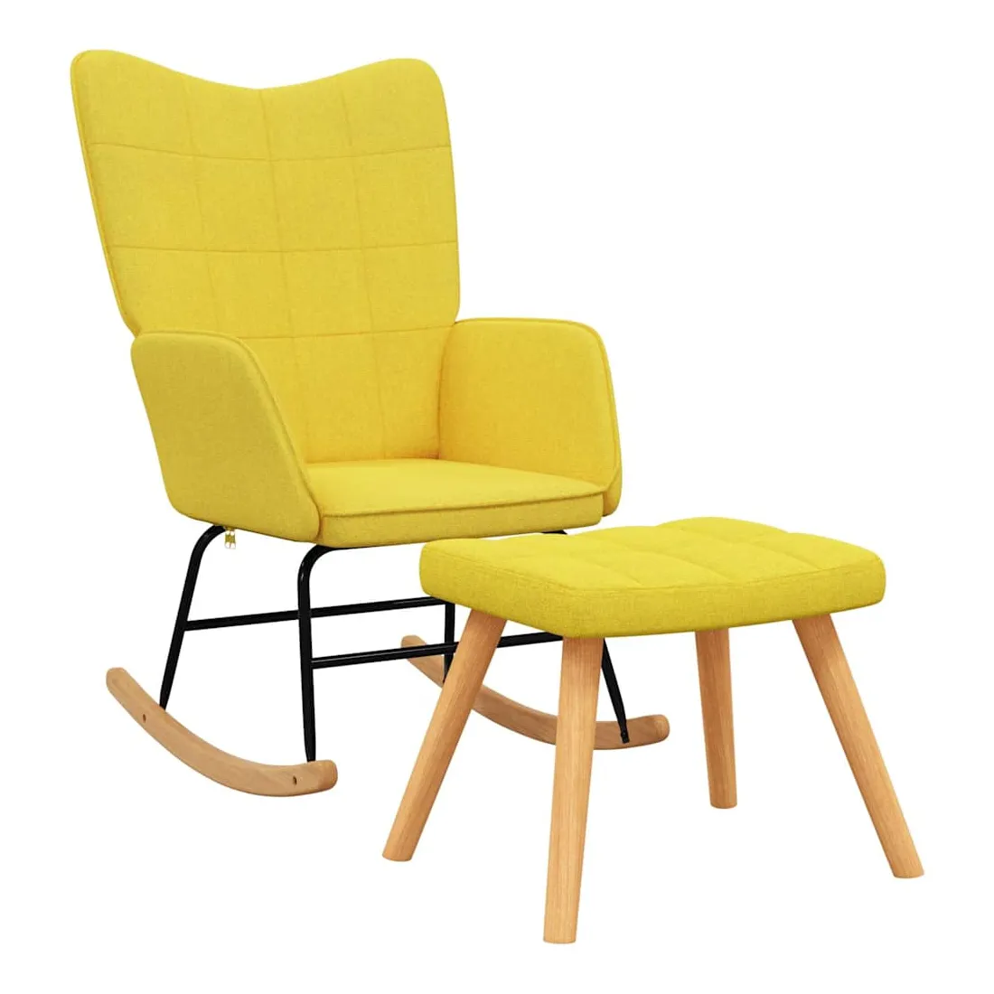 Cette chaise à bascule avec tabouret, au design chic et élégant, apportera une touche de modernité à votre décoration. Dotée de quelques blocs, cette chaise de relaxation est esthétique. Grâce à sa mousse rembourrée recouverte d'un tissu doux au toucher, vous pourrez profiter d'un confort optimal pendant votre temps d'assise. Avec la conception de longs rails à bascule, le fauteuil ne basculera pas facilement. De plus, soutenue par un cadre et des pieds en acier, ainsi que par des rails à bascule en bois, la chaise de salon avec tabouret est stable et durable.