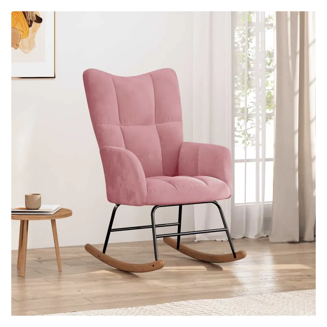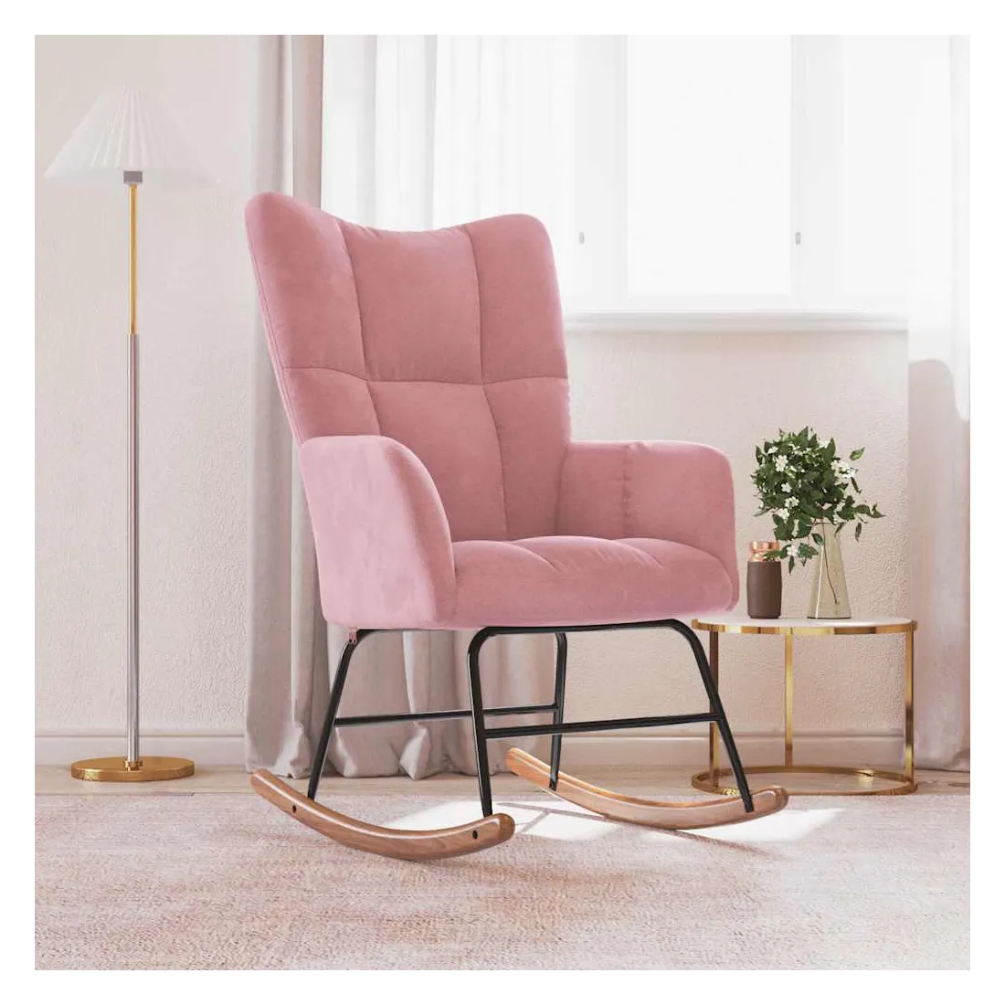 Cette chaise à bascule au design chic et élégant apporte une touche de modernité à votre décoration. Dotée de quelques blocs, cette chaise de relaxation est esthétique. Grâce à sa mousse bien rembourrée recouverte de velours doux au toucher, vous pourrez profiter d'un confort optimal pendant votre temps d'assise. Avec la conception de longs rails à bascule, le fauteuil ne basculera pas facilement. De plus, soutenue par un cadre et des pieds en acier, ainsi que par des rails à bascule en bois, la chaise de salon est stable et durable.