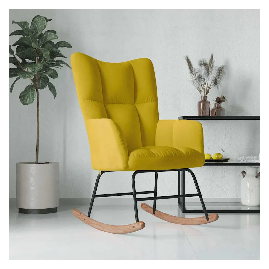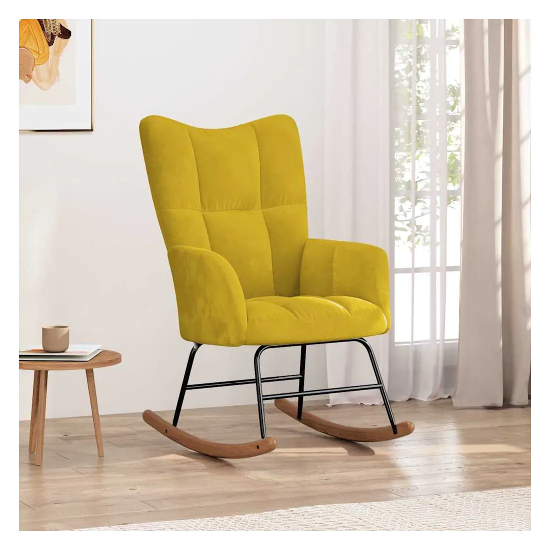 Cette chaise à bascule au design chic et élégant apporte une touche de modernité à votre décoration. Dotée de quelques blocs, cette chaise de relaxation est esthétique. Grâce à sa mousse bien rembourrée recouverte de velours doux au toucher, vous pourrez profiter d'un confort optimal pendant votre temps d'assise. Avec la conception de longs rails à bascule, le fauteuil ne basculera pas facilement. De plus, soutenue par un cadre et des pieds en acier, ainsi que par des rails à bascule en bois, la chaise de salon est stable et durable.