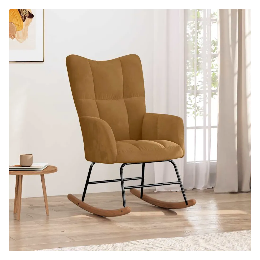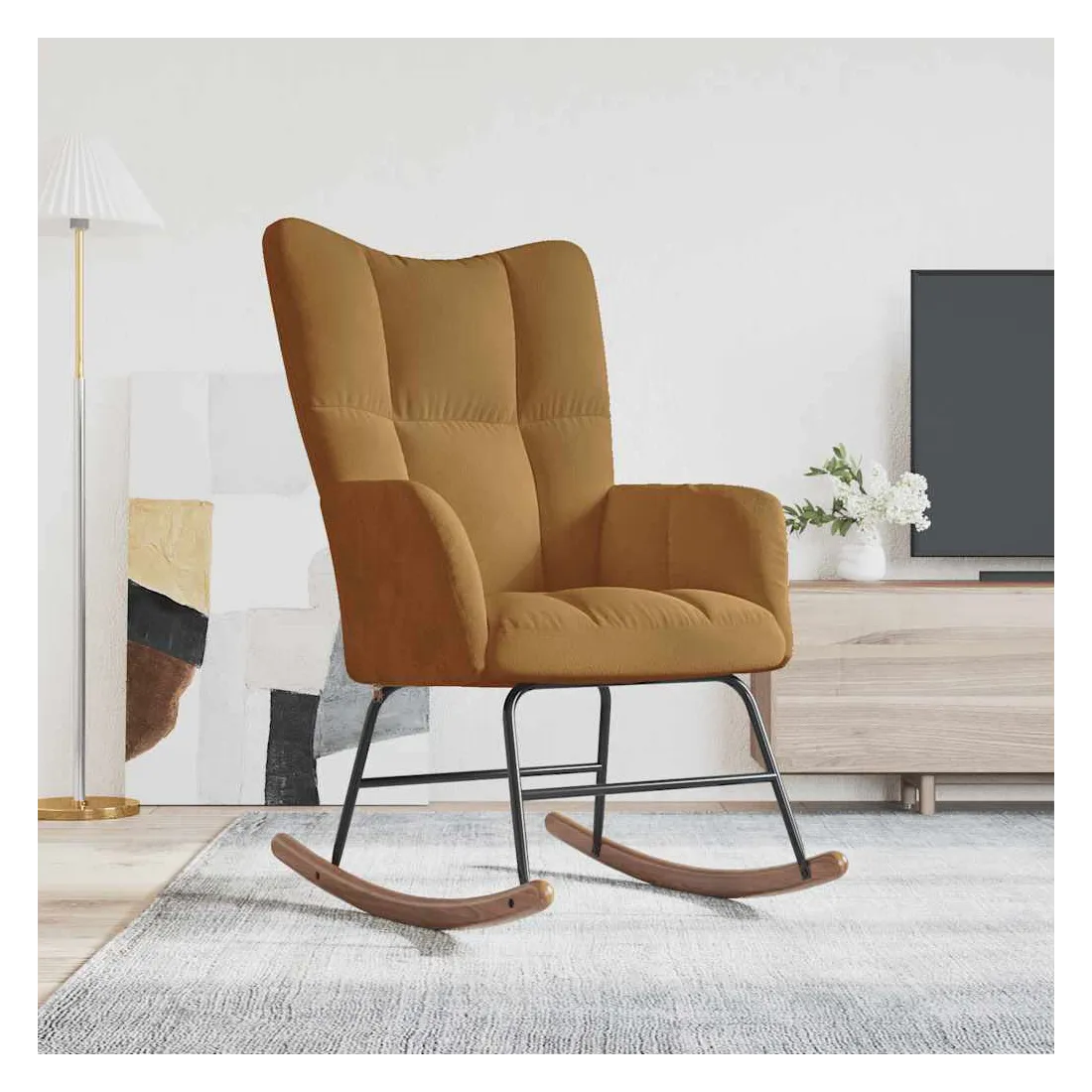 Cette chaise à bascule au design chic et élégant apporte une touche de modernité à votre décoration. Dotée de quelques blocs, cette chaise de relaxation est esthétique. Grâce à sa mousse bien rembourrée recouverte de velours doux au toucher, vous pourrez profiter d'un confort optimal pendant votre temps d'assise. Avec la conception de longs rails à bascule, le fauteuil ne basculera pas facilement. De plus, soutenue par un cadre et des pieds en acier, ainsi que par des rails à bascule en bois, la chaise de salon est stable et durable.