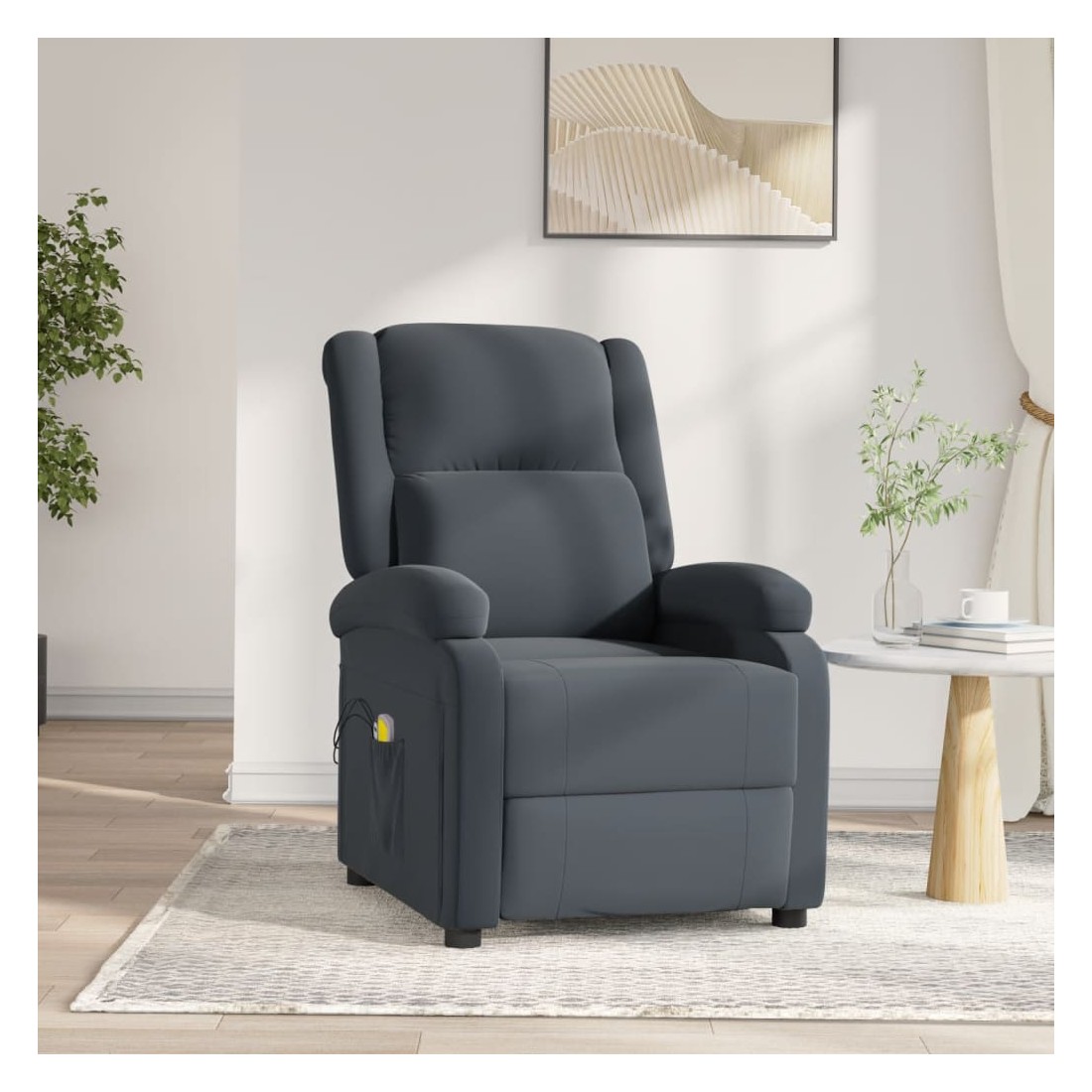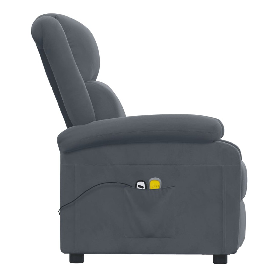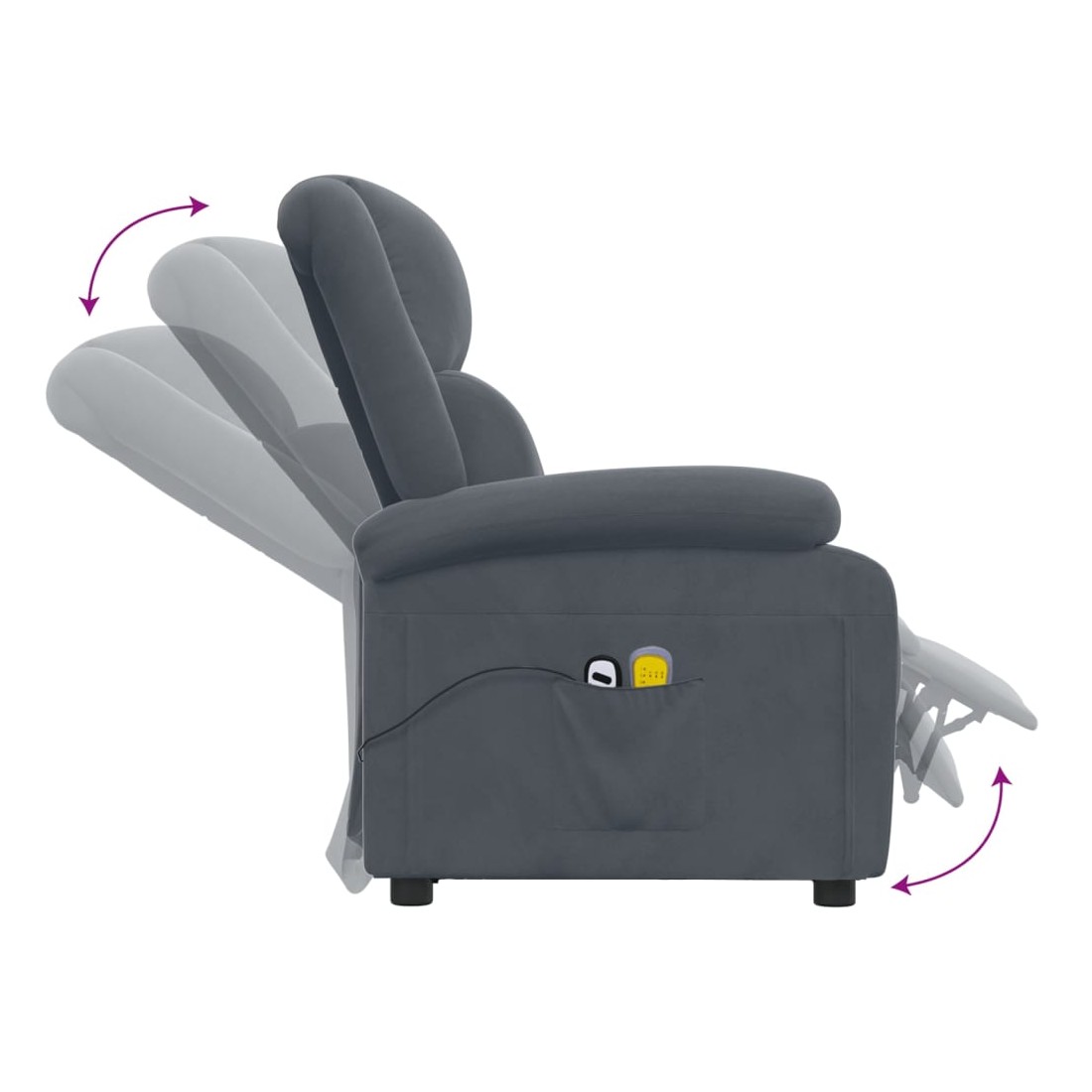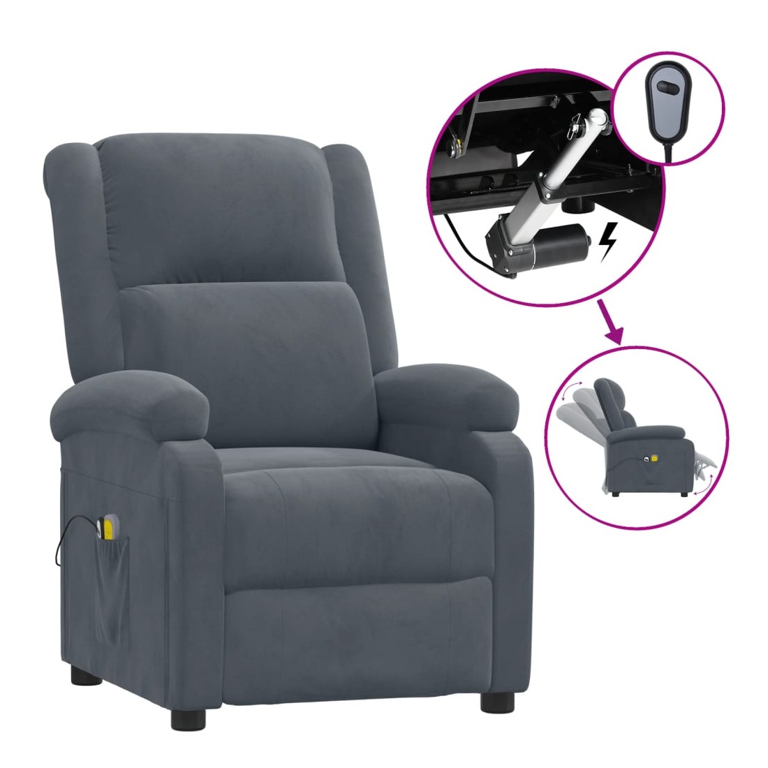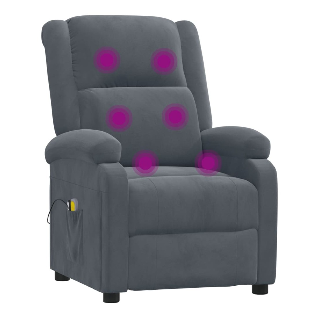 Asseyez-vous et détendez-vous dans ce fauteuil de massage électrique très confortable ! Fonction d'inclinaison électrique : le fauteuil inclinable est équipé d'un moteur électrique pour la fonction d'inclinaison. Il offre 3 positions d'inclinaison et vous pouvez facilement régler le dossier et le repose-pied à l'aide de la commande manuelle à 2 boutons incluse, en fonction de votre confort.Fonction de vibration : les 6 points de massage vous permettent de faire l'expérience d'un massage mieux ciblé. De plus, la télécommande incluse vous permet de choisir différents programmes de massage. La fonction de massage est alimentée par le connecteur USB, mais la source d'alimentation USB 5V certifiée n'est pas incluse.Expérience d'assise confortable : le siège, le dossier et les larges accoudoirs rembourrés épais recouverts de velours procurent une sensation confortable et chaleureuse, vous faisant vous sentir enlacé lorsque vous êtes assis. Le velours est un tissu doux et confortable qui est agréable sur la peau.Cadre solide et stable : le cadre en bois et en métal offre une structure solide et une grande stabilité. Ce fauteuil inclinable est confortable et durable.