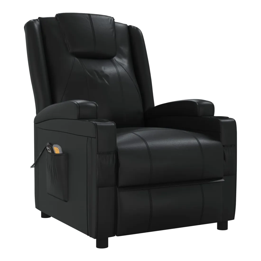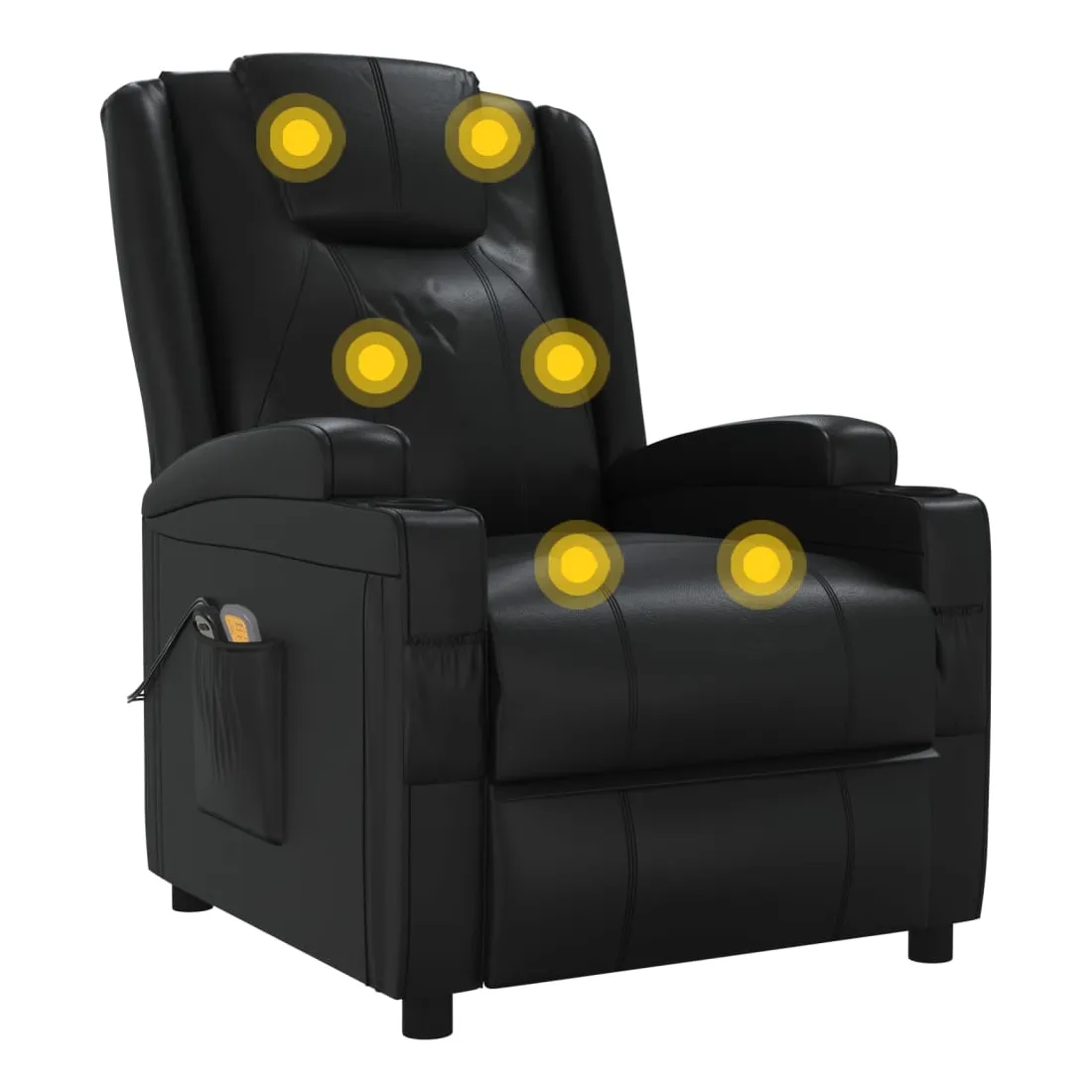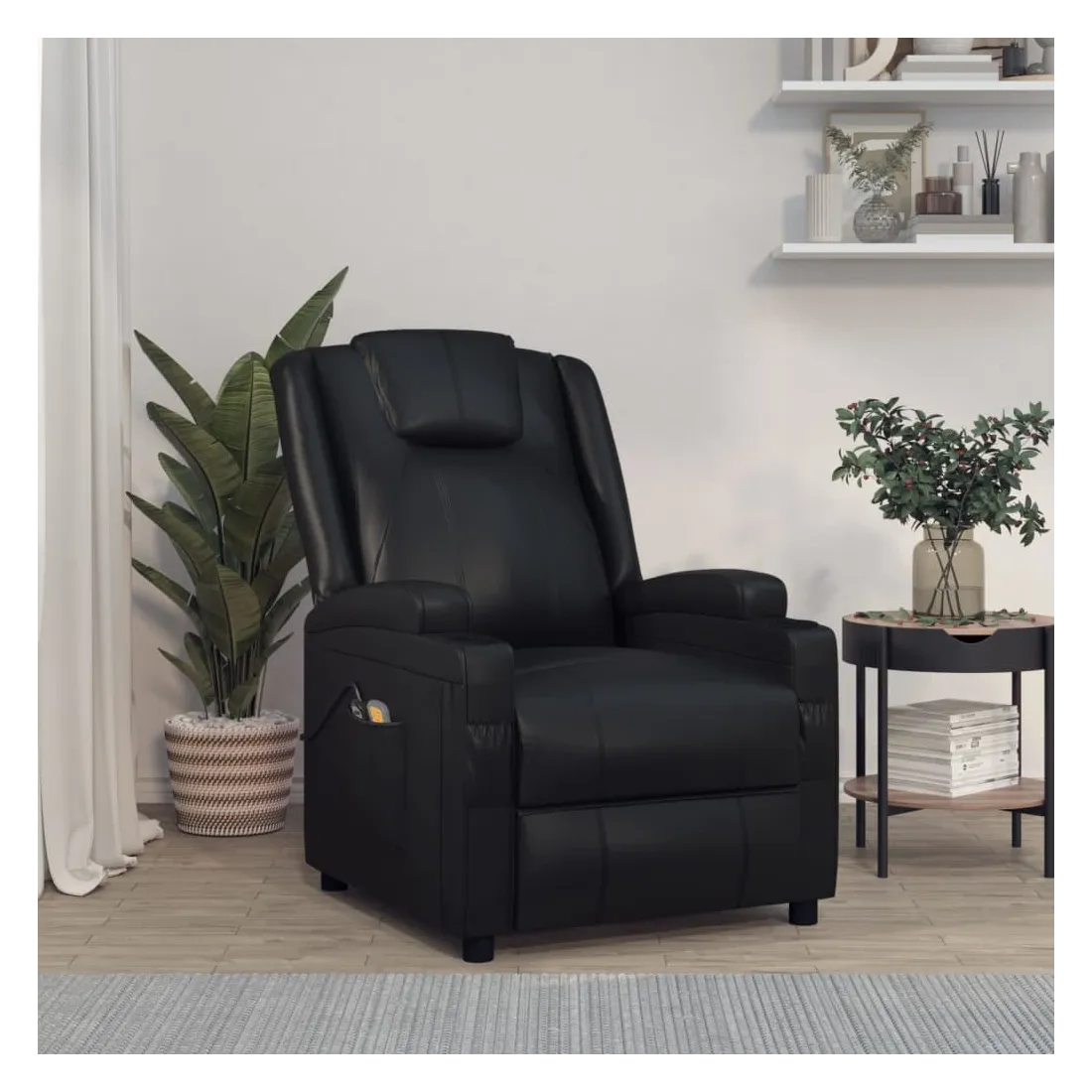 Asseyez-vous et détendez-vous dans ce fauteuil de massage très confortable ! Fonction d'inclinaison manuelle : le fauteuil inclinable est spécialement conçu avec 3 positions d'inclinaison afin que vous puissiez régler manuellement le dossier et le repose-pieds selon votre confort.Fonction de levage électrique : ce fauteuil inclinable pour personnes âgées est équipé d'un moteur électrique pour la fonction de levage. Grâce à la fonction qui pousse toute la chaise vers le haut, vous pouvez facilement vous tenir debout sans stresser votre dos et vos genoux grâce à la commande manuelle à 2 boutons.Fonction de vibration : les 6 points de massage vous permettent de faire l'expérience d'un massage mieux ciblé. De plus, la télécommande incluse vous permet de choisir différents programmes de massage. La fonction de massage est alimentée par le connecteur USB, mais la source d'alimentation USB 5V certifiée n'est pas incluse.Expérience de siège confortable : le siège, le dossier et les larges accoudoirs rembourrés épais recouverts de similicuir procurent une sensation confortable et chaleureuse, vous faisant vous sentir enlacé lorsque vous êtes assis. Le simili cuir est un matériau très résistant. Il est résistant aux taches, ce qui le rend facile à nettoyer avec un chiffon humide. La surface lisse donne également un aspect luxueux et la beauté du cuir véritable.Cadre solide et stable : le cadre en bois et en métal offre une structure solide et une grande stabilité. Ce fauteuil inclinable est confortable et durable.