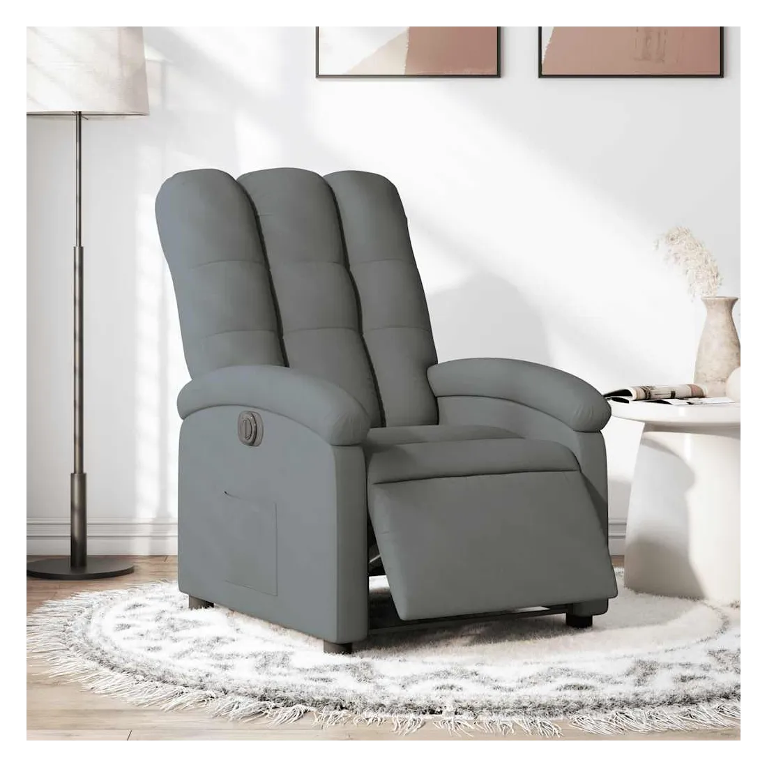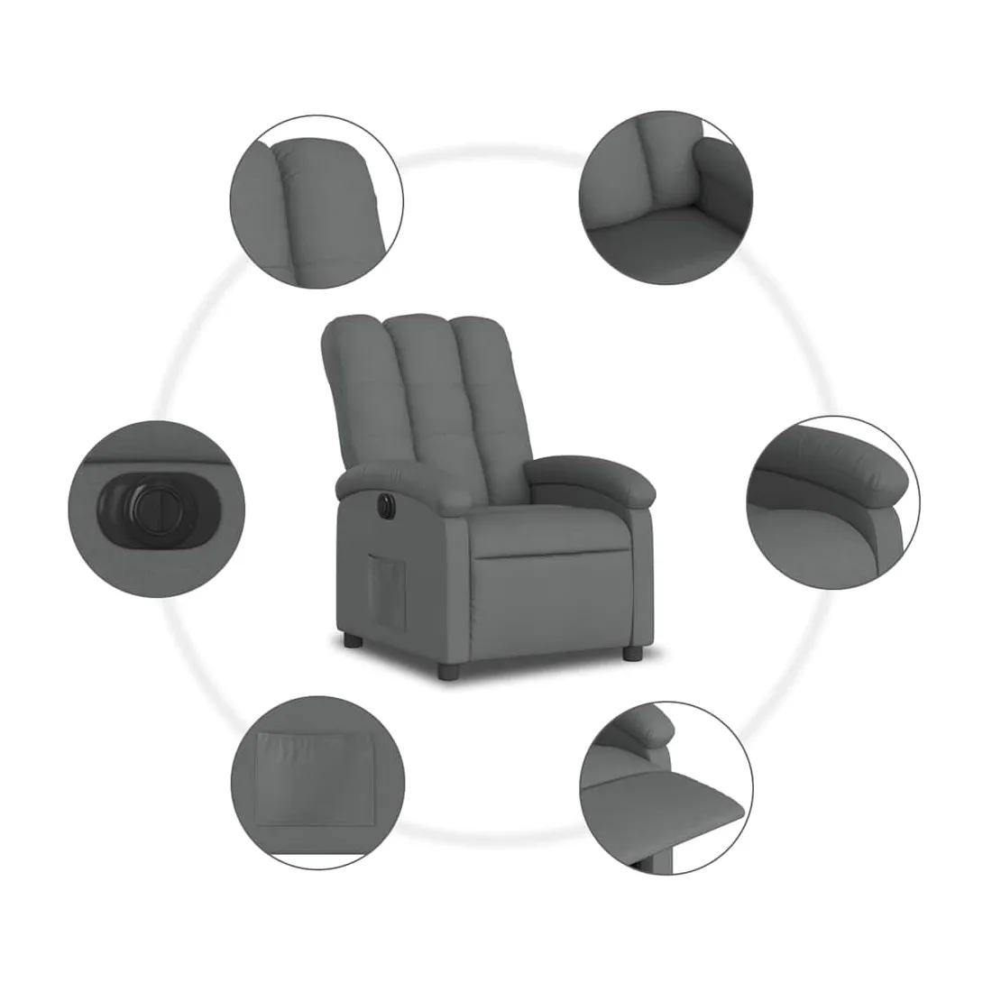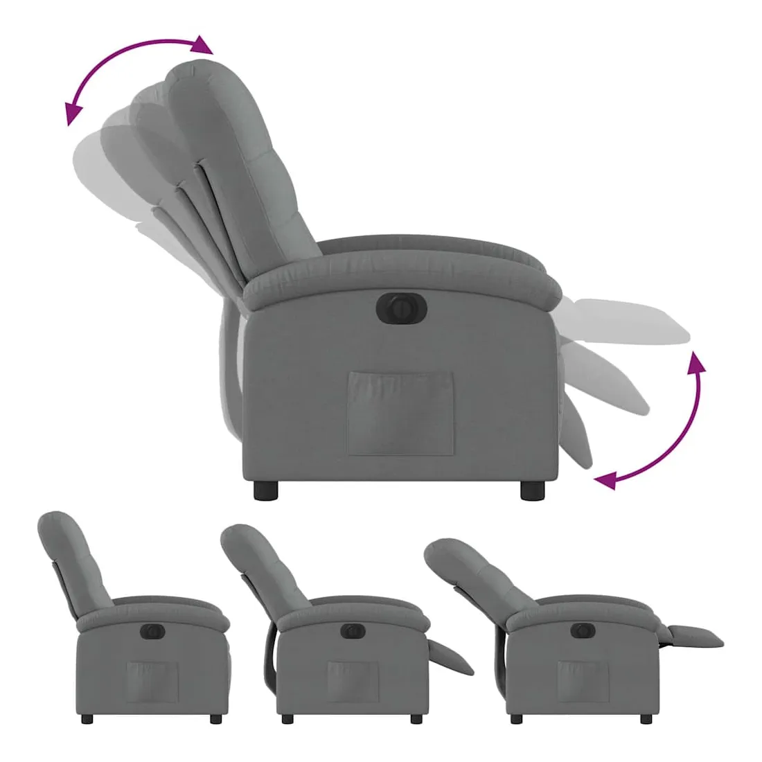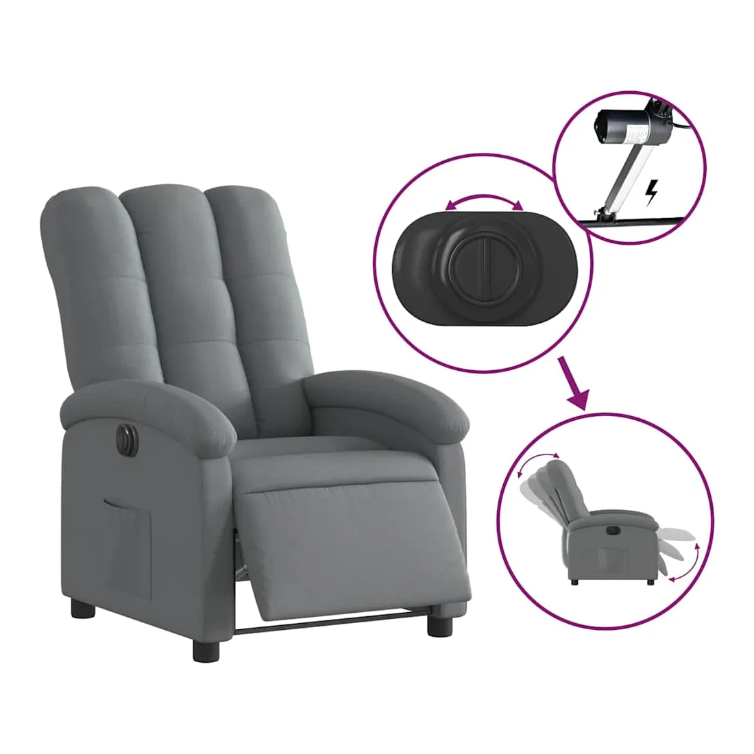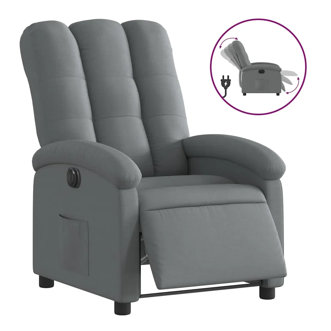 Asseyez-vous et détendez-vous dans ce fauteuil inclinable électrique très confortable ! Fonction d'inclinaison électrique : ce fauteuil inclinable est équipé d'un moteur électrique qui permet de régler automatiquement le repose-pied et le dossier dans n'importe quelle position, selon votre confort, en appuyant simplement sur le bouton situé sur le côté du fauteuil. Cette fonction permet une inclinaison maximale de 135 degrés. En outre, le dossier peut revenir automatiquement à sa position d'origine par une simple pression sur le bouton.Expérience d'assise confortable : le siège, le dossier et les larges accoudoirs bien rembourrés recouverts de tissu procurent une sensation confortable et chaleureuse, vous permettant de vous sentir enveloppé lorsque vous êtes assis. Le tissu présente un aspect simple et épuré et est respirant et durable.Poche latérale pratique : ce fauteuil est doté d'une poche latérale pour vous permettre de garder vos objets essentiels à portée de main.Cadre solide et stable : le cadre en bois et en métal offre une structure solide et une grande stabilité. Ce fauteuil inclinable est confortable et durable.