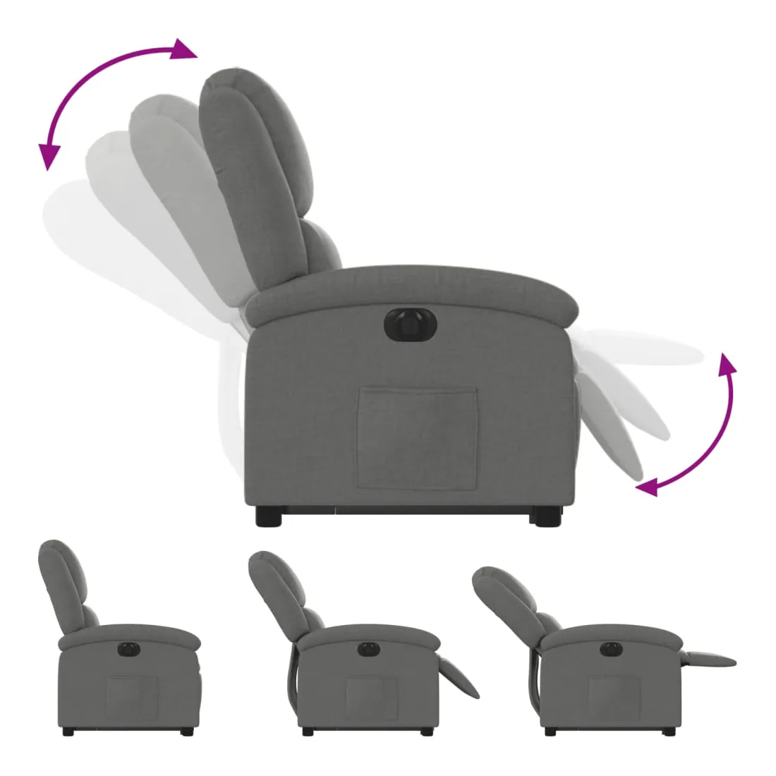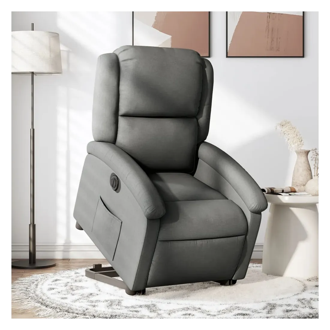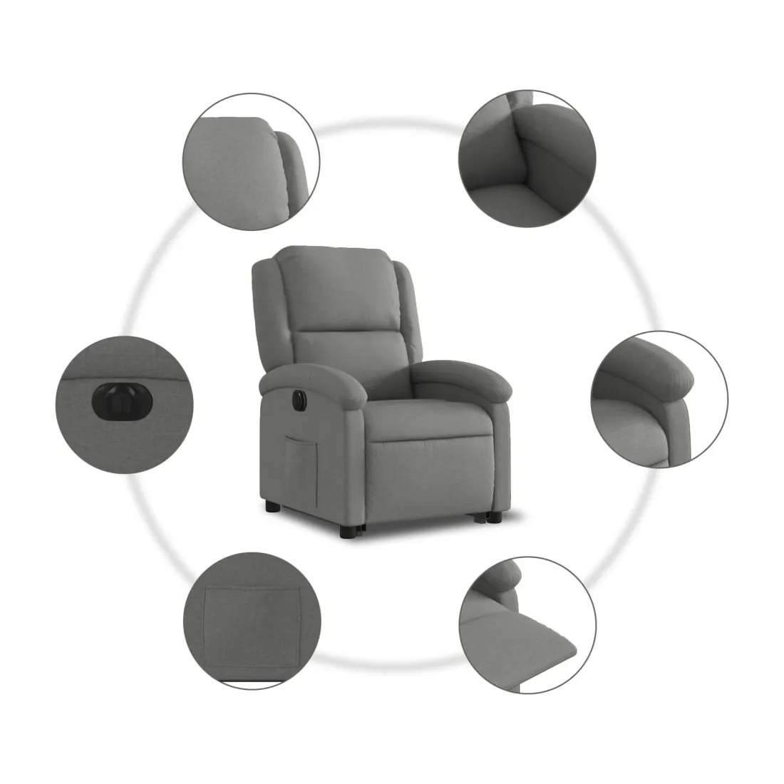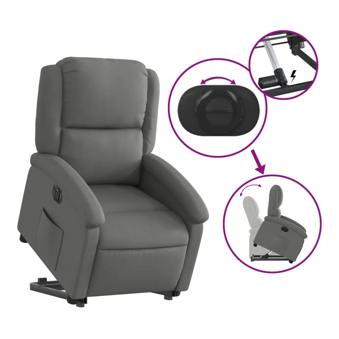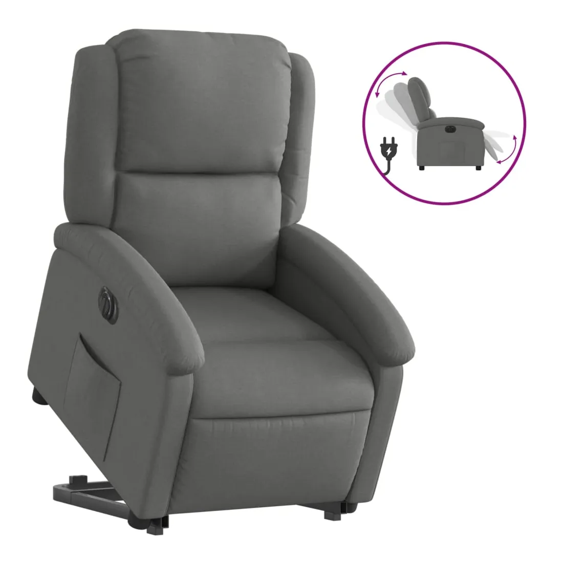 Asseyez-vous et détendez-vous dans ce fauteuil inclinable électrique très confortable ! Fonction de levage électrique : ce fauteuil inclinable pour personnes âgées est équipé d'un moteur électrique pour la fonction de levage. Grâce à la fonction qui pousse toute la chaise vers le haut, vous pouvez facilement vous tenir debout sans stresser votre dos et vos genoux en appuyant simplement sur le bouton.Fonction d'inclinaison électrique : ce fauteuil inclinable est également équipé d'un moteur électrique qui permet de régler automatiquement le repose-pied et le dossier dans n'importe quelle position, selon votre confort, en appuyant simplement sur le bouton situé sur le côté du fauteuil. Cette fonction permet une inclinaison maximale de 135 degrés. En outre, le dossier peut revenir automatiquement à sa position d'origine par une simple pression sur le bouton.Expérience d'assise confortable : le siège, le dossier et les larges accoudoirs bien rembourrés recouverts de tissu procurent une sensation confortable et chaleureuse, vous permettant de vous sentir enveloppé lorsque vous êtes assis. Le tissu présente un aspect simple et épuré et est respirant et durable.Poche latérale pratique : ce fauteuil est doté d'une poche latérale pour vous permettre de garder vos objets essentiels à portée de main.Cadre solide et stable : le cadre en bois et en métal offre une structure solide et une grande stabilité. Ce fauteuil inclinable est confortable et durable.
