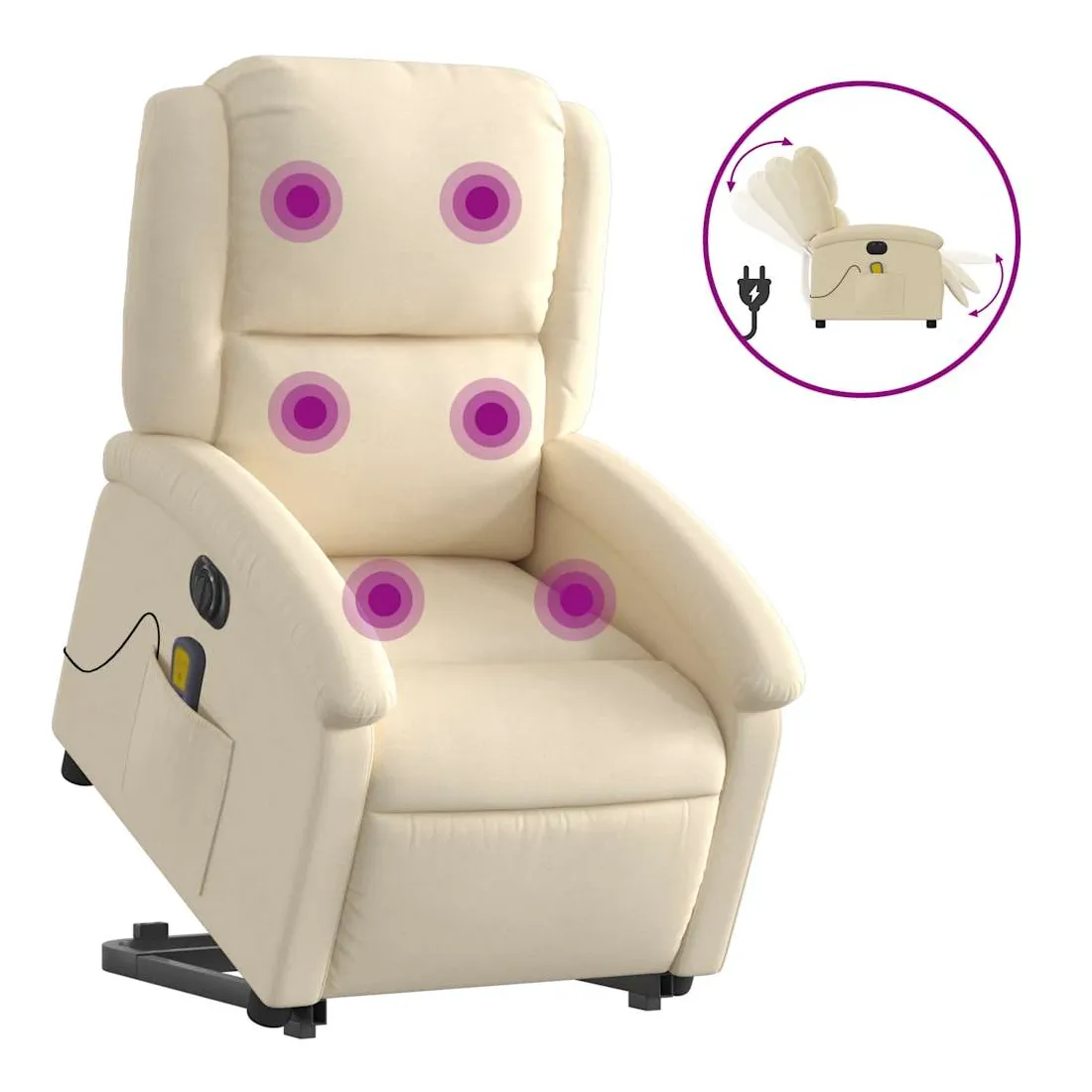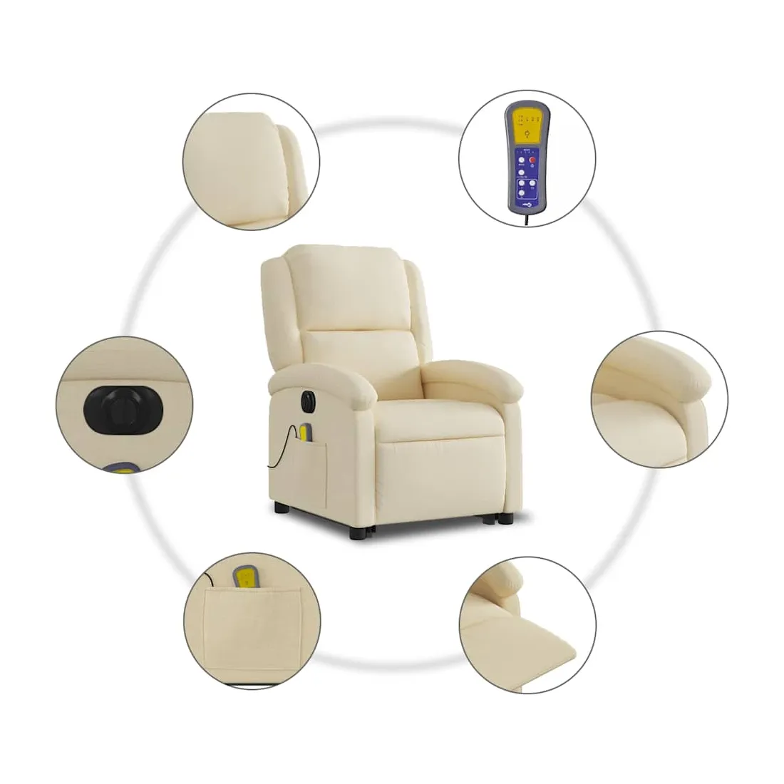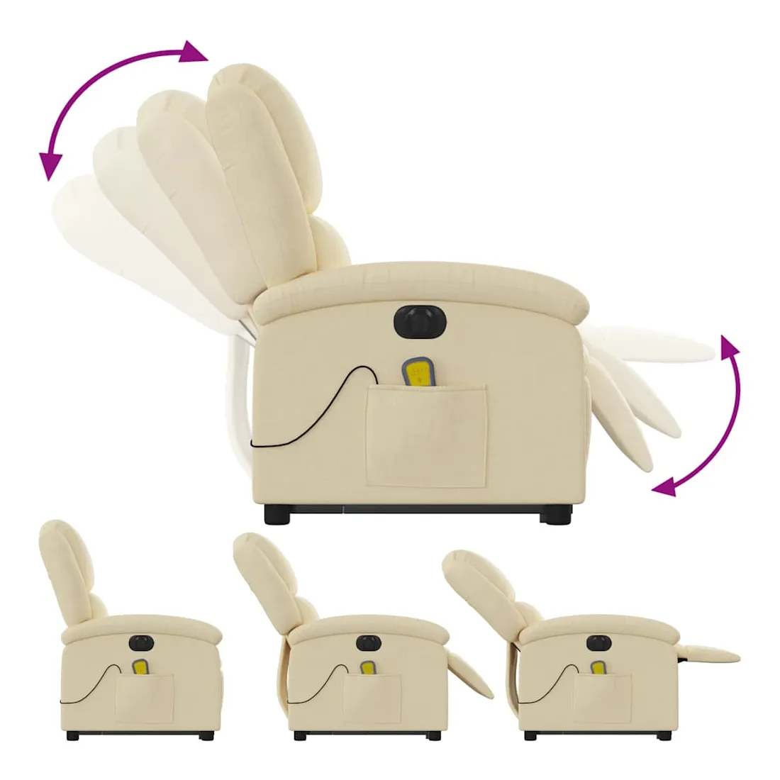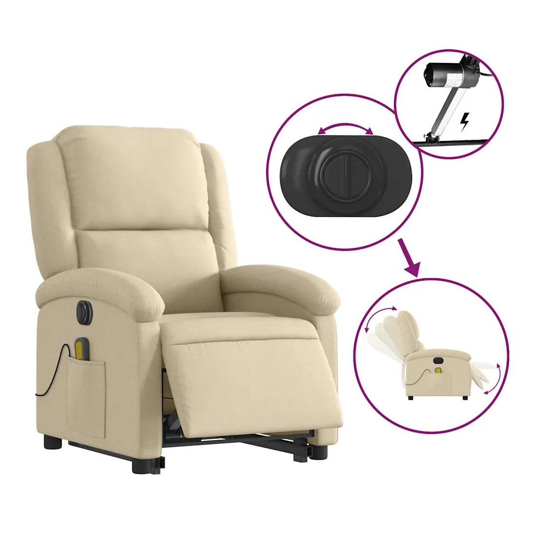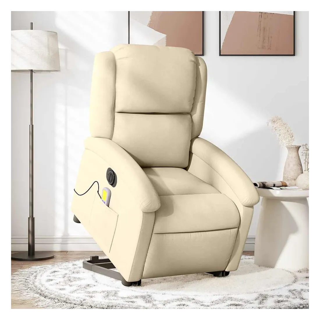 Asseyez-vous et détendez-vous dans ce fauteuil inclinable de massage électrique très confortable ! Fonction de levage électrique : ce fauteuil inclinable pour personnes âgées est équipé d'un moteur électrique pour la fonction de levage. Grâce à la fonction qui pousse toute la chaise vers le haut, vous pouvez facilement vous tenir debout sans stresser votre dos et vos genoux en appuyant simplement sur le bouton.Fonction d'inclinaison électrique : ce fauteuil inclinable est également équipé d'un moteur électrique qui permet de régler automatiquement le repose-pied et le dossier dans n'importe quelle position, selon votre confort, en appuyant simplement sur le bouton situé sur le côté du fauteuil. Cette fonction permet une inclinaison maximale de 135 degrés. En outre, le dossier peut revenir automatiquement à sa position d'origine par une simple pression sur le bouton.Fonction de vibration : les 6 points de massage vous permettent de faire l'expérience d'un massage mieux ciblé. De plus, la télécommande incluse vous permet de choisir différents programmes de massage. La fonction de massage est alimentée par le connecteur USB qui nécessite une source d'alimentation USB certifiée de 5 V (non fournie).Expérience d'assise confortable : le siège, le dossier et les larges accoudoirs bien rembourrés recouverts de tissu procurent une sensation confortable et chaleureuse, vous permettant de vous sentir enveloppé lorsque vous êtes assis. Le tissu présente un aspect simple et épuré et est respirant et durable.Poche latérale pratique : ce fauteuil est doté d'une poche latérale pour ranger votre télécommande ou garder vos objets essentiels à portée de main.Cadre solide et stable : le cadre en bois et en métal offre une structure solide et une grande stabilité. Ce fauteuil inclinable est confortable et durable.