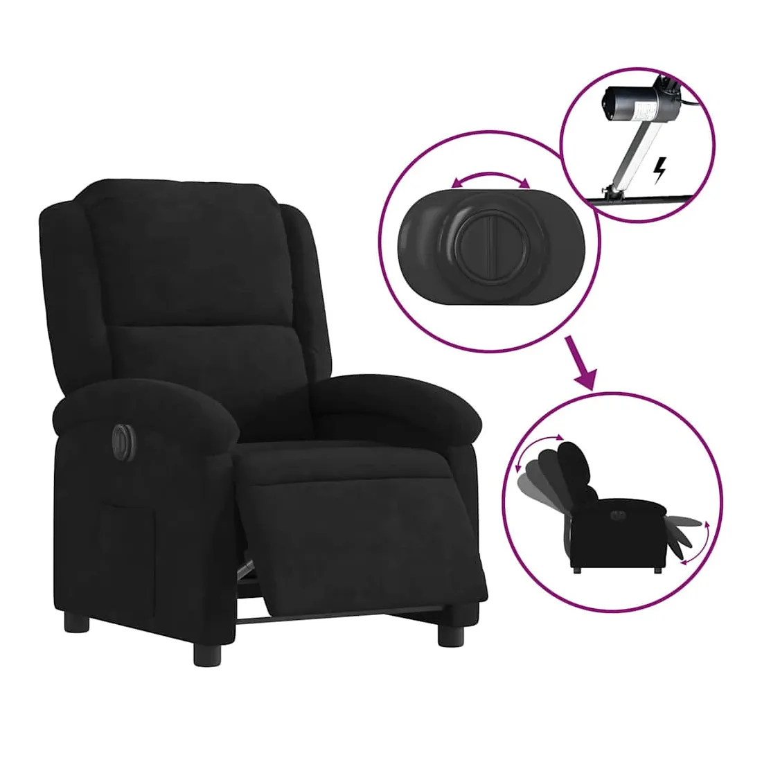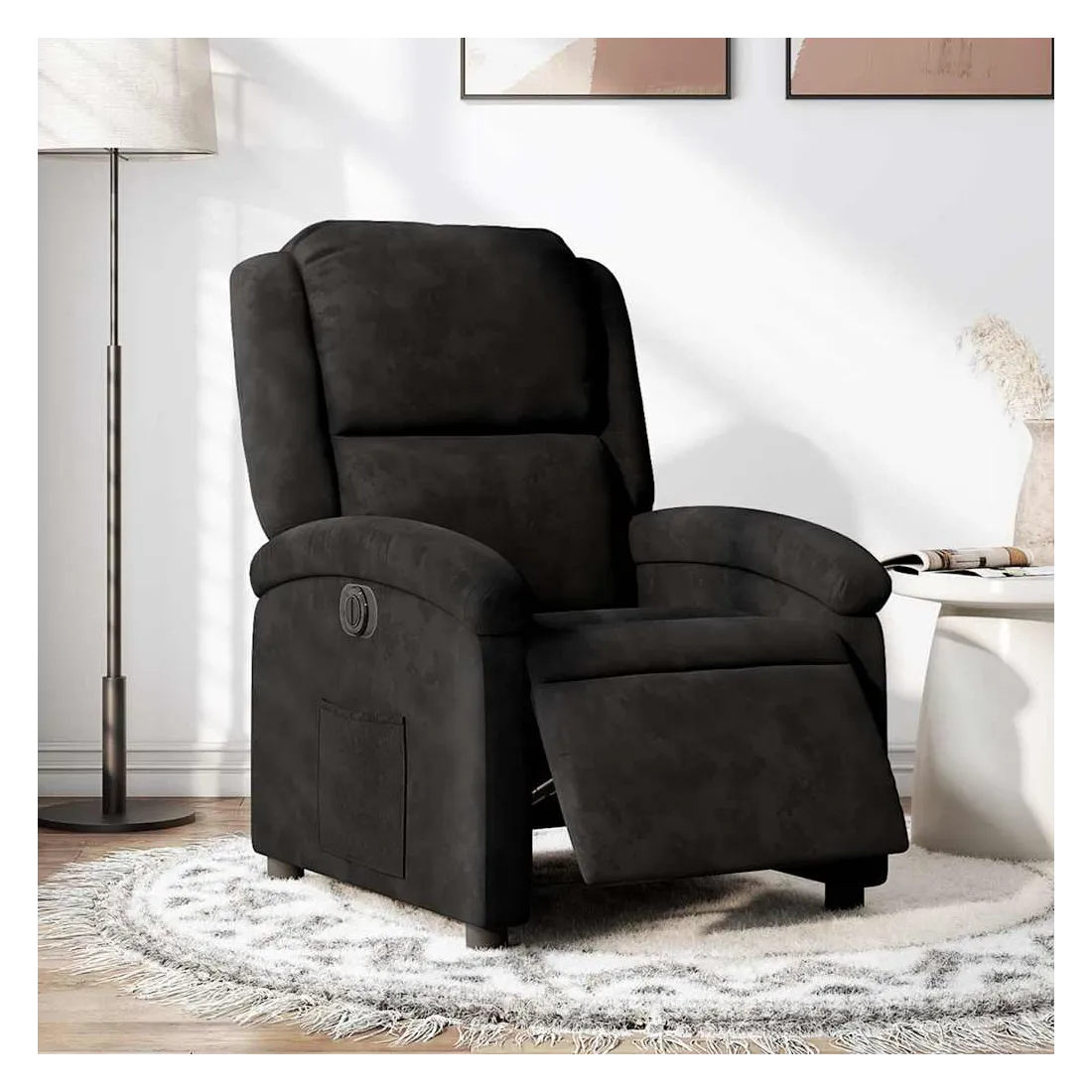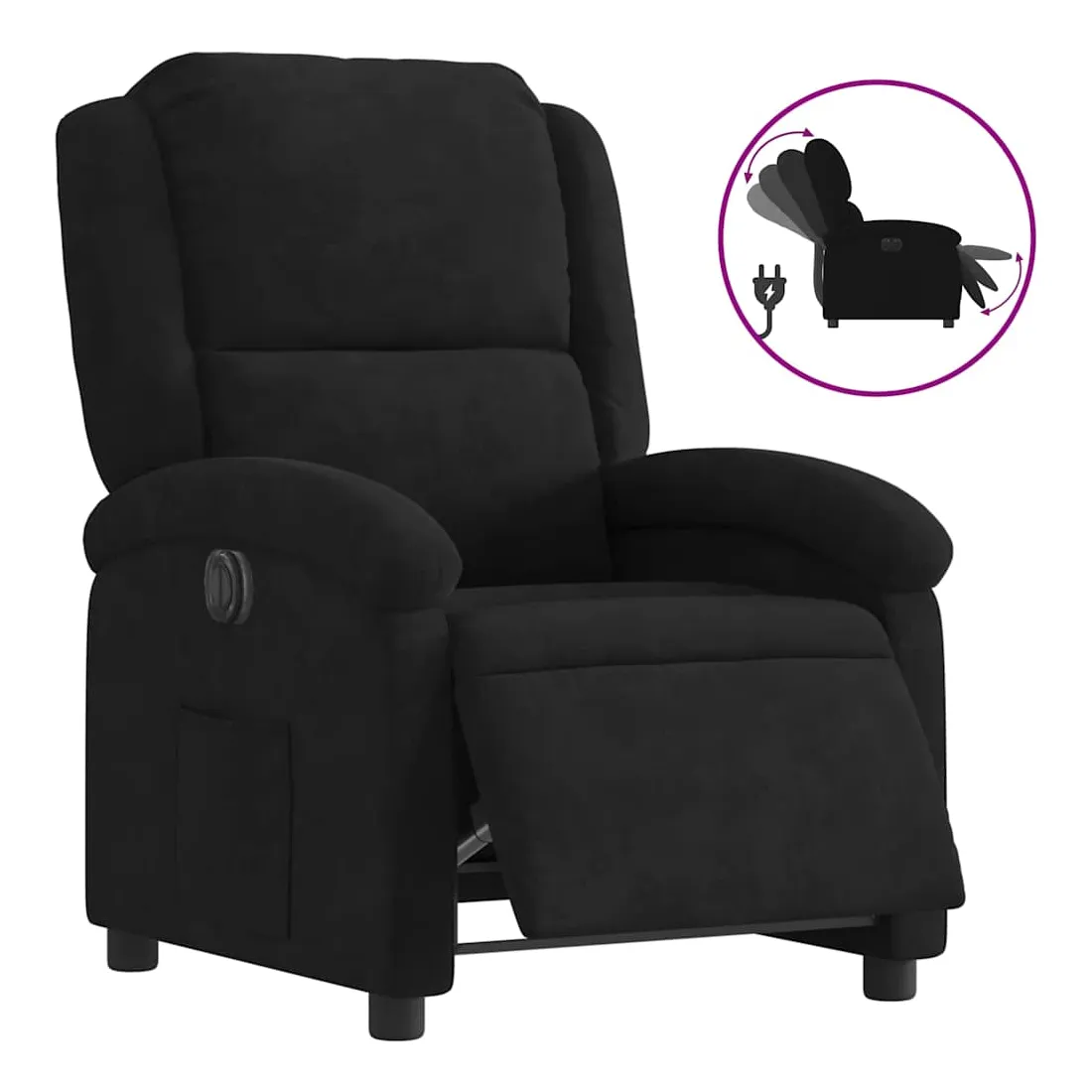 Asseyez-vous et détendez-vous dans ce fauteuil inclinable électrique très confortable ! Fonction d'inclinaison électrique : ce fauteuil inclinable est équipé d'un moteur électrique qui permet de régler automatiquement le repose-pied et le dossier dans n'importe quelle position, selon votre confort, en appuyant simplement sur le bouton situé sur le côté du fauteuil. Cette fonction permet une inclinaison maximale de 135 degrés. En outre, le dossier peut revenir automatiquement à sa position d'origine par une simple pression sur le bouton.Expérience d'assise confortable : le siège, le dossier et les larges accoudoirs rembourrés épais recouverts de velours procurent une sensation confortable et chaleureuse, vous faisant vous sentir enlacé lorsque vous êtes assis. Le velours est un tissu doux et confortable qui est agréable sur la peau.Poche latérale pratique : ce fauteuil est doté d'une poche latérale pour vous permettre de garder vos objets essentiels à portée de main.Cadre solide et stable : le cadre en bois et en métal offre une structure solide et une grande stabilité. Ce fauteuil inclinable est confortable et durable.