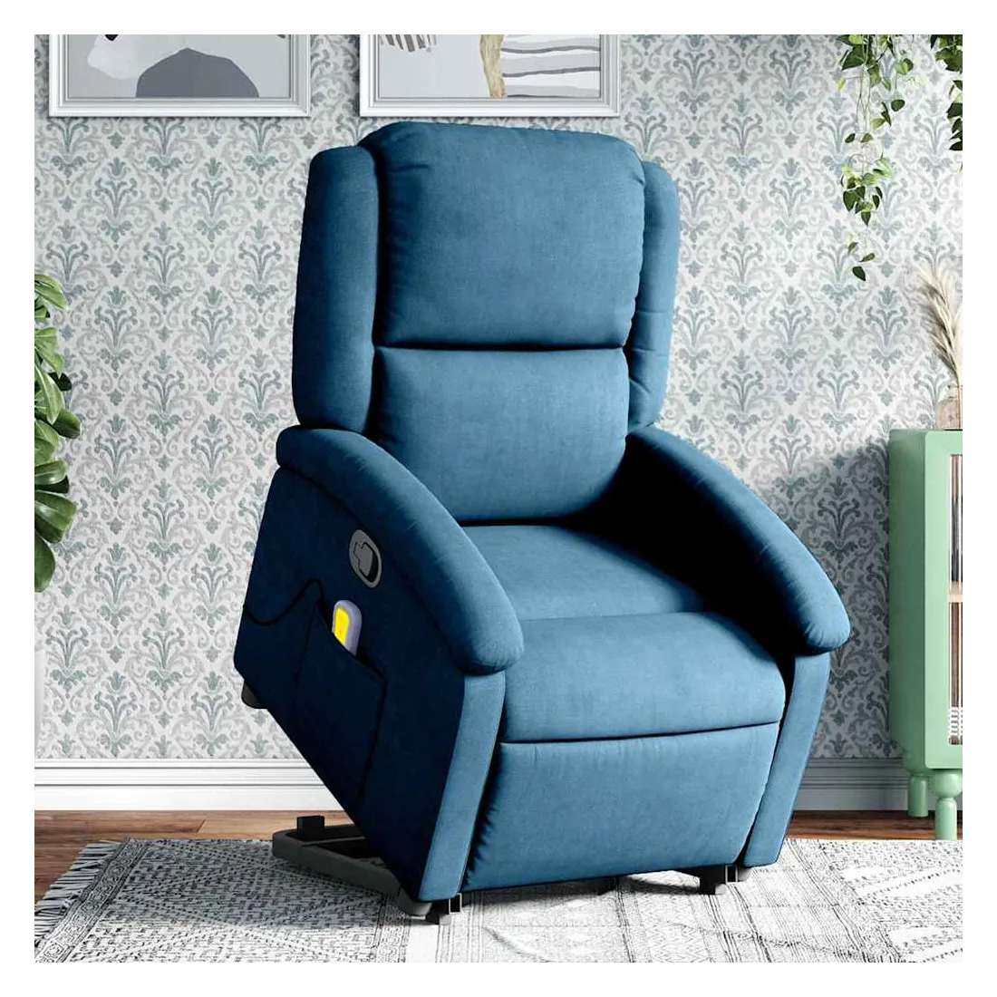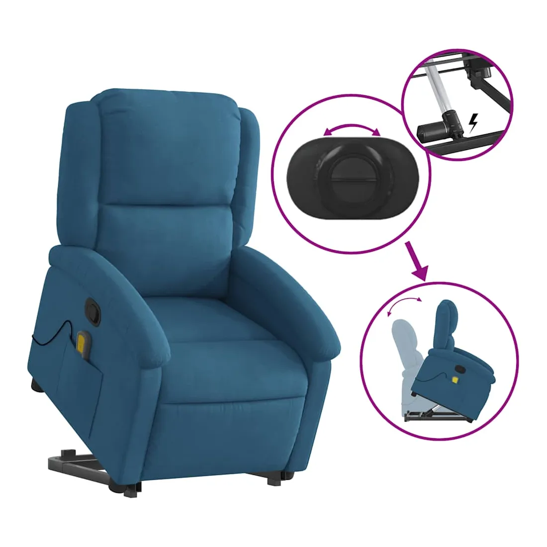 Asseyez-vous et détendez-vous dans ce fauteuil inclinable de massage très confortable ! Fonction de levage électrique : ce fauteuil inclinable pour personnes âgées est équipé d'un moteur électrique pour la fonction de levage. Grâce à la fonction qui pousse toute la chaise vers le haut, vous pouvez facilement vous tenir debout sans stresser votre dos et vos genoux en appuyant simplement sur le bouton.Fonction d'inclinaison manuelle : ce fauteuil inclinable est doté d'une poignée du côté droit. Vous pouvez régler manuellement le repose-pieds et le dossier dans n'importe quelle position selon votre confort en tirant simplement sur la poignée. Cette fonction permet une inclinaison maximale de 135 degrés. De plus, le dossier peut revenir rapidement à sa position d'origine en tirant simplement sur la poignée.Fonction de vibration : les 6 points de massage vous permettent de faire l'expérience d'un massage mieux ciblé. De plus, la télécommande incluse vous permet de choisir différents programmes de massage. La fonction de massage est alimentée par le connecteur USB qui nécessite une source d'alimentation USB certifiée de 5 V (non fournie).Expérience d'assise confortable : le siège, le dossier et les larges accoudoirs rembourrés épais recouverts de velours procurent une sensation confortable et chaleureuse, vous faisant vous sentir enlacé lorsque vous êtes assis. Le velours est un tissu doux et confortable qui est agréable sur la peau.Poche latérale pratique : ce fauteuil est doté d'une poche latérale pour ranger votre télécommande ou garder vos objets essentiels à portée de main.Cadre solide et stable : le cadre en bois et en métal offre une structure solide et une grande stabilité. Ce fauteuil inclinable est confortable et durable.