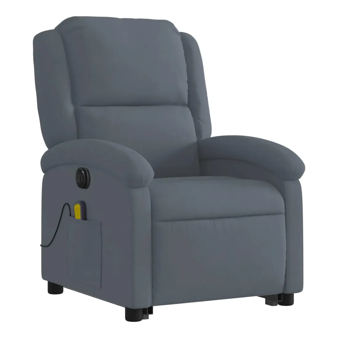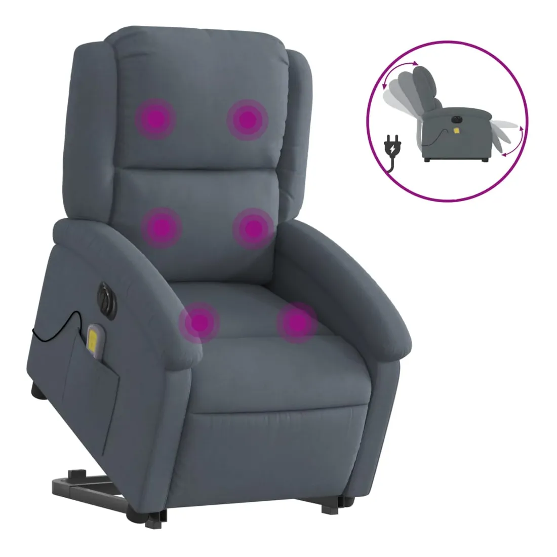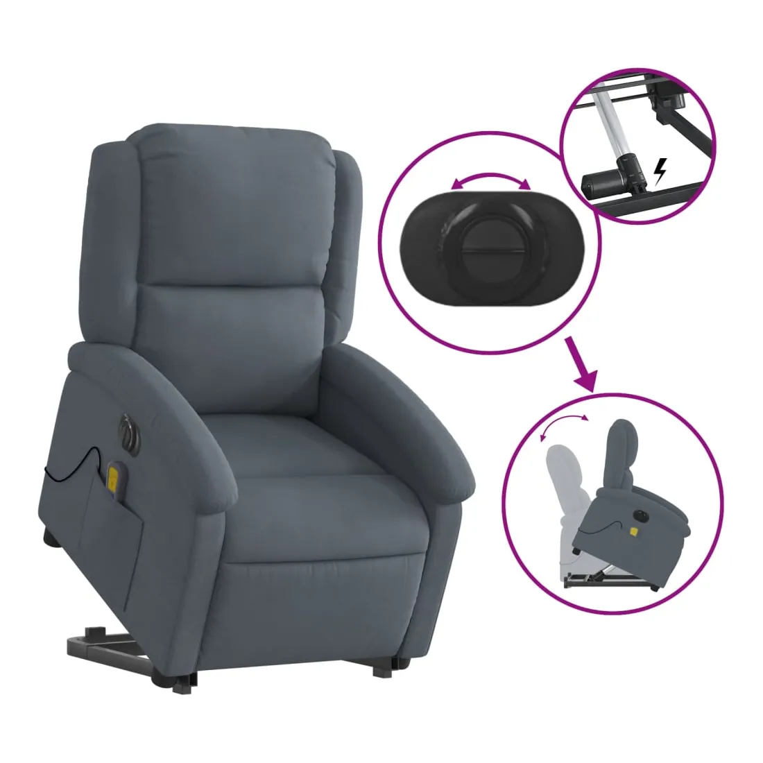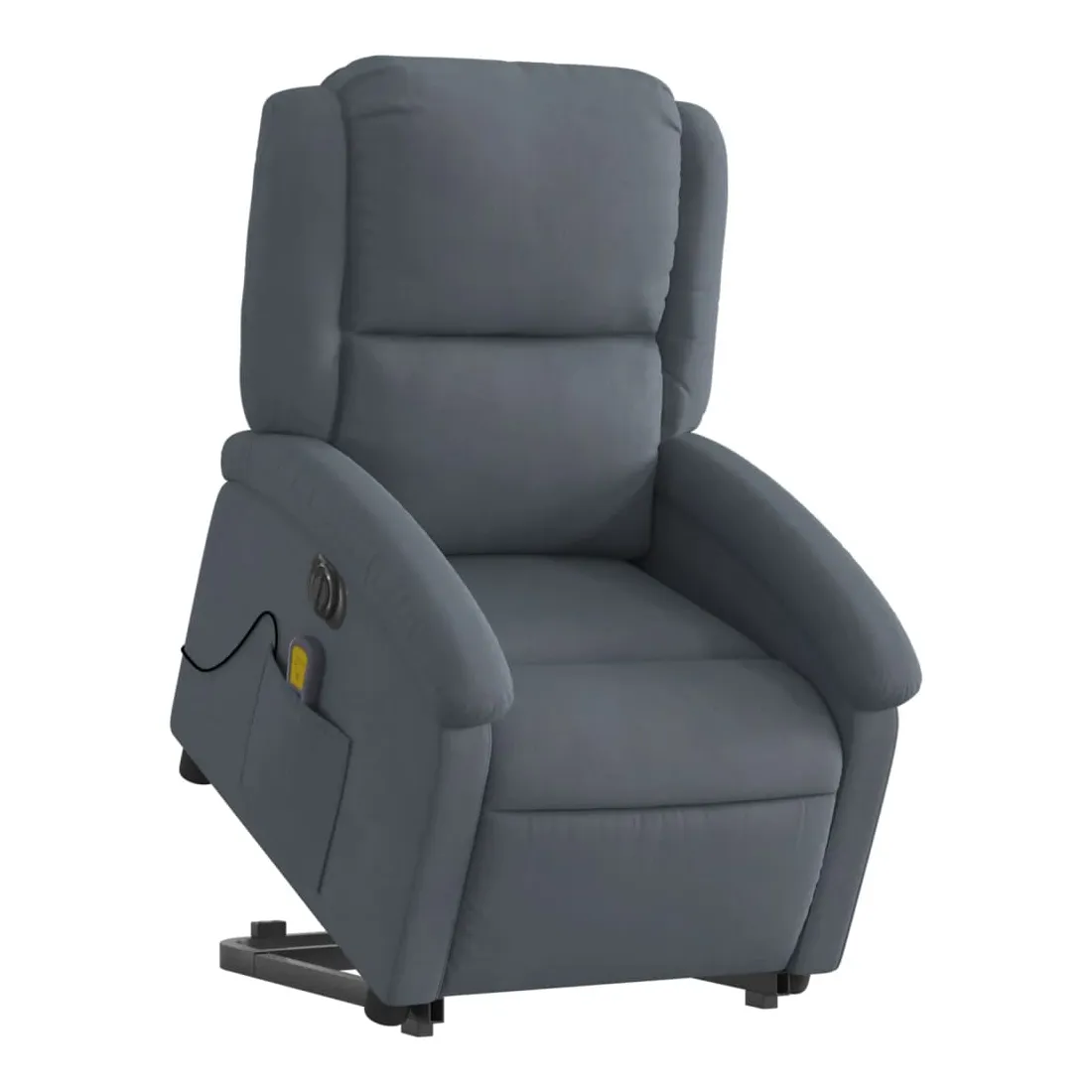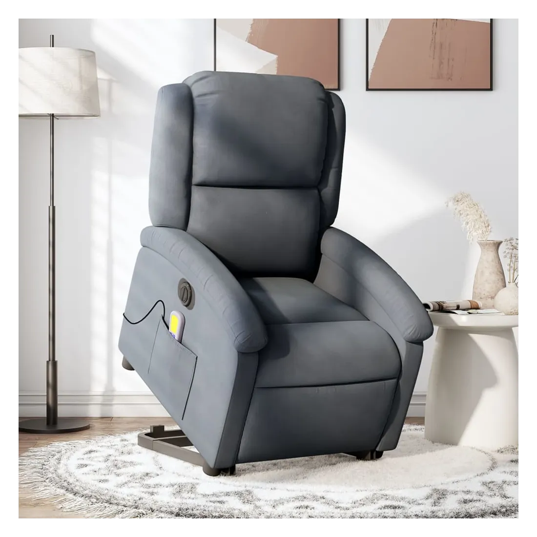 Asseyez-vous et détendez-vous dans ce fauteuil inclinable de massage électrique très confortable ! Fonction de levage électrique : ce fauteuil inclinable pour personnes âgées est équipé d'un moteur électrique pour la fonction de levage. Grâce à la fonction qui pousse toute la chaise vers le haut, vous pouvez facilement vous tenir debout sans stresser votre dos et vos genoux en appuyant simplement sur le bouton.Fonction d'inclinaison électrique : ce fauteuil inclinable est également équipé d'un moteur électrique qui permet de régler automatiquement le repose-pied et le dossier dans n'importe quelle position, selon votre confort, en appuyant simplement sur le bouton situé sur le côté du fauteuil. Cette fonction permet une inclinaison maximale de 135 degrés. En outre, le dossier peut revenir automatiquement à sa position d'origine par une simple pression sur le bouton.Fonction de vibration : les 6 points de massage vous permettent de faire l'expérience d'un massage mieux ciblé. De plus, la télécommande incluse vous permet de choisir différents programmes de massage. La fonction de massage est alimentée par le connecteur USB qui nécessite une source d'alimentation USB certifiée de 5 V (non fournie).Expérience d'assise confortable : le siège, le dossier et les larges accoudoirs rembourrés épais recouverts de velours procurent une sensation confortable et chaleureuse, vous faisant vous sentir enlacé lorsque vous êtes assis. Le velours est un tissu doux et confortable qui est agréable sur la peau.Poche latérale pratique : ce fauteuil est doté d'une poche latérale pour ranger votre télécommande ou garder vos objets essentiels à portée de main.Cadre solide et stable : le cadre en bois et en métal offre une structure solide et une grande stabilité. Ce fauteuil inclinable est confortable et durable.
