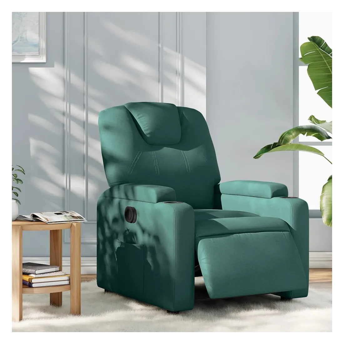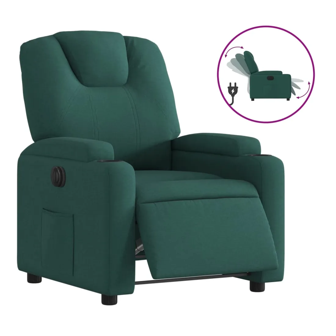 Asseyez-vous et détendez-vous dans ce fauteuil inclinable électrique très confortable ! Fonction d'inclinaison électrique : ce fauteuil inclinable est équipé d'un moteur électrique qui permet de régler automatiquement le repose-pied et le dossier dans n'importe quelle position, selon votre confort, en appuyant simplement sur le bouton situé sur le côté du fauteuil. Cette fonction permet une inclinaison maximale de 135 degrés. En outre, le dossier peut revenir automatiquement à sa position d'origine par une simple pression sur le bouton.Expérience d'assise confortable : le siège, le dossier et les larges accoudoirs bien rembourrés recouverts de tissu procurent une sensation confortable et chaleureuse, vous permettant de vous sentir enveloppé lorsque vous êtes assis. Le tissu présente un aspect simple et épuré et est respirant et durable.Porte-gobelets et poche latérale pratiques : ce fauteuil dispose de deux porte-gobelets pratiques pour vos boissons et d'une poche latérale pour garder vos objets essentiels à portée de main.Cadre solide et stable : le cadre en bois et en métal offre une structure solide et une grande stabilité. Ce fauteuil inclinable est confortable et durable.
