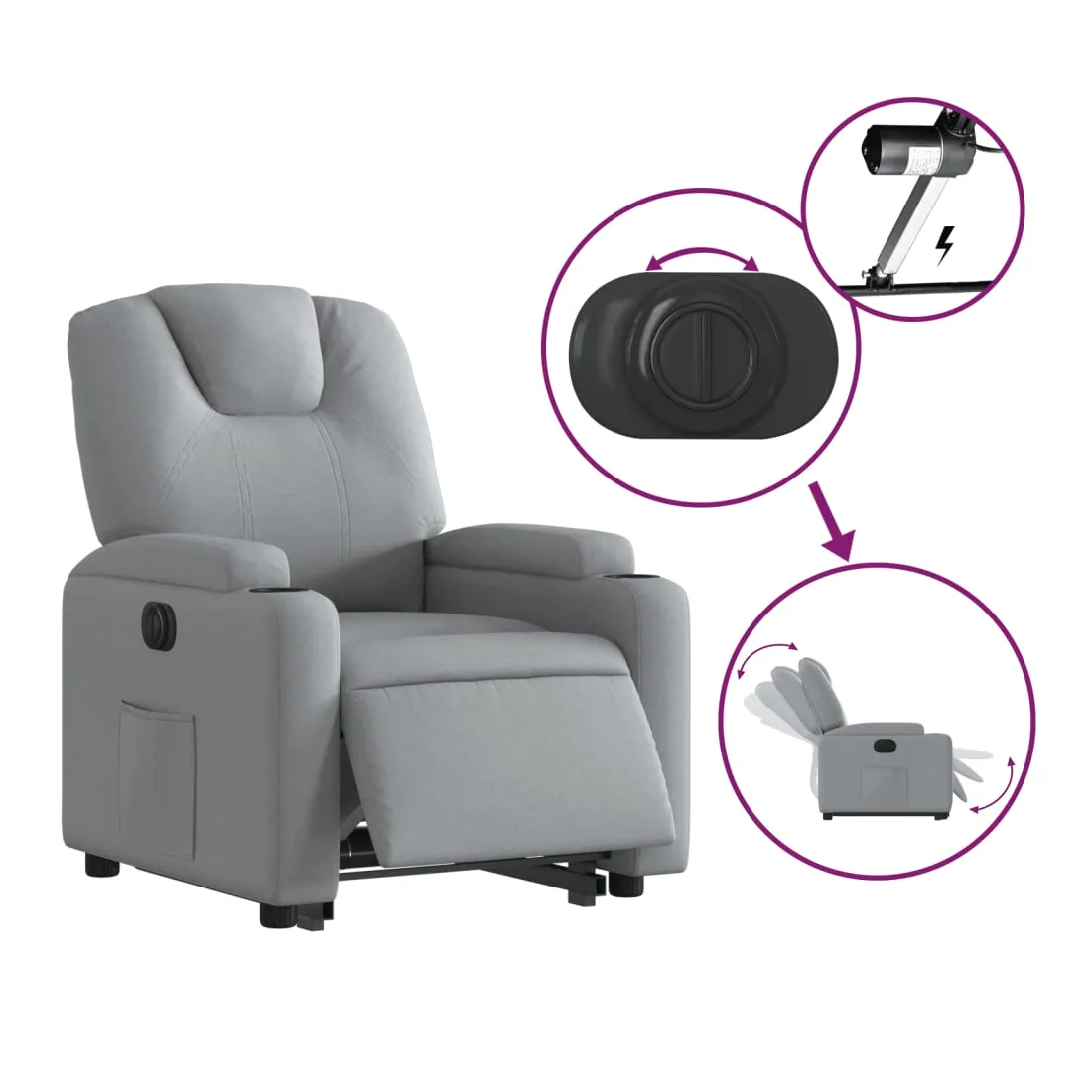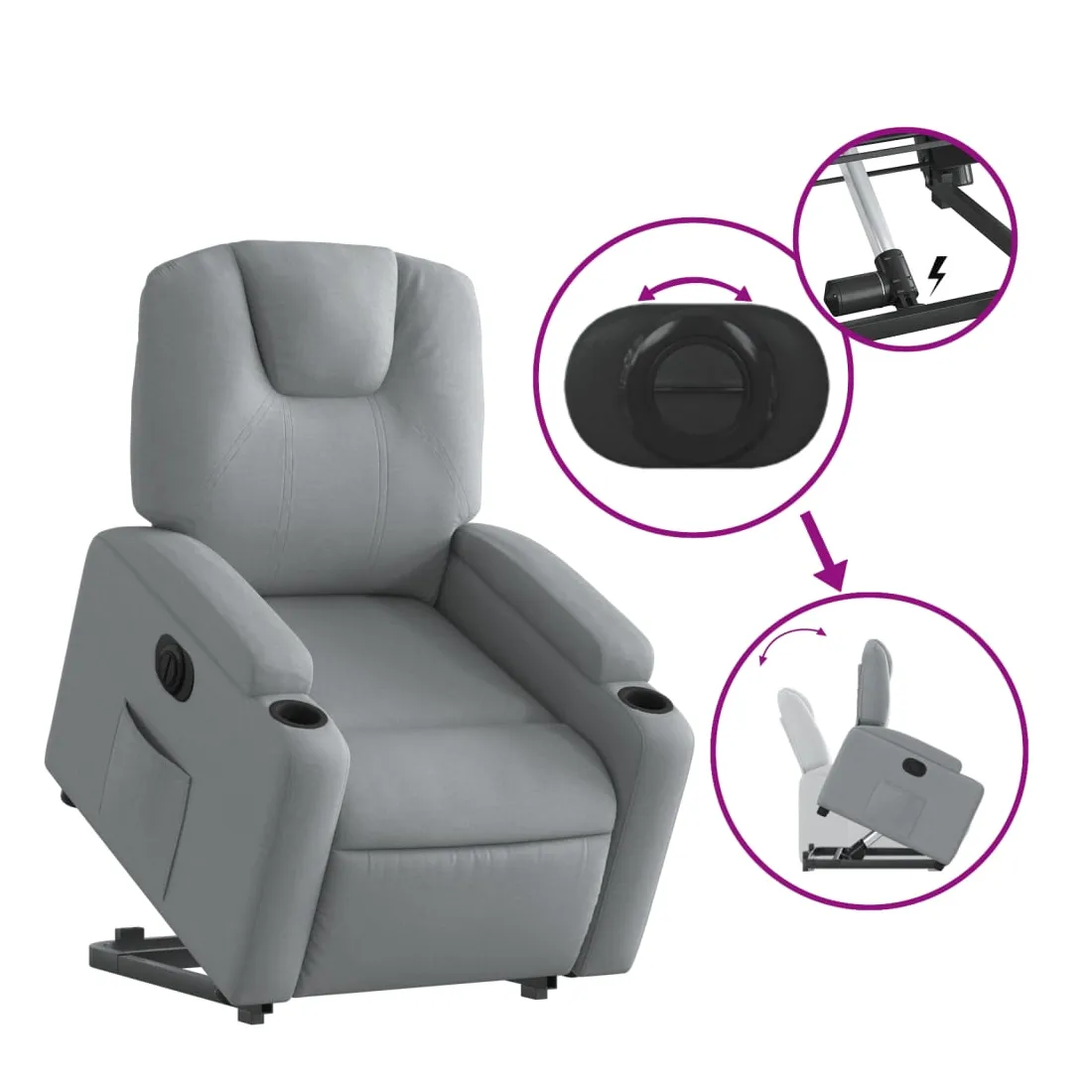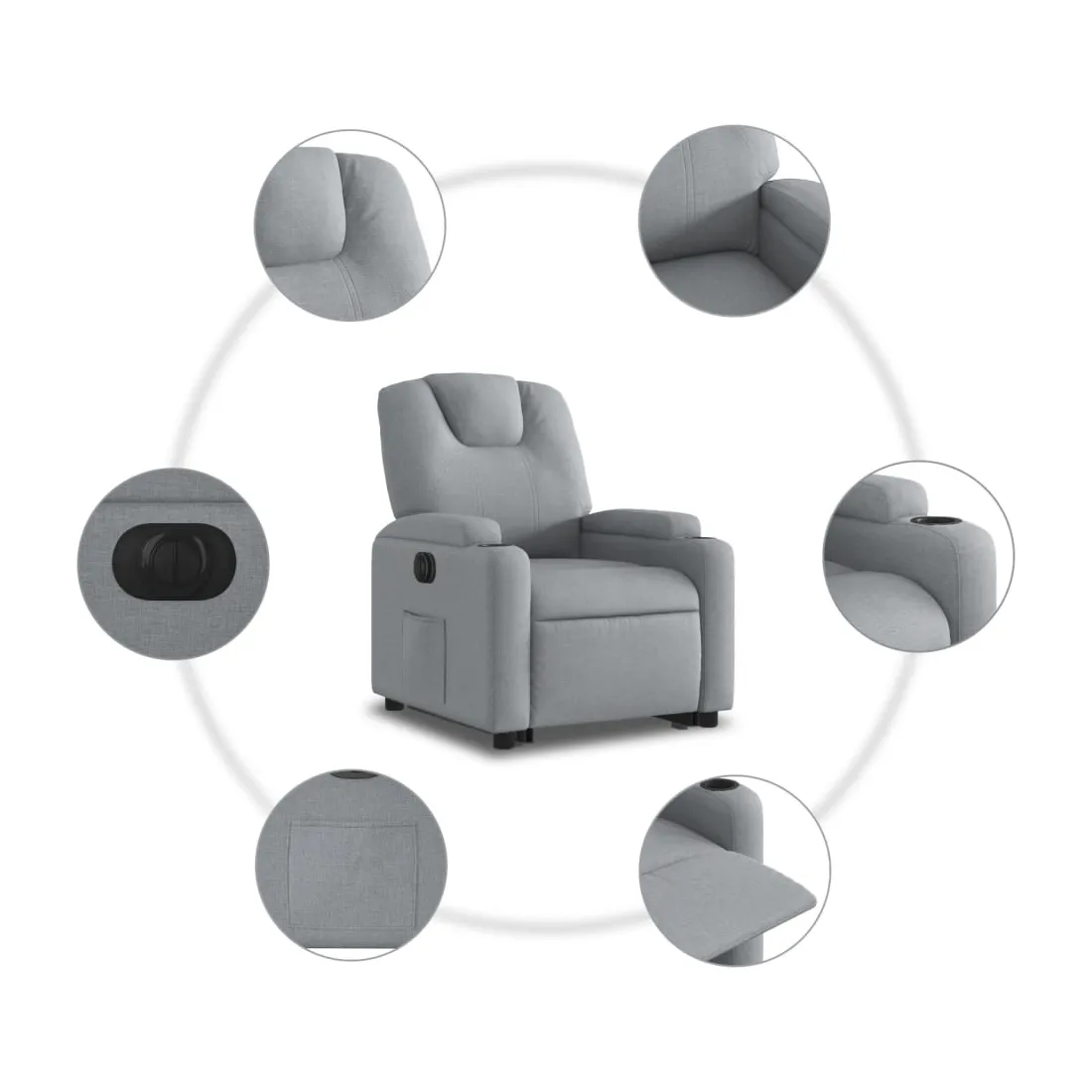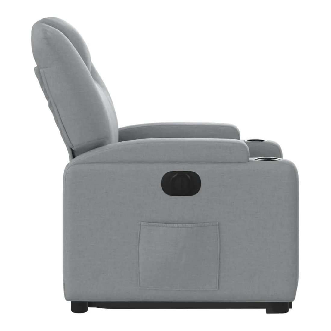 Asseyez-vous et détendez-vous dans ce fauteuil inclinable électrique très confortable ! Fonction de levage électrique : ce fauteuil inclinable pour personnes âgées est équipé d'un moteur électrique pour la fonction de levage. Grâce à la fonction qui pousse toute la chaise vers le haut, vous pouvez facilement vous tenir debout sans stresser votre dos et vos genoux en appuyant simplement sur le bouton.Fonction d'inclinaison électrique : ce fauteuil inclinable est également équipé d'un moteur électrique qui permet de régler automatiquement le repose-pied et le dossier dans n'importe quelle position, selon votre confort, en appuyant simplement sur le bouton situé sur le côté du fauteuil. Cette fonction permet une inclinaison maximale de 135 degrés. En outre, le dossier peut revenir automatiquement à sa position d'origine par une simple pression sur le bouton.Expérience d'assise confortable : le siège, le dossier et les larges accoudoirs bien rembourrés recouverts de tissu procurent une sensation confortable et chaleureuse, vous permettant de vous sentir enveloppé lorsque vous êtes assis. Le tissu présente un aspect simple et épuré et est respirant et durable.Porte-gobelets et poche latérale pratiques : ce fauteuil dispose de deux porte-gobelets pratiques pour vos boissons et d'une poche latérale pour garder vos objets essentiels à portée de main.Cadre solide et stable : le cadre en bois et en métal offre une structure solide et une grande stabilité. Ce fauteuil inclinable est confortable et durable.