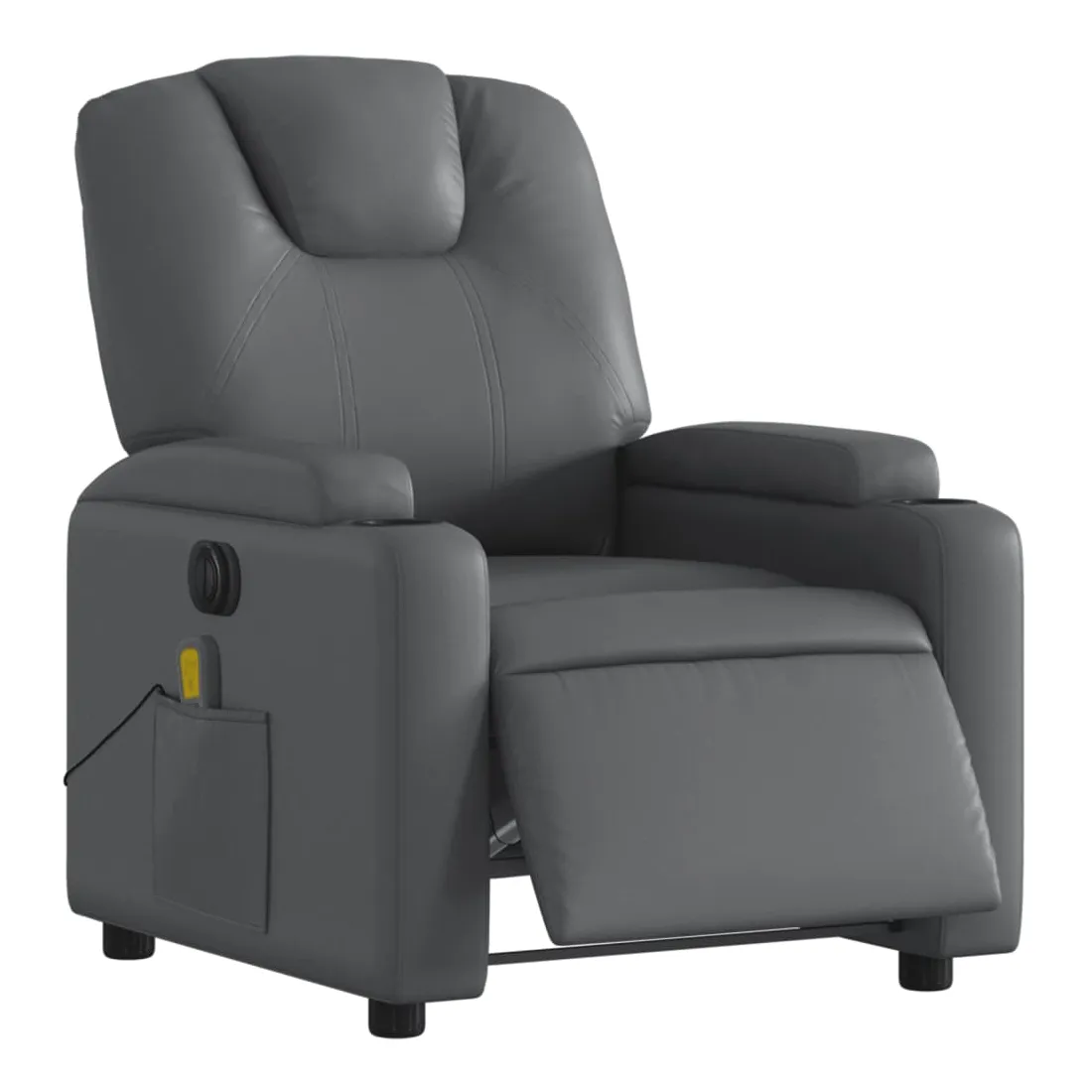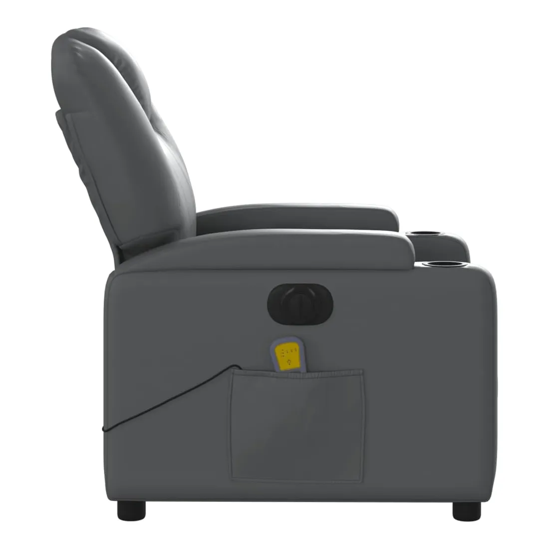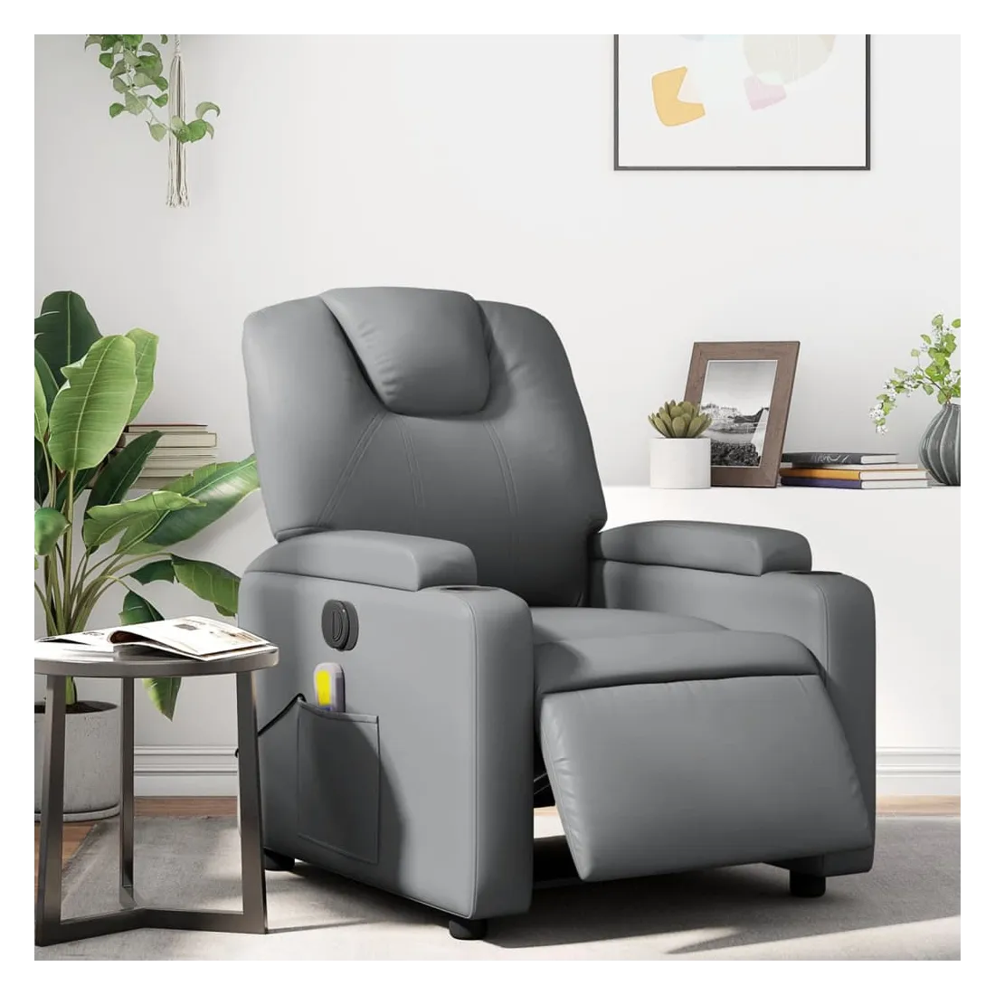 Asseyez-vous et détendez-vous dans ce fauteuil inclinable de massage électrique très confortable ! Fonction d'inclinaison électrique : ce fauteuil inclinable est équipé d'un moteur électrique qui permet de régler automatiquement le repose-pied et le dossier dans n'importe quelle position, selon votre confort, en appuyant simplement sur le bouton situé sur le côté du fauteuil. Cette fonction permet une inclinaison maximale de 135 degrés. En outre, le dossier peut revenir automatiquement à sa position d'origine par une simple pression sur le bouton.Fonction de vibration : les 6 points de massage vous permettent de faire l'expérience d'un massage mieux ciblé. De plus, la télécommande incluse vous permet de choisir différents programmes de massage. La fonction de massage est alimentée par le connecteur USB qui nécessite une source d'alimentation USB certifiée de 5 V (non fournie).Expérience de siège confortable : le siège, le dossier et les larges accoudoirs rembourrés épais recouverts de similicuir procurent une sensation confortable, vous faisant vous sentir enlacé lorsque vous êtes assis. Le similicuir est un matériau très résistant. Il est résistant aux taches, ce qui le rend facile à nettoyer avec un chiffon humide. La surface lisse donne également un aspect luxueux et la beauté du cuir véritable.Porte-gobelets et poche latérale pratiques : ce fauteuil dispose de deux porte-gobelets pratiques pour vos boissons et d'une poche latérale pour votre télécommande ou pour garder vos objets essentiels à portée de main.Cadre solide et stable : le cadre en bois et en métal offre une structure solide et une grande stabilité. Ce fauteuil inclinable est confortable et durable.